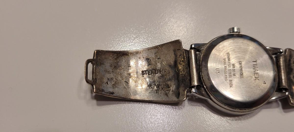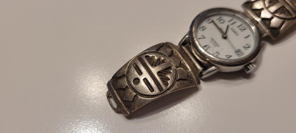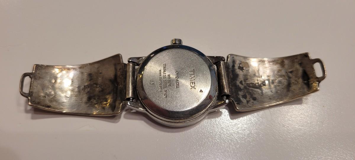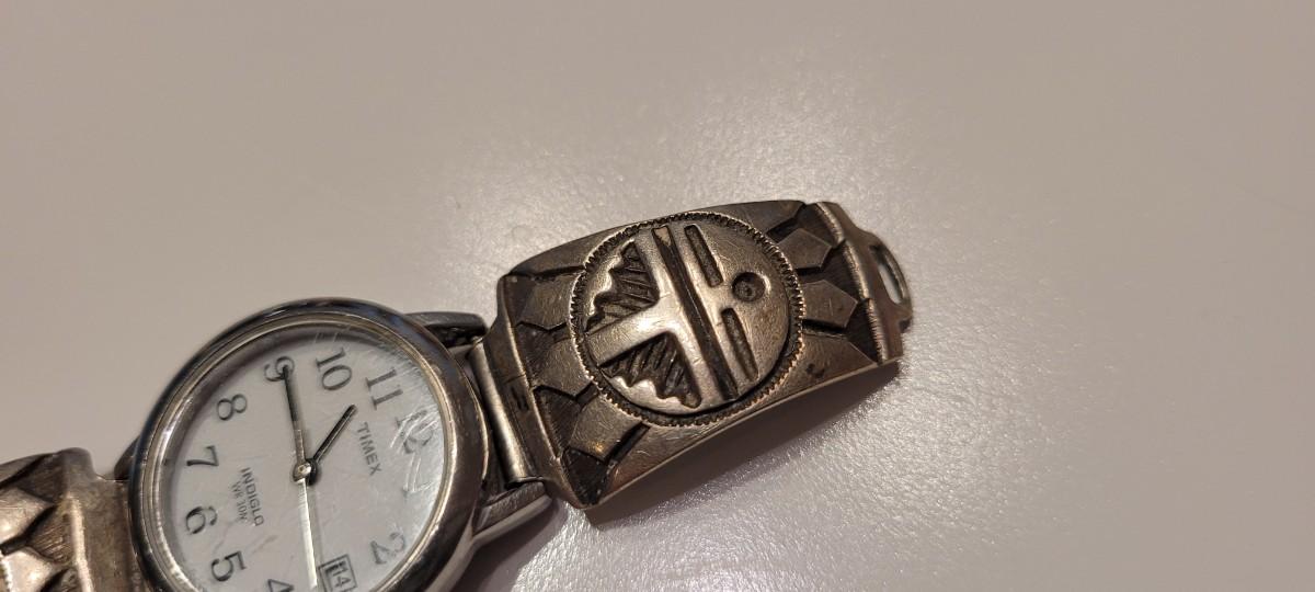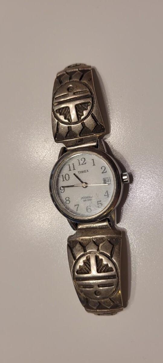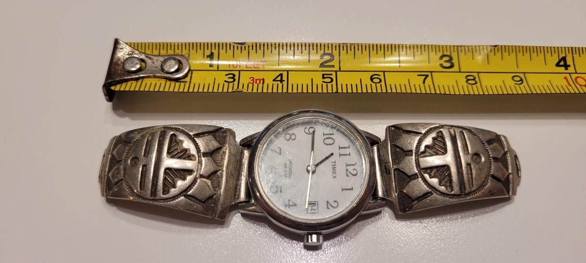 Timex watch with Sterling silver watch band accent. The watch has not been tested and will need a fresh battery.