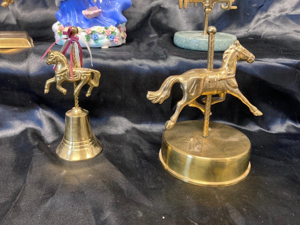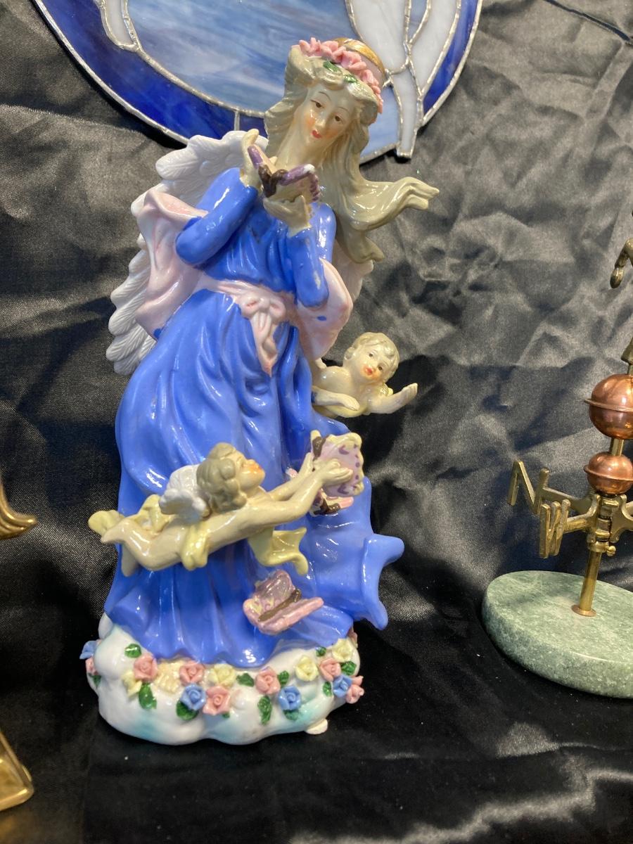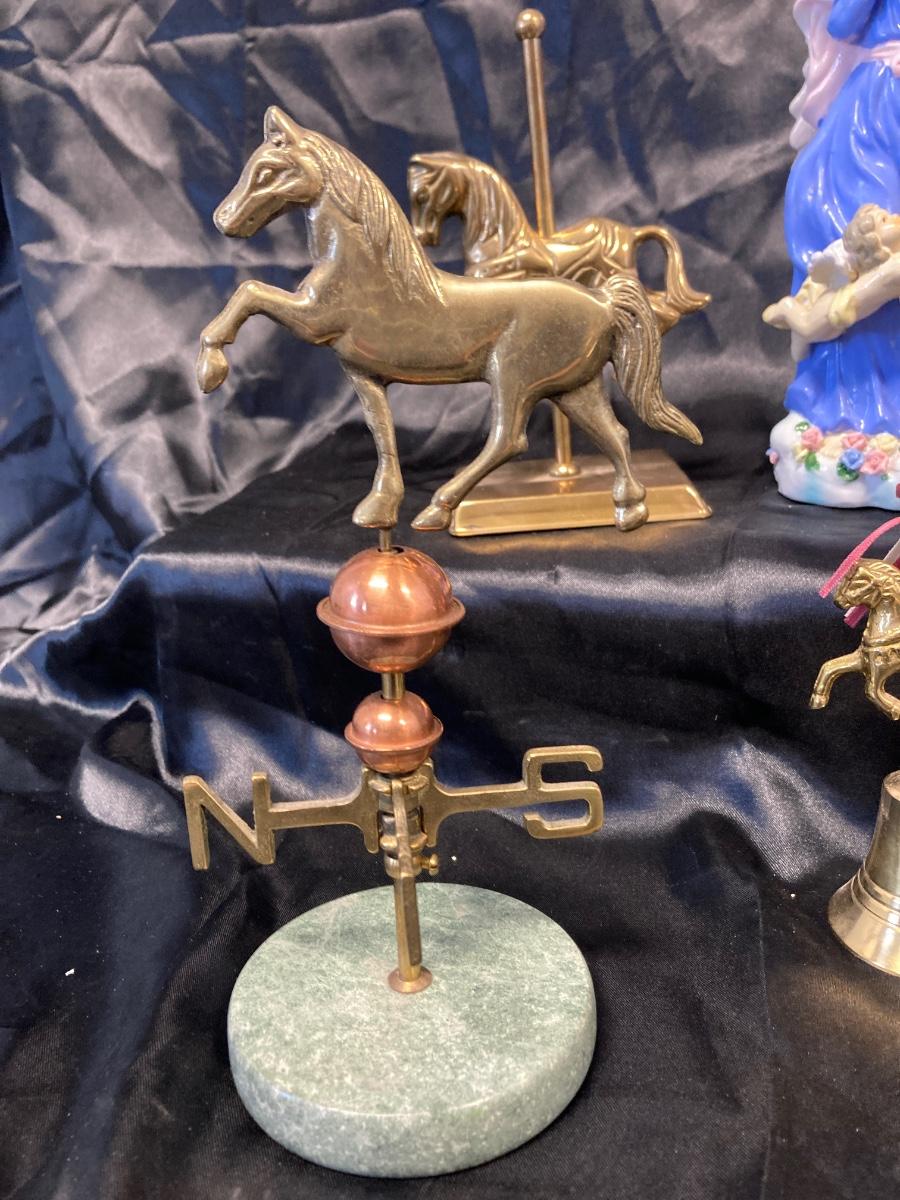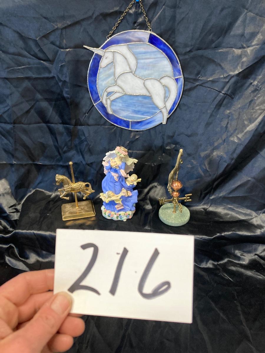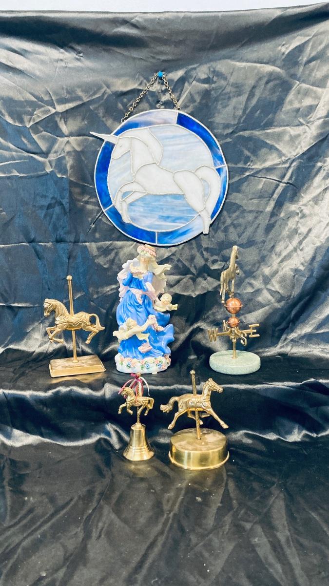 COLLECTIBLE BRASS CAROUSEL  HORSE'S, WEATHER VANE, CERAMIC ANGEL, & STAINED GLASS UNICORN