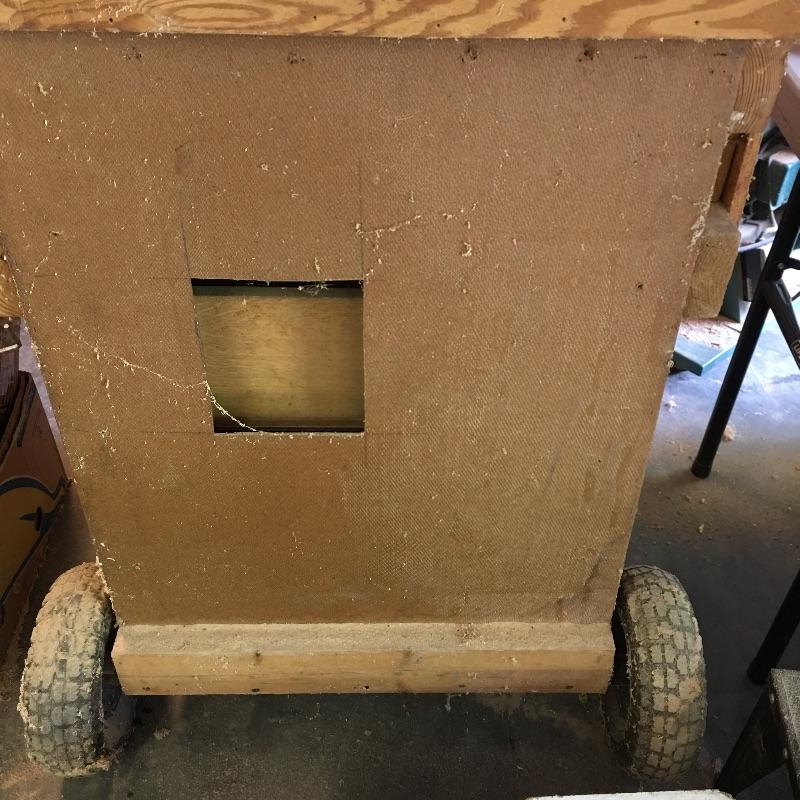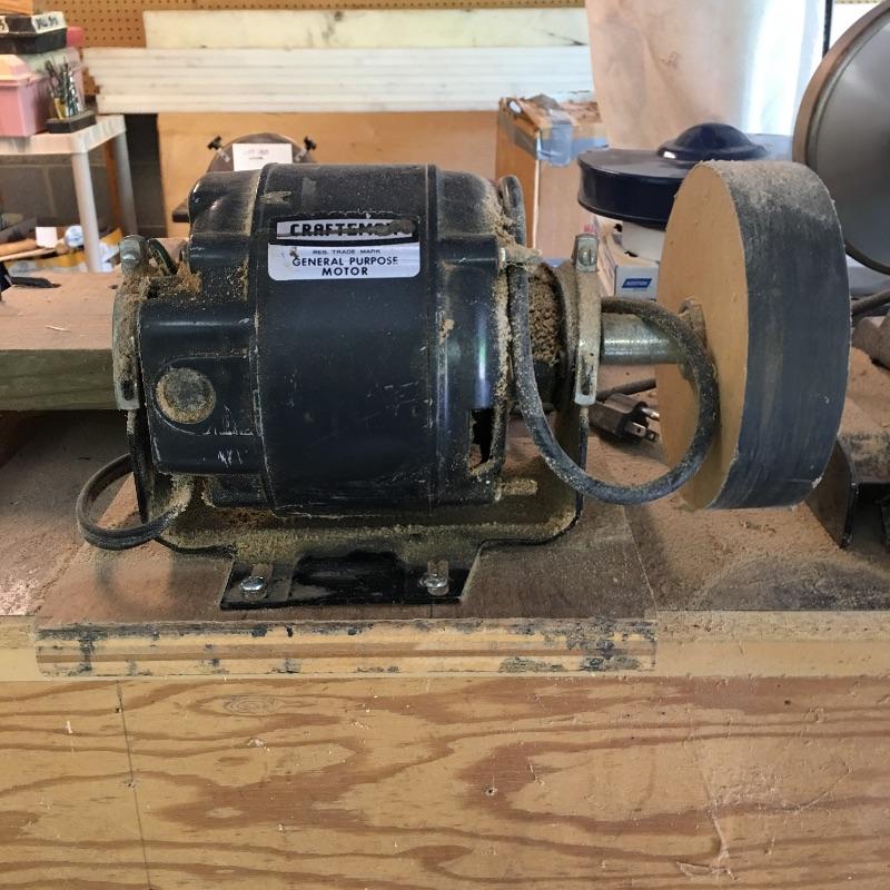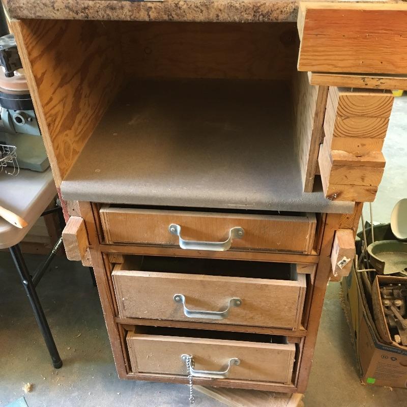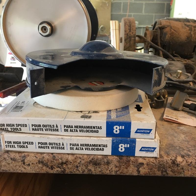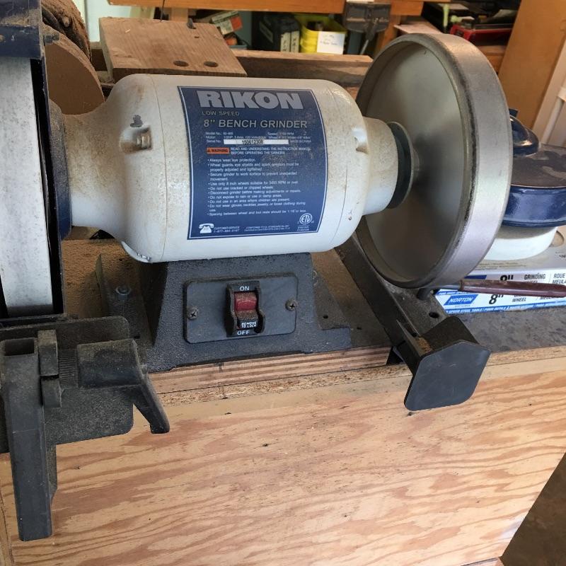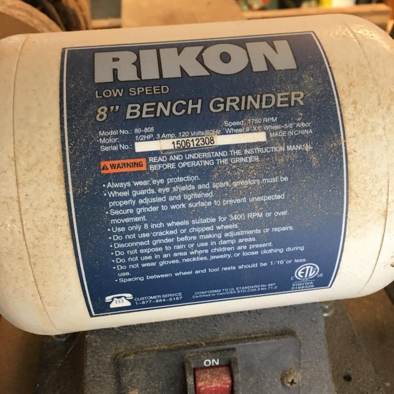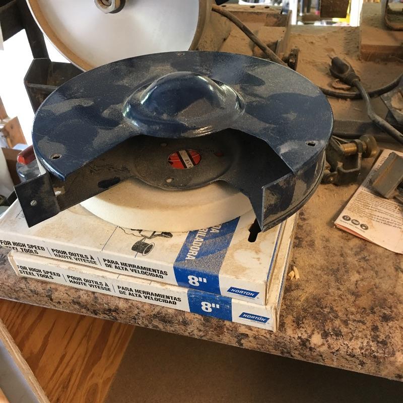 Cabinet with wheels and two grinders mounted to cabinet. Cabinet including grinders measures 28.5” x 33” x 64”.
