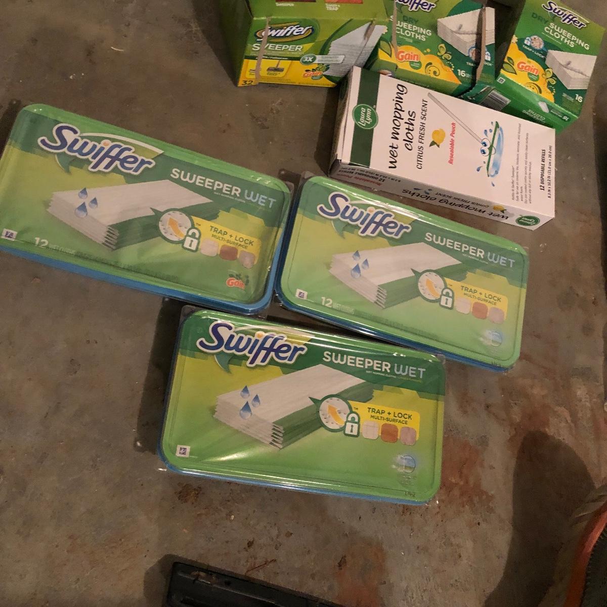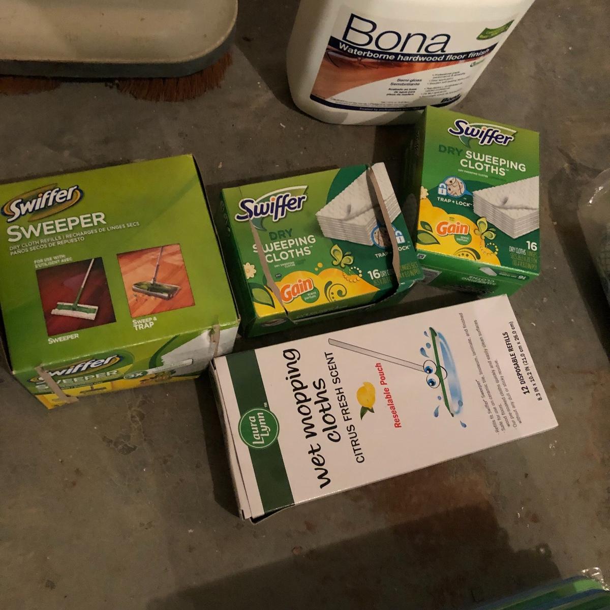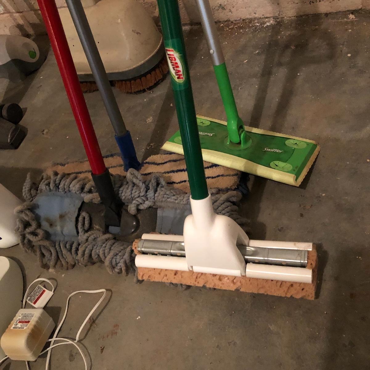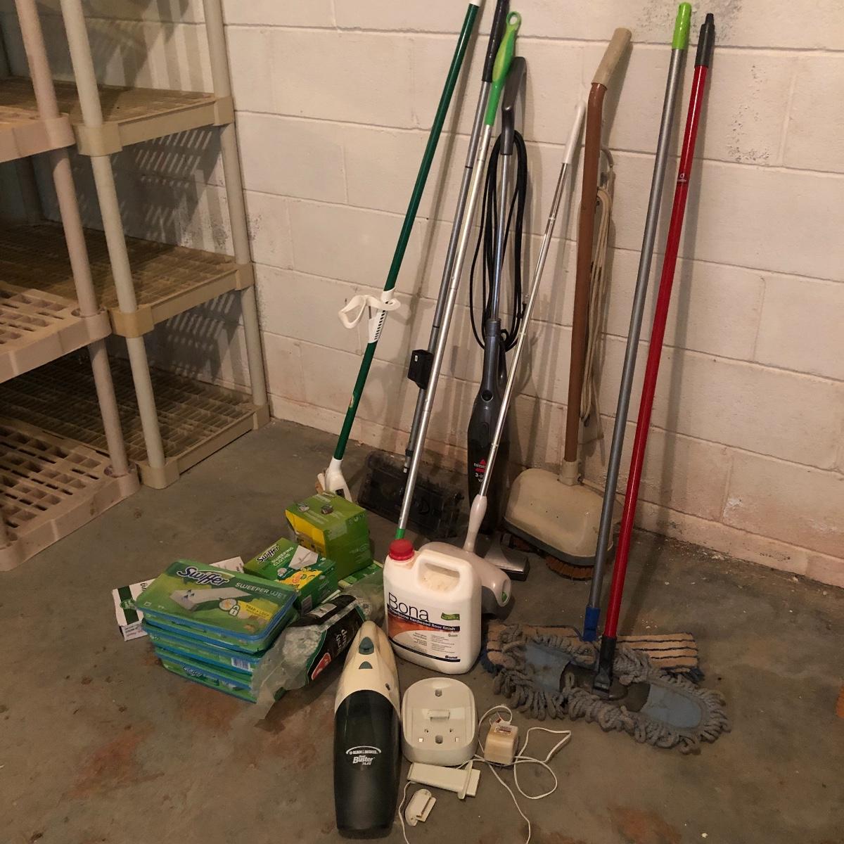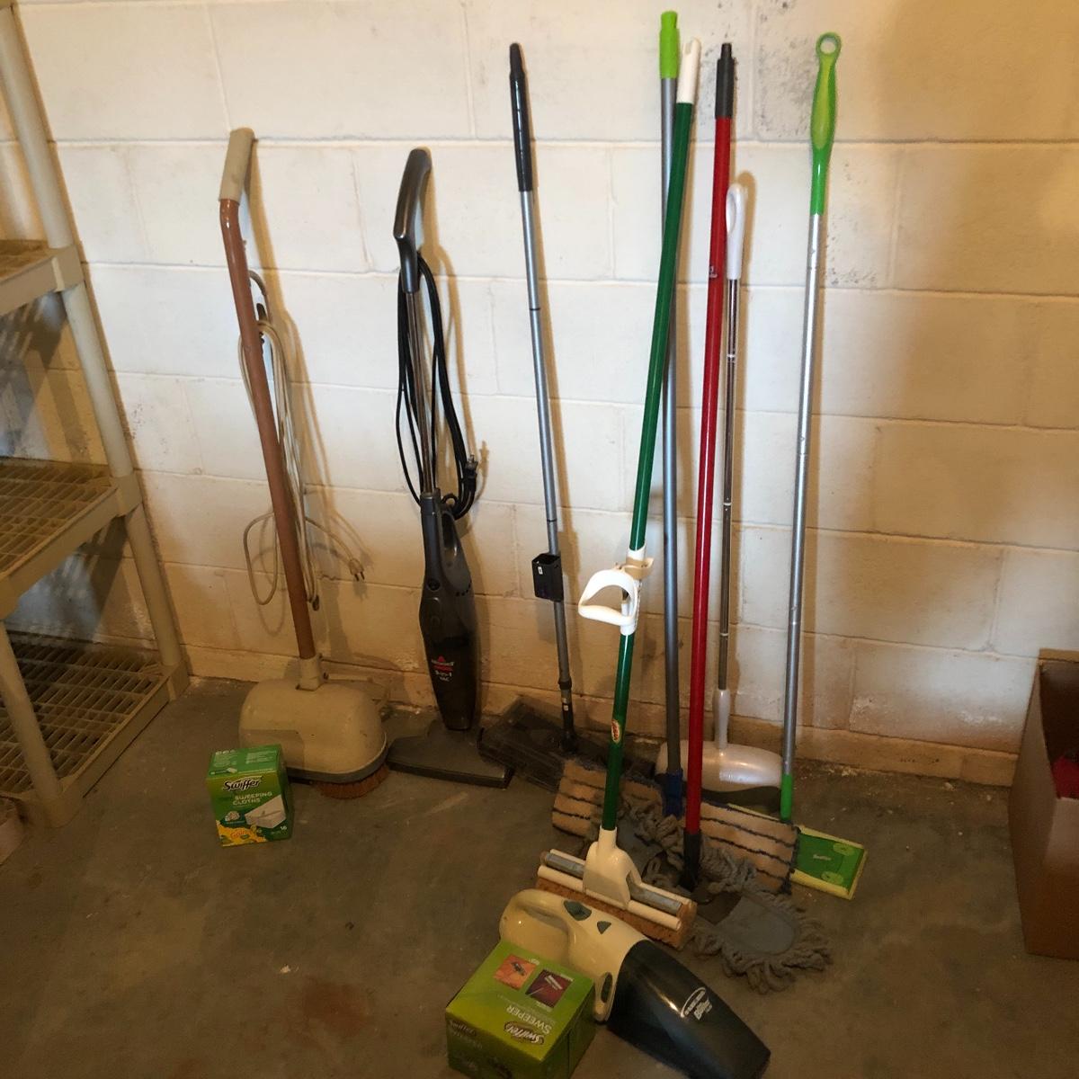 Keep your floor clean with this lot! It includes a floor scrubber, a light weight Bissell 3-in-1 vacuum, a Black & Decker Dust Buster with wall mount, a swivel sweeper, a scotch-brite mop, and four floor mops/dusters. There is also swifter cloths, both wet and dry. All Electrical items powered on when plugged iin. Local pick up only.