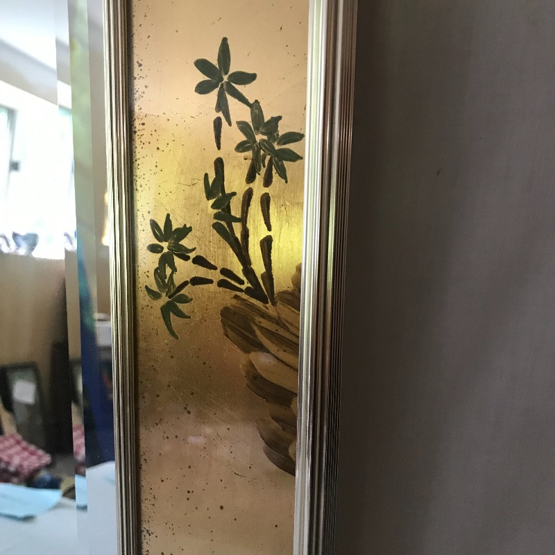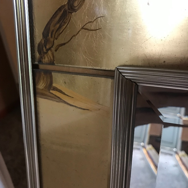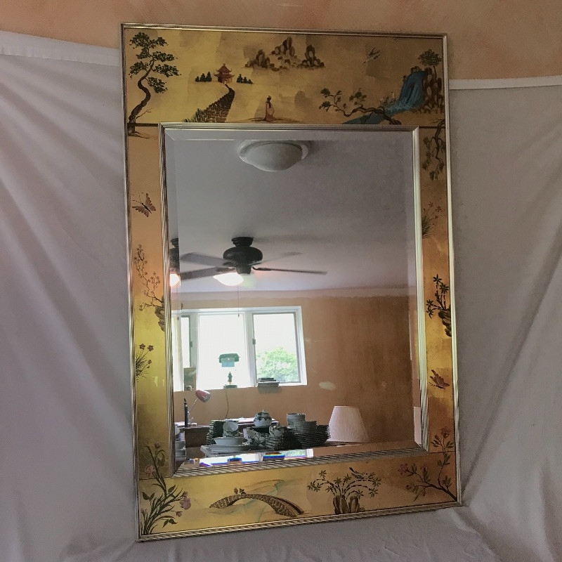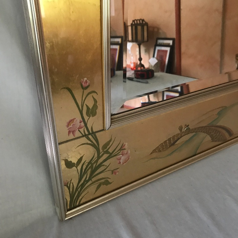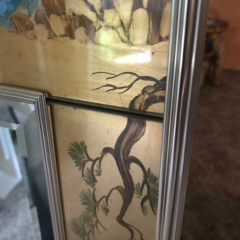 This beveled Mirror is quite substantial. It has a wood framing and metal trim. The art appears to be a lacquer of some sort. There is a bit of separation of the sides to the top and bottom of the artwork but seems that was the way it was made. Piece measures 28” x42” x2”. Two mount hooks on the back for hanging. Local pick up only.