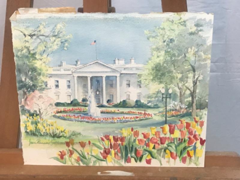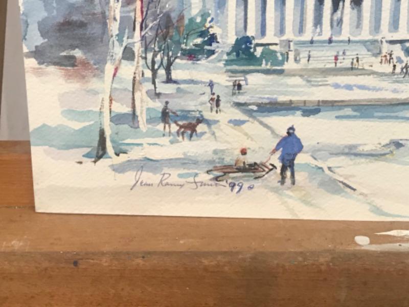 Three Jean Ranney Smith signed original watercolor paintings. “Jefferson Memorial” measures 15”x11”, “The White House” measures 14”x11” and “Skating at the Lincoln Memorial “ measures 10-1/2”x7”