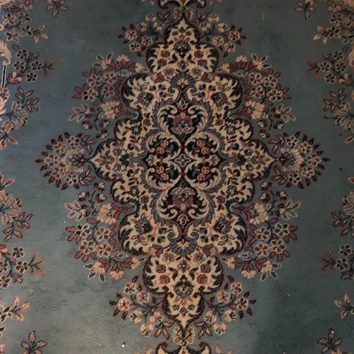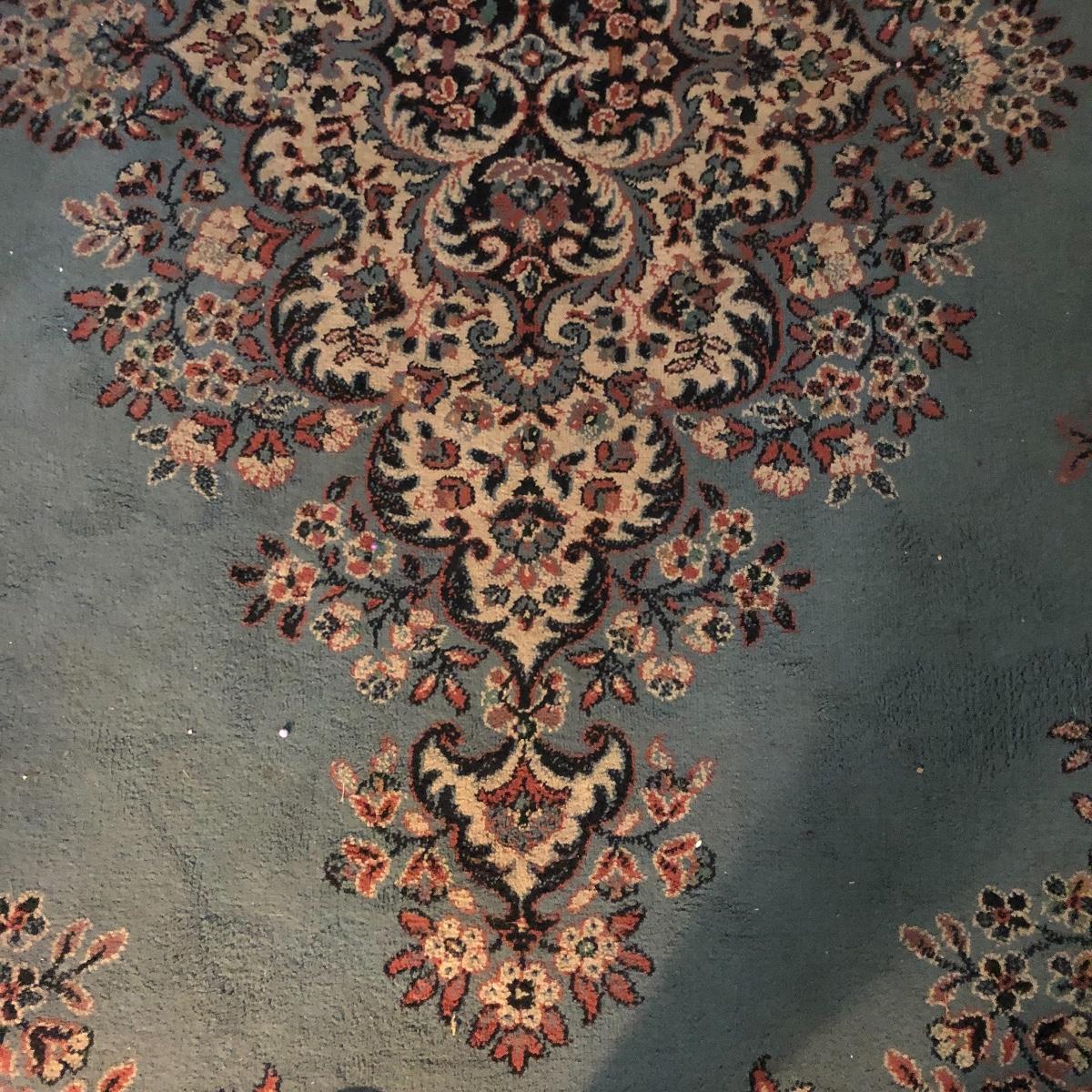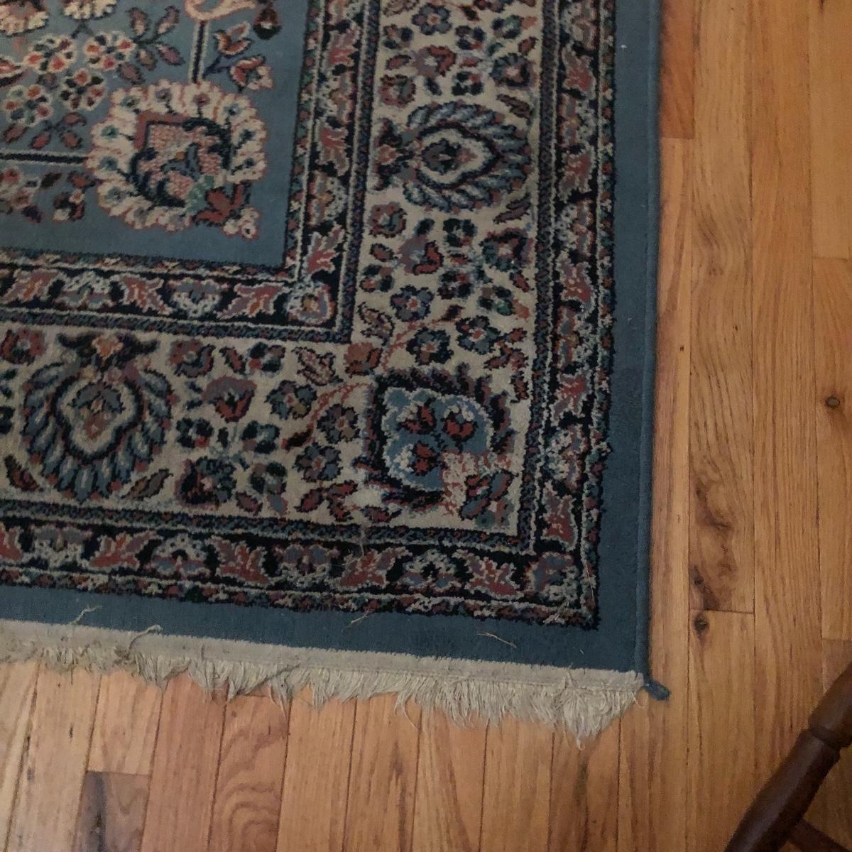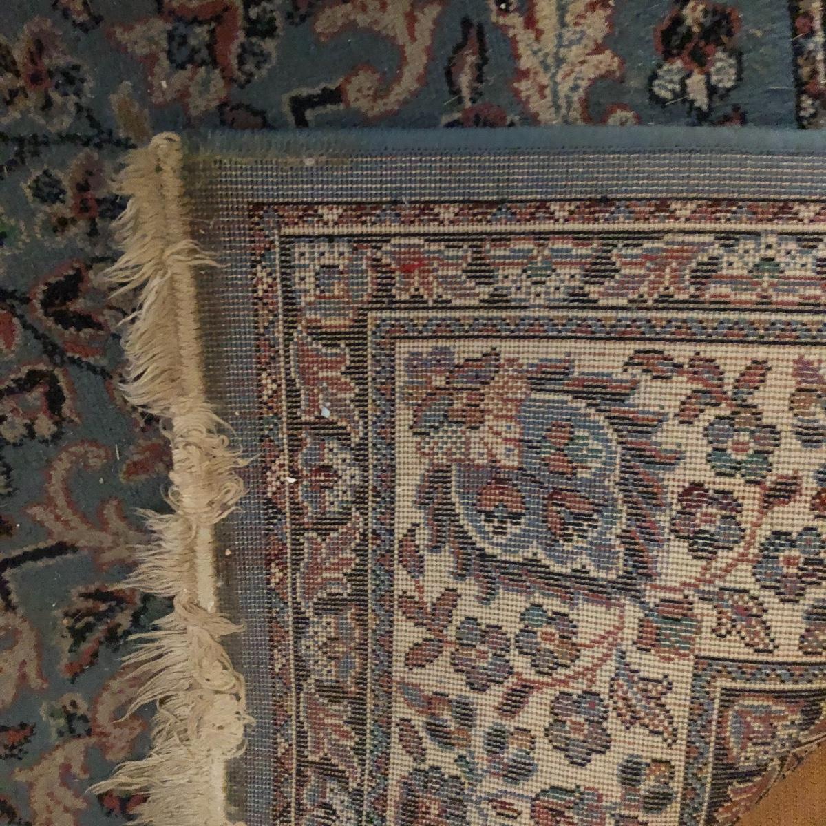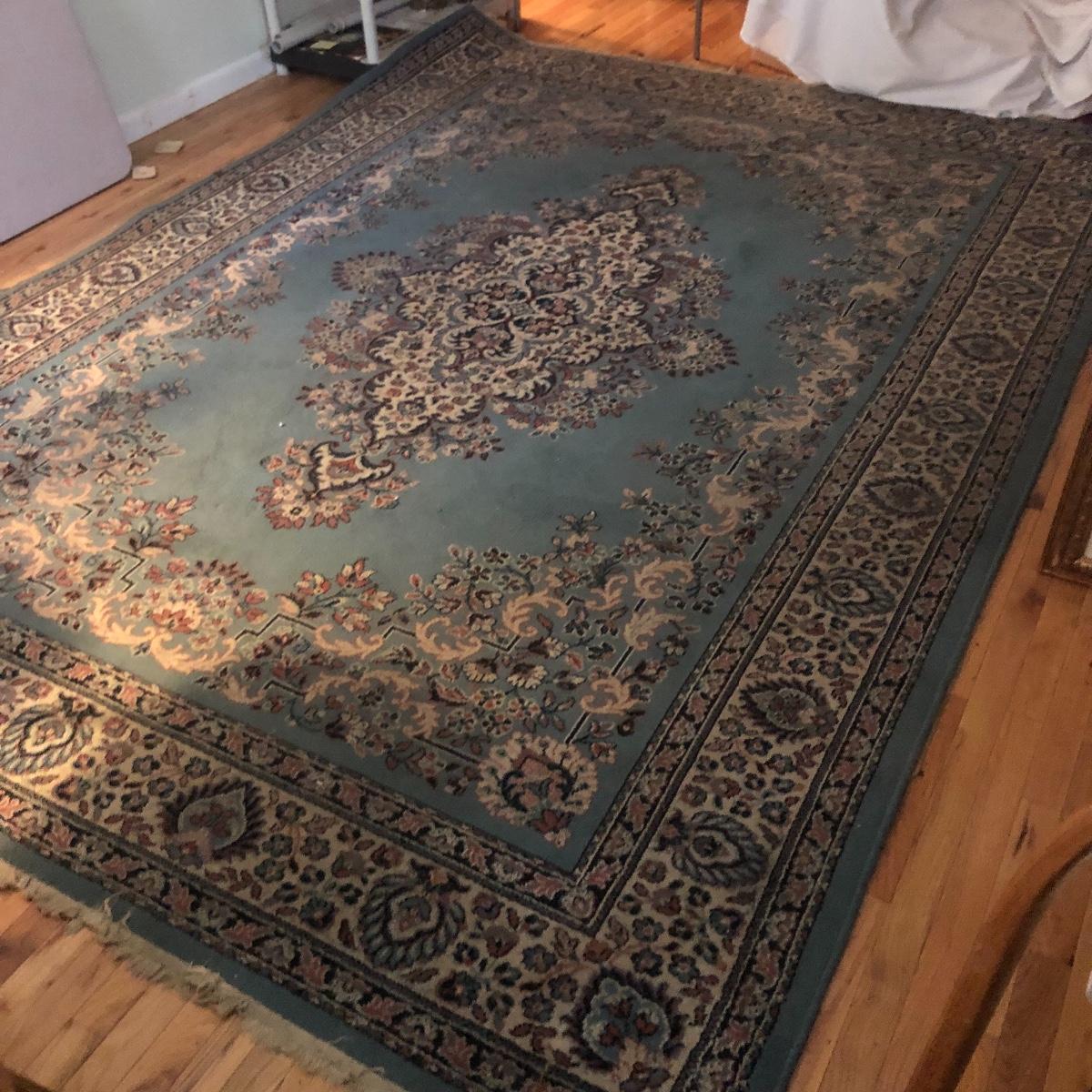 Keep your feet warm and protect your floors with this large area rug. Also includes rug mat. Rug measures 94” x 134”. See lot 47 for matching companion rug. No manufacturers tag could be found.