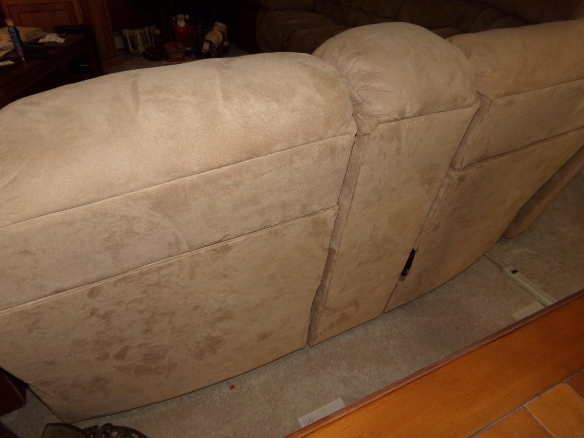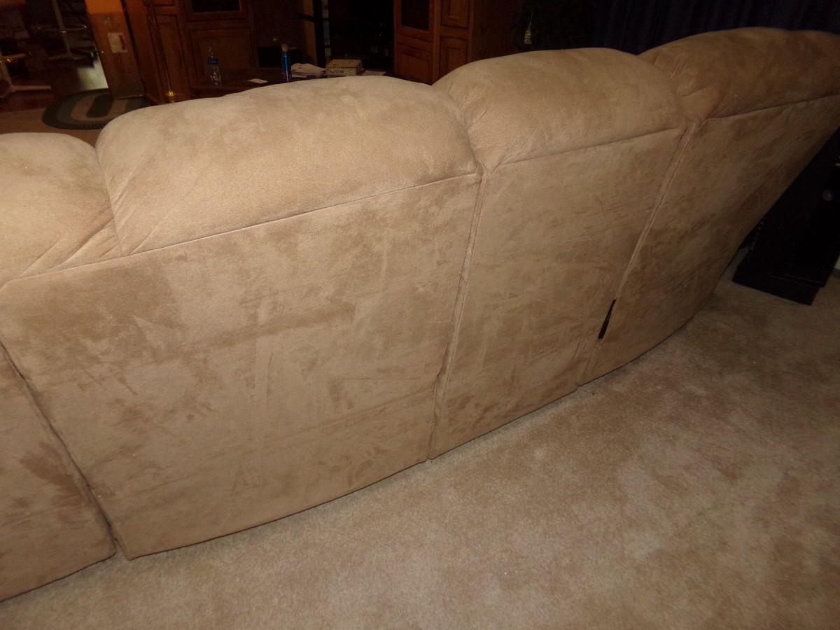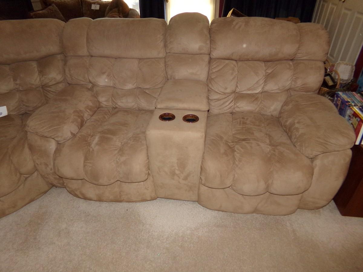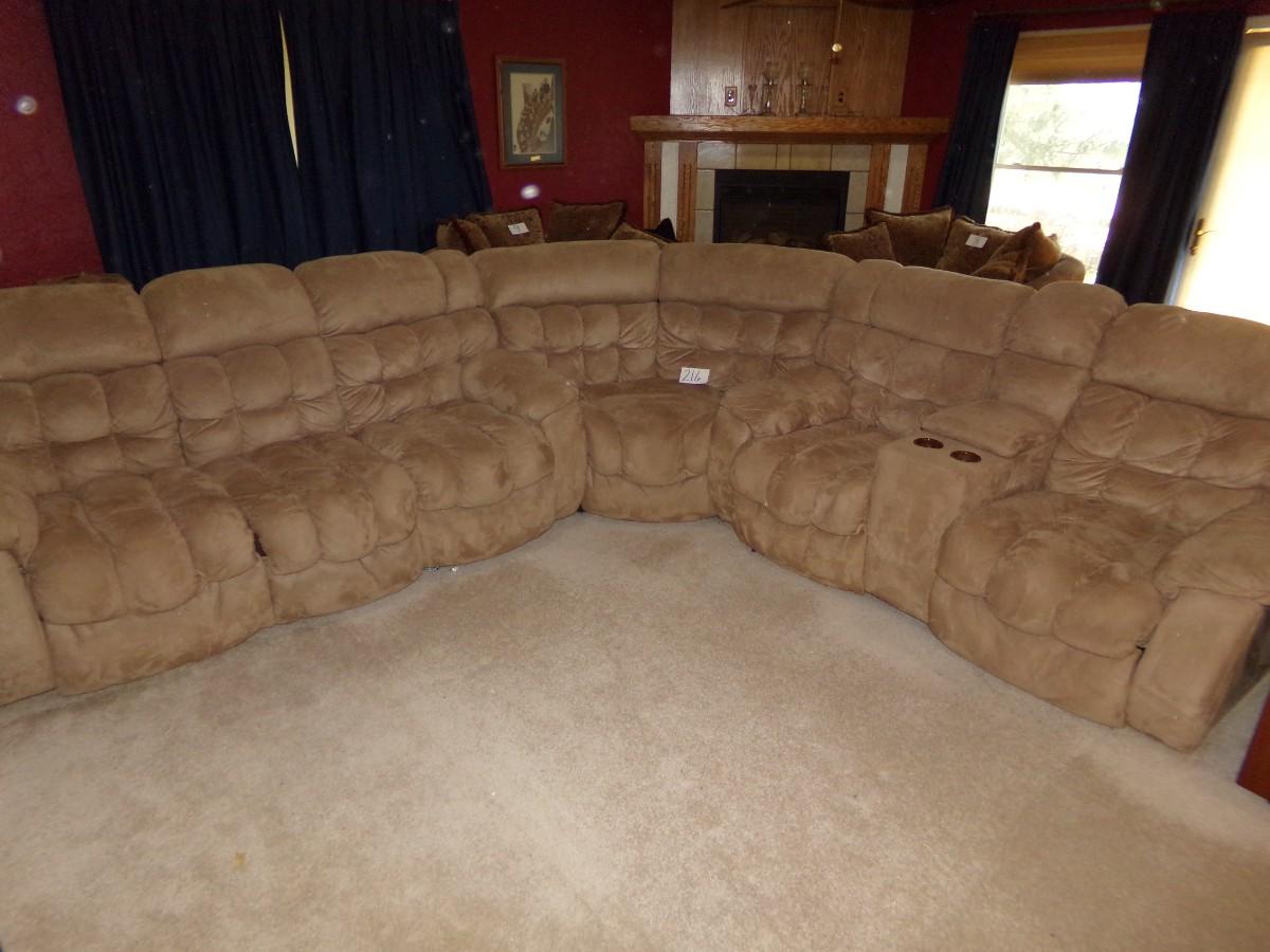 LANE FURNITURE - LARGE MICROFIBER SECTIONAL SOFA. ONE SECTION HAS A MEDIA CUBBY AND CUP HOLDERS. EACH SIDE PIECE HAS 2 RECLINERS. FOR A TOTAL OF 4.