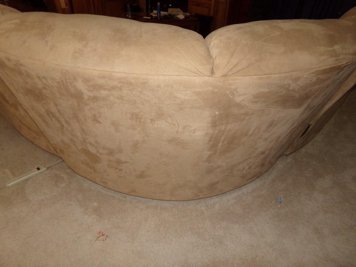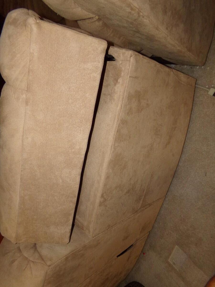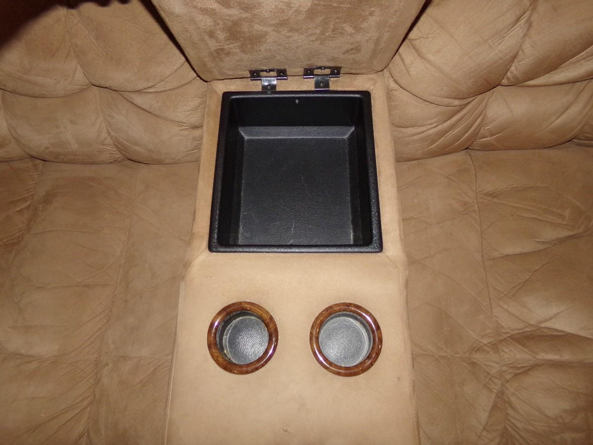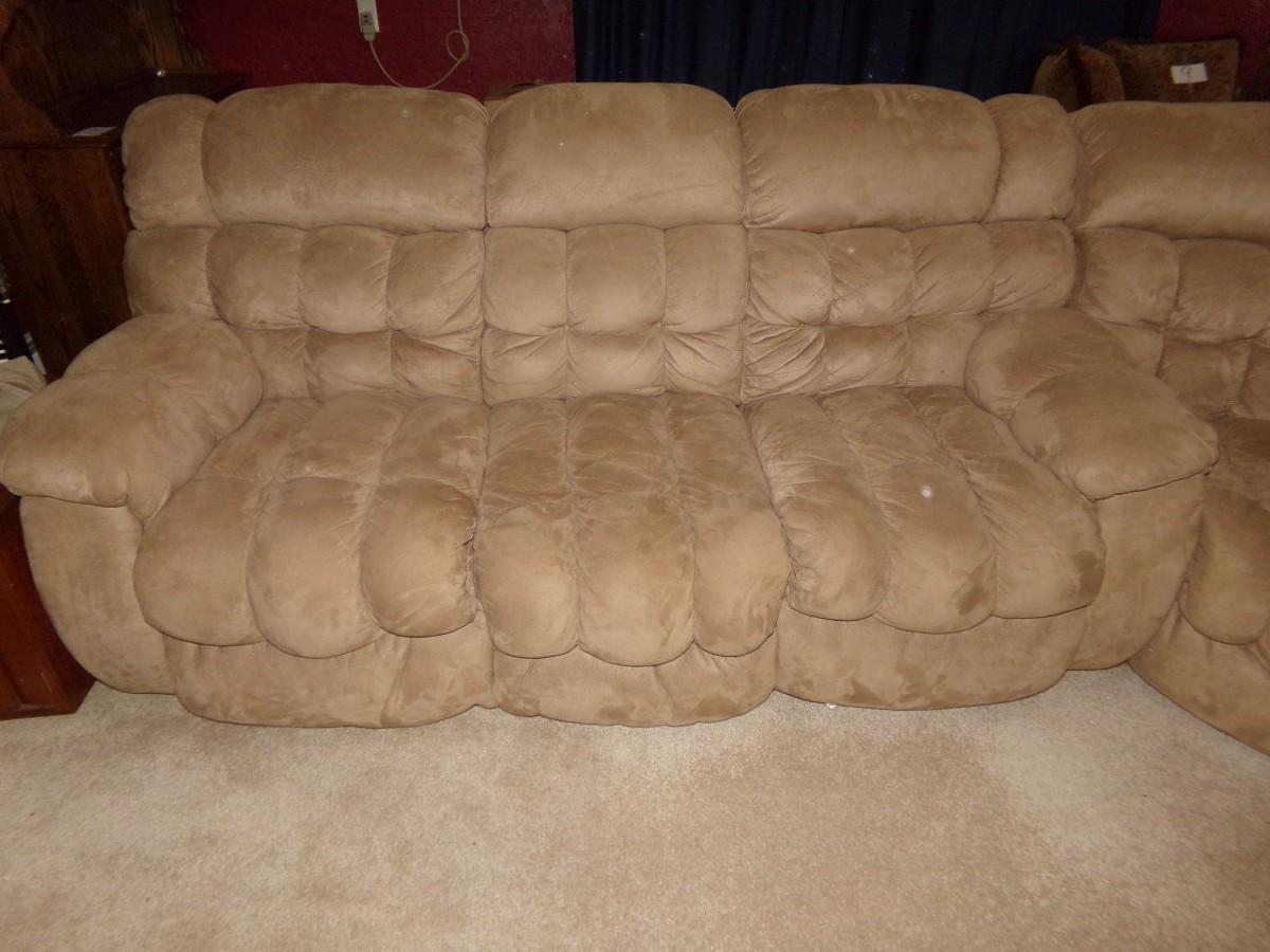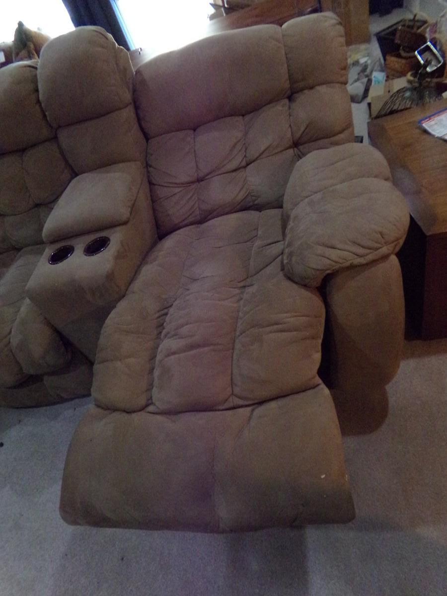 LANE FURNITURE - LARGE MICROFIBER SECTIONAL SOFA. ONE SECTION HAS A MEDIA CUBBY AND CUP HOLDERS. EACH SIDE PIECE HAS 2 RECLINERS. FOR A TOTAL OF 4.