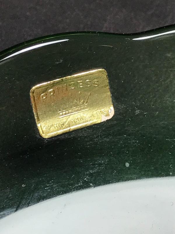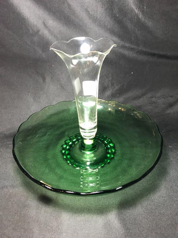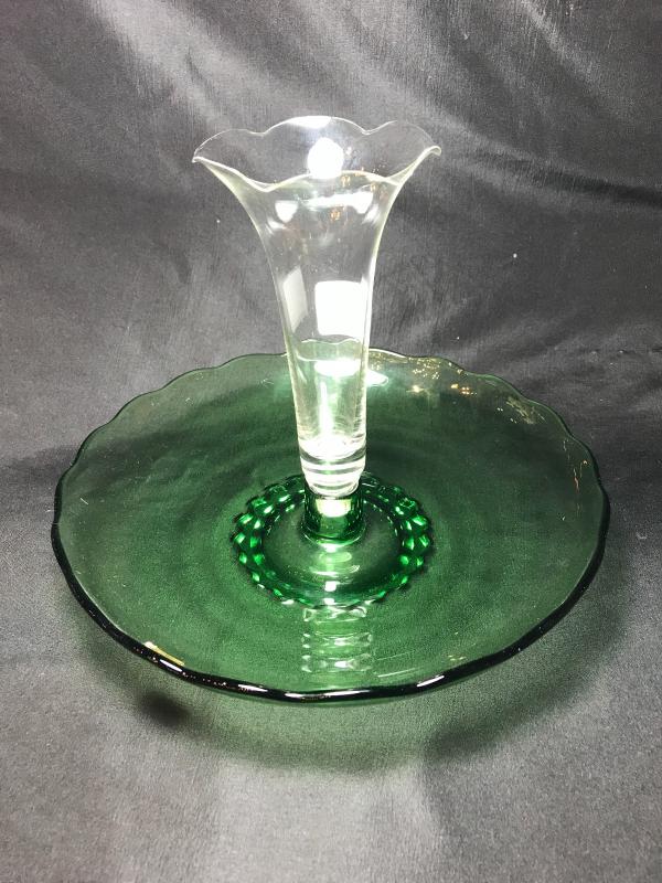 Great MC green and clear glass epergne by Viking. Green scalloped edge low bowl holds clear ruffeled vase insert. Original "Princess Viking Hand Made" foil sticker. 10 1/" D x 8" H