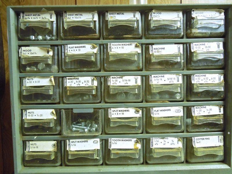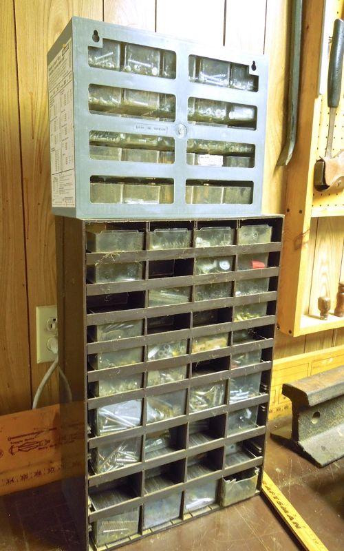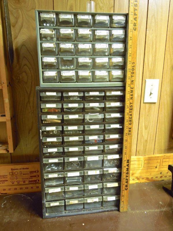 Two vintage storage cabinets full of screws and hardware and labeled. Upper cabinet is metal with plastic drawers. Bottom is hard plastic with plastic drawers.
