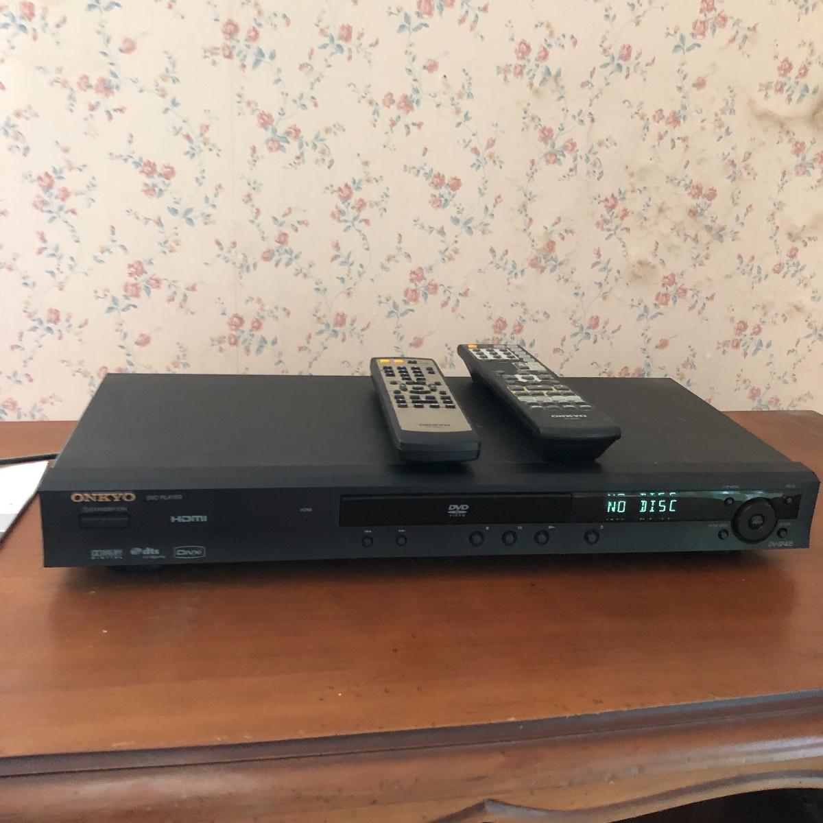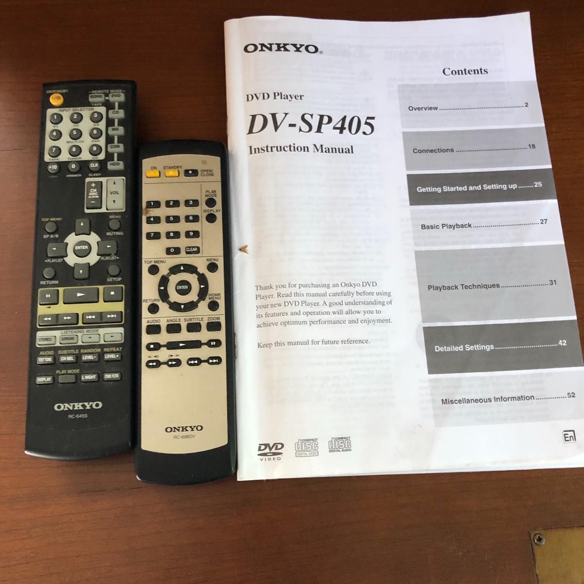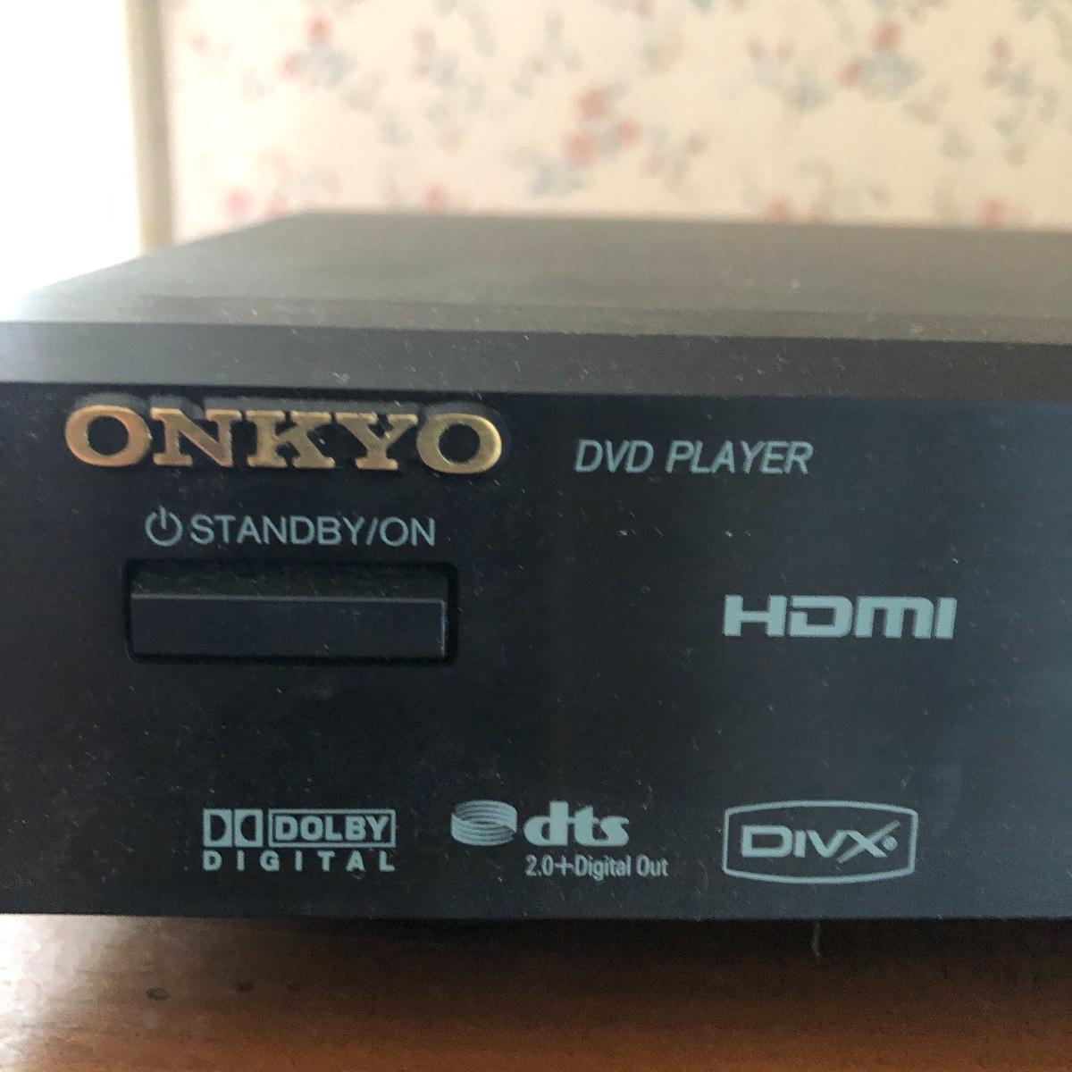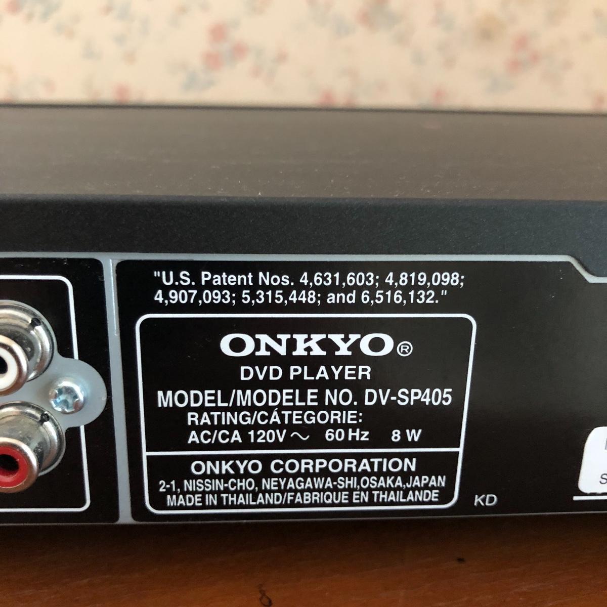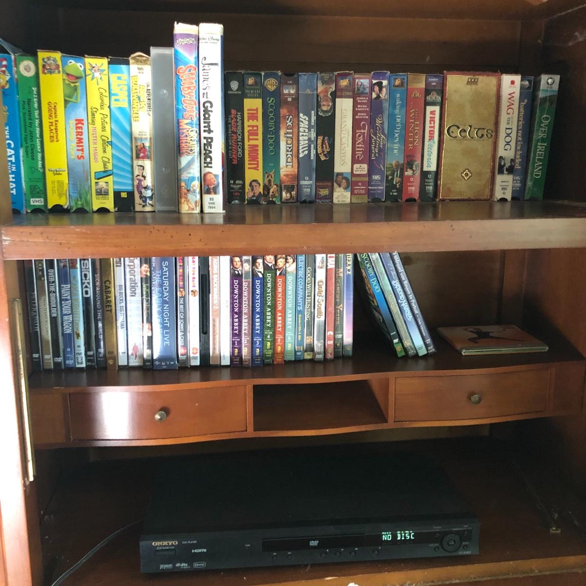 Enjoy a movie with this Onkyo DV-SP405 DVD player. Lot includes Onkyo DVD player and a selection of DVDs and VHS tapes. Titles include Downton Abbey season 1-6, Scooby Doo, Beetlejuice, Good Will Hunting, Beyond Narnia, Cabaret and more. Furniture pictured is not included but available in lot 227.