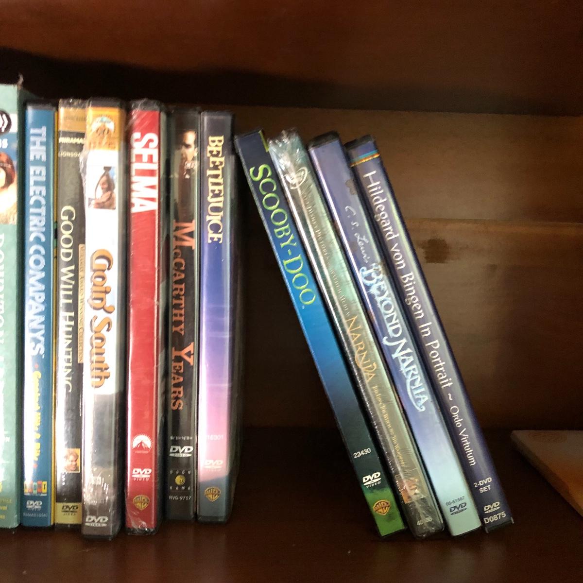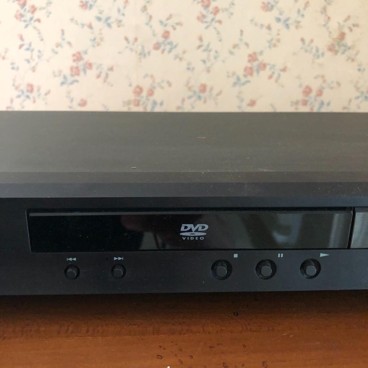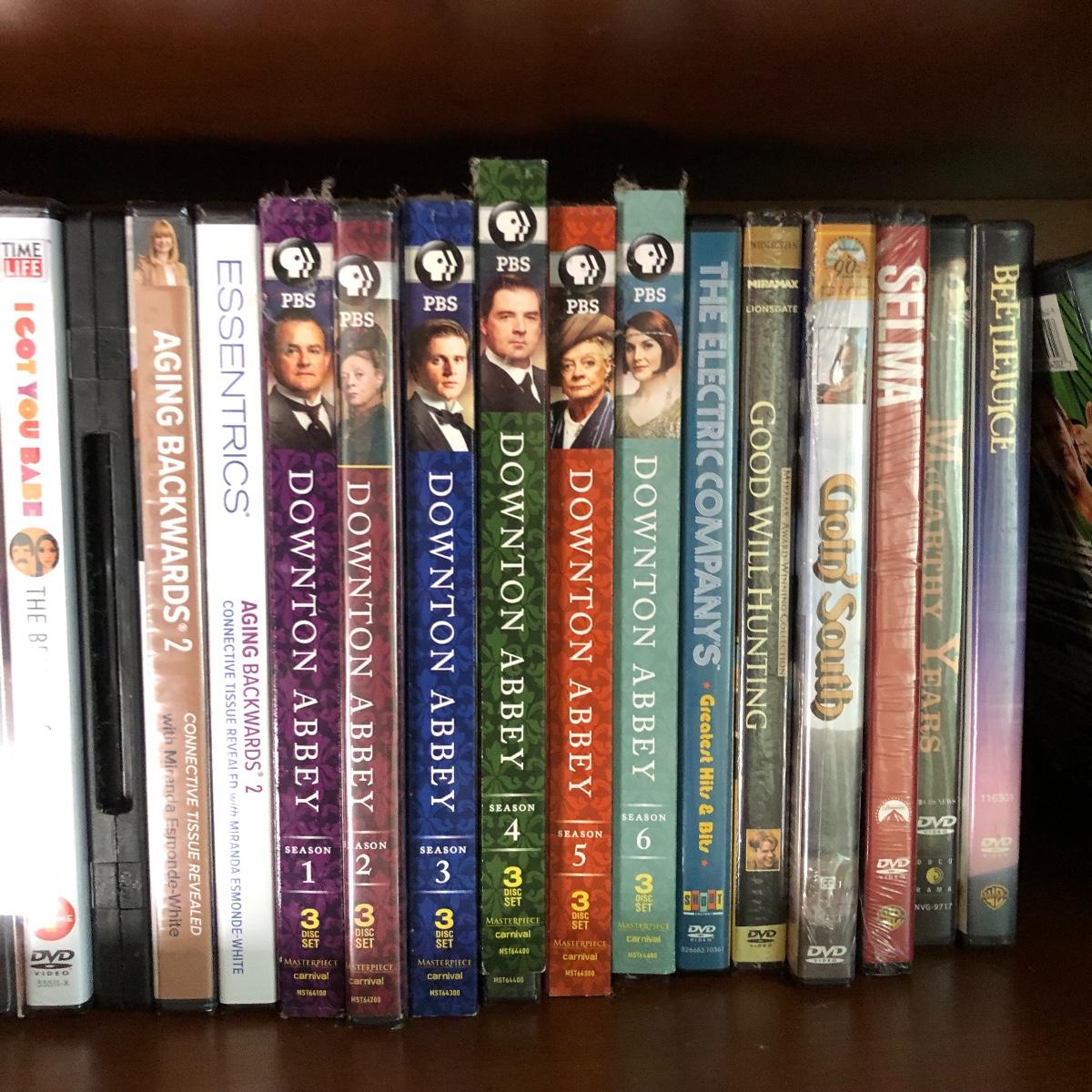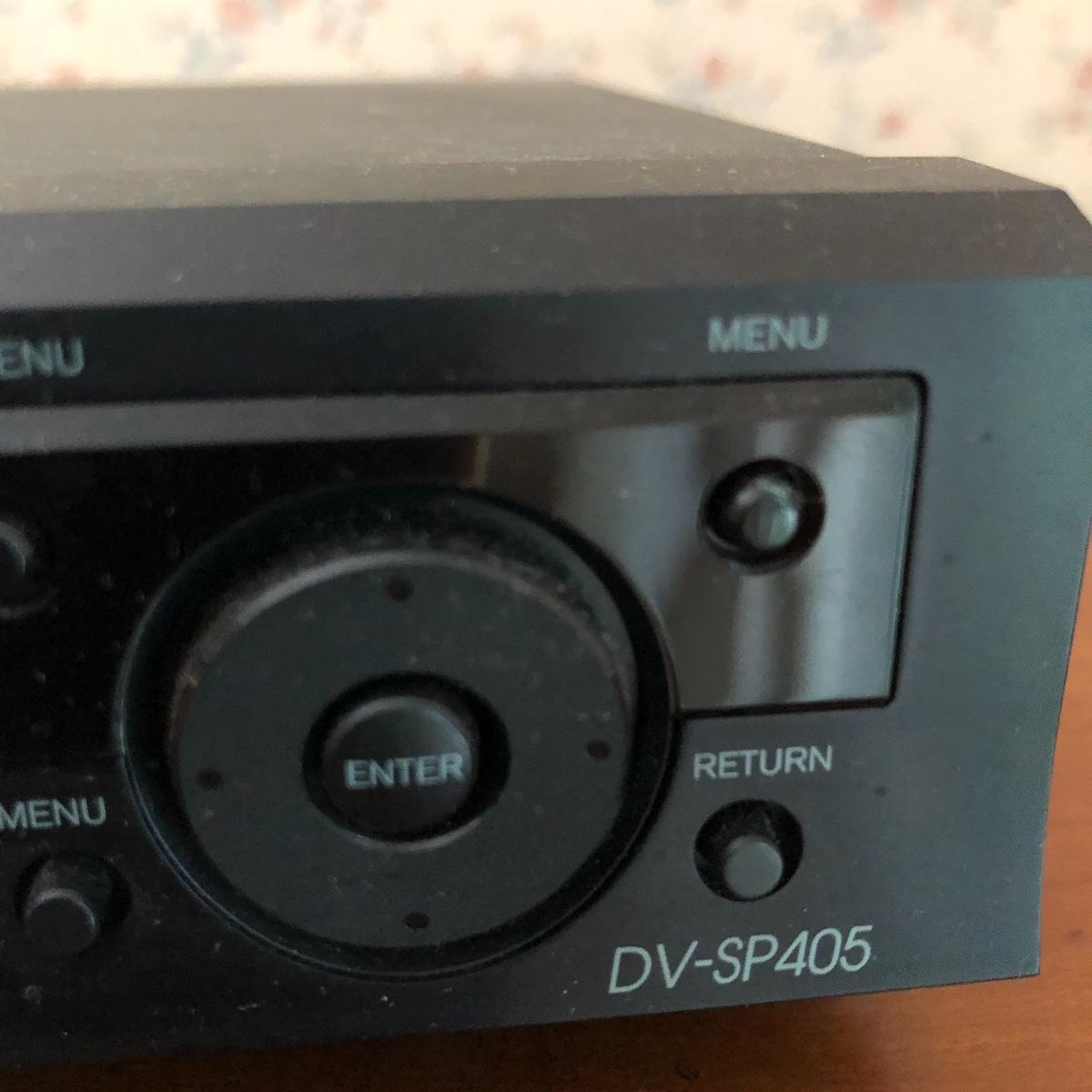 Enjoy a movie with this Onkyo DV-SP405 DVD player. Lot includes Onkyo DVD player and a selection of DVDs and VHS tapes. Titles include Downton Abbey season 1-6, Scooby Doo, Beetlejuice, Good Will Hunting, Beyond Narnia, Cabaret and more. Furniture pictured is not included but available in lot 227.