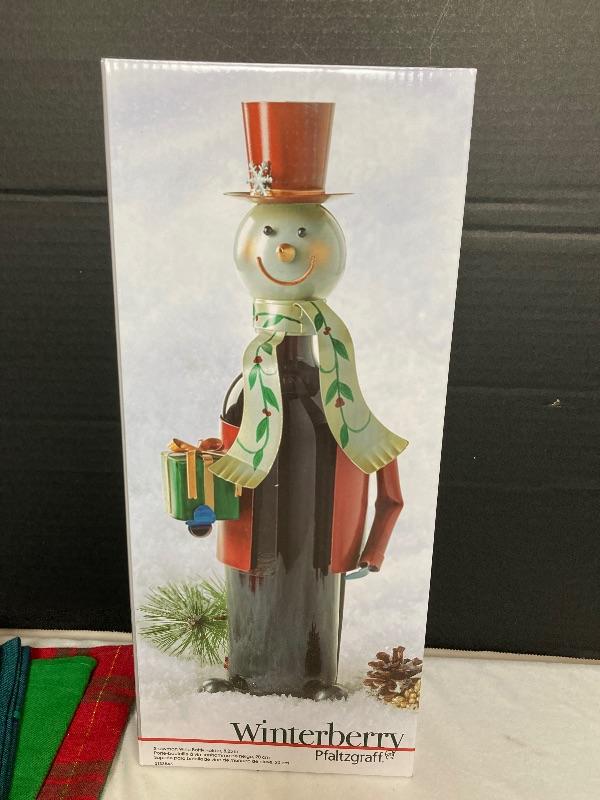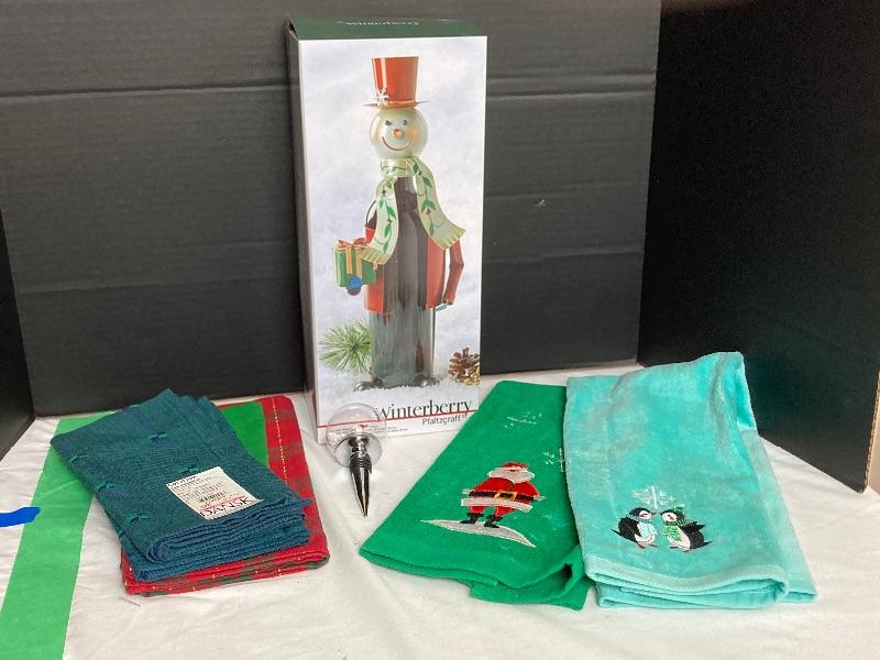 Pfaltzgraff Winterberry Wine Bottle Holder, Wine Bottle Stopper, Two Holiday Themed Hans Towels and Four Dinner Napkins