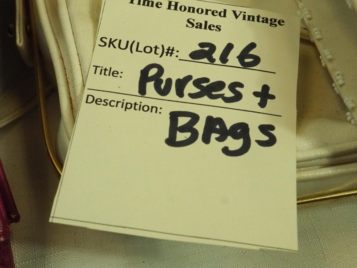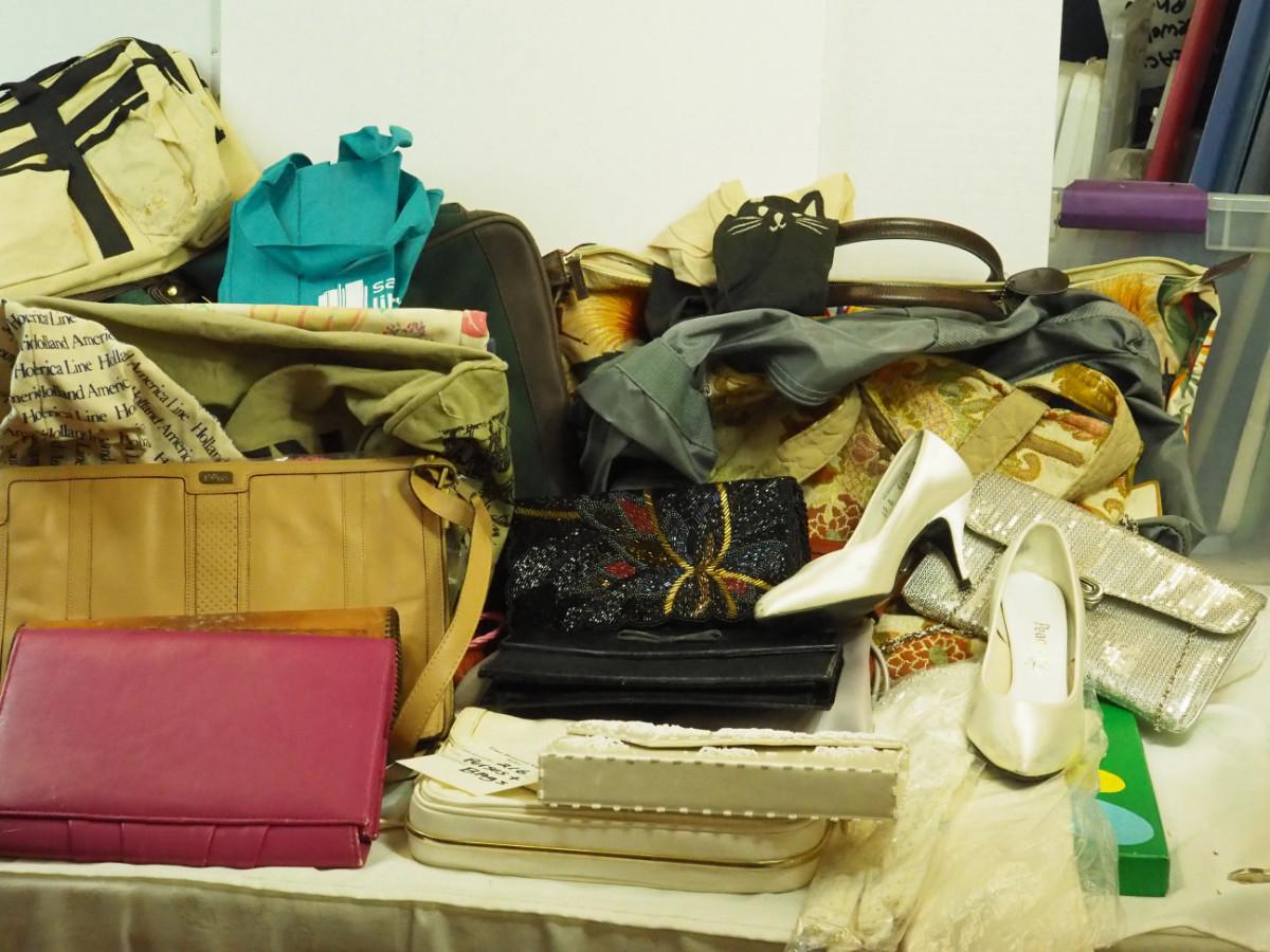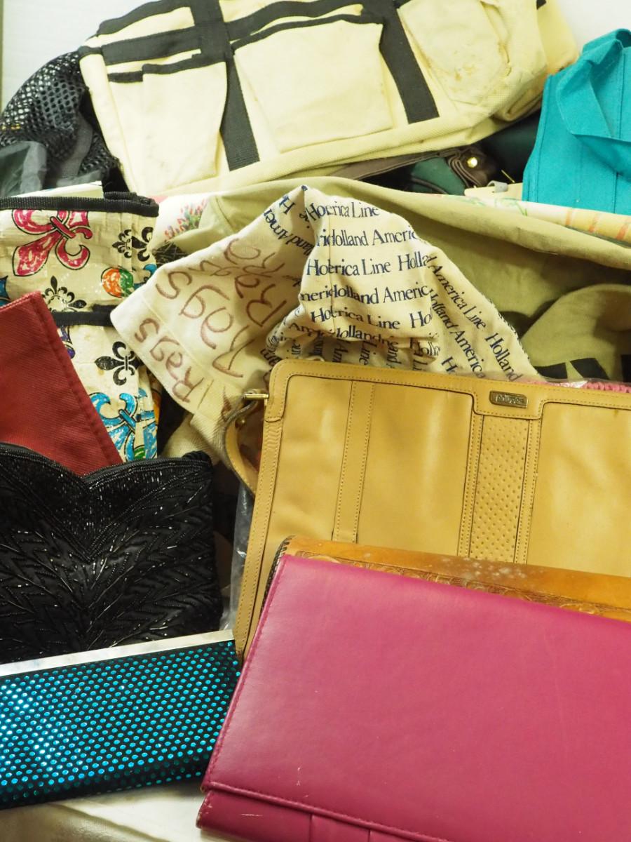 Lot 216- Purses and bags long fancy gloves and Princess shoes. Loads of shopping and duffel bags, purses and totes. 2 pairs of long white beaded gloves, evening bags.
