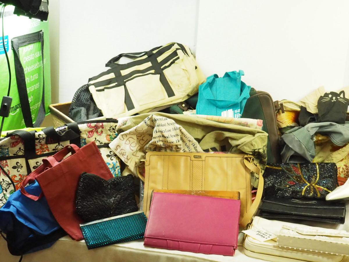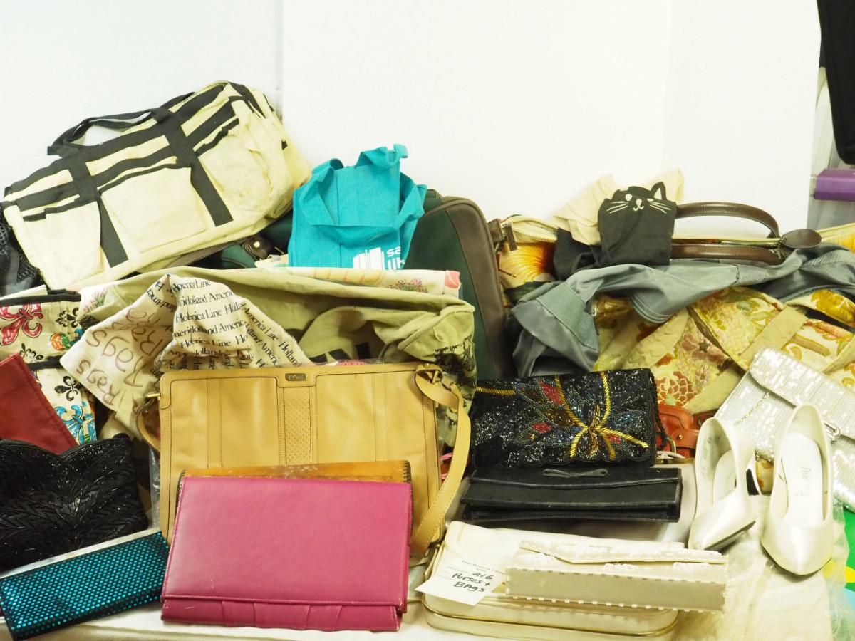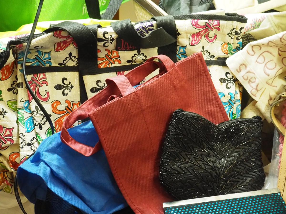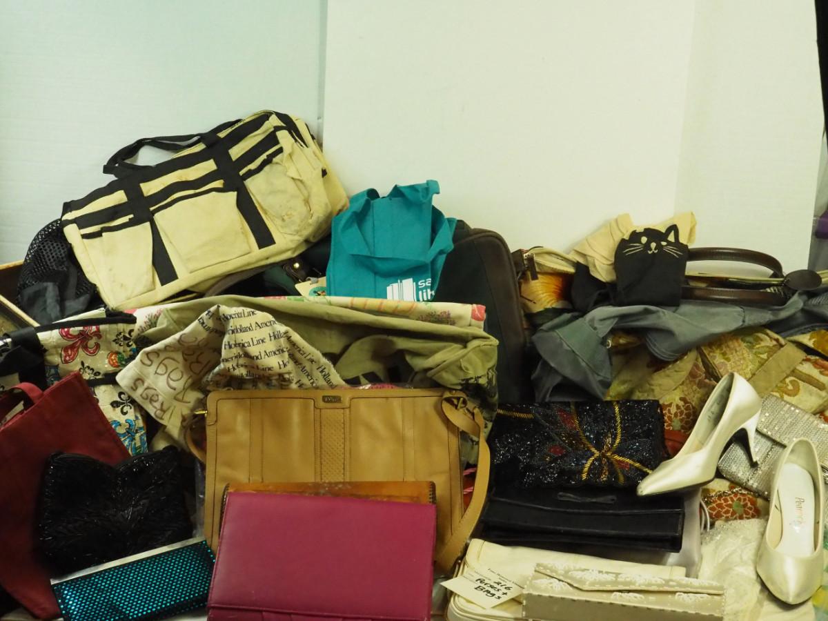 Lot 216- Purses and bags long fancy gloves and Princess shoes. Loads of shopping and duffel bags, purses and totes. 2 pairs of long white beaded gloves, evening bags.