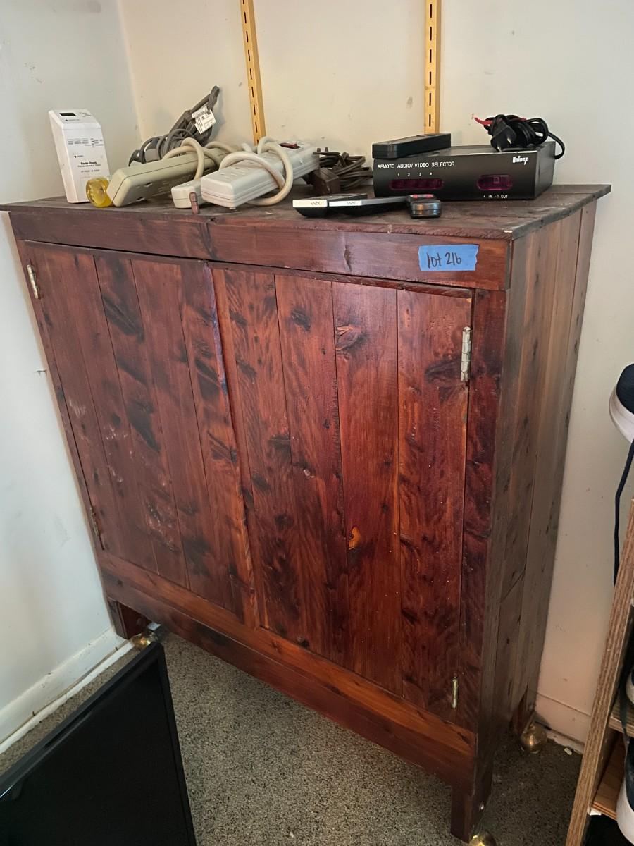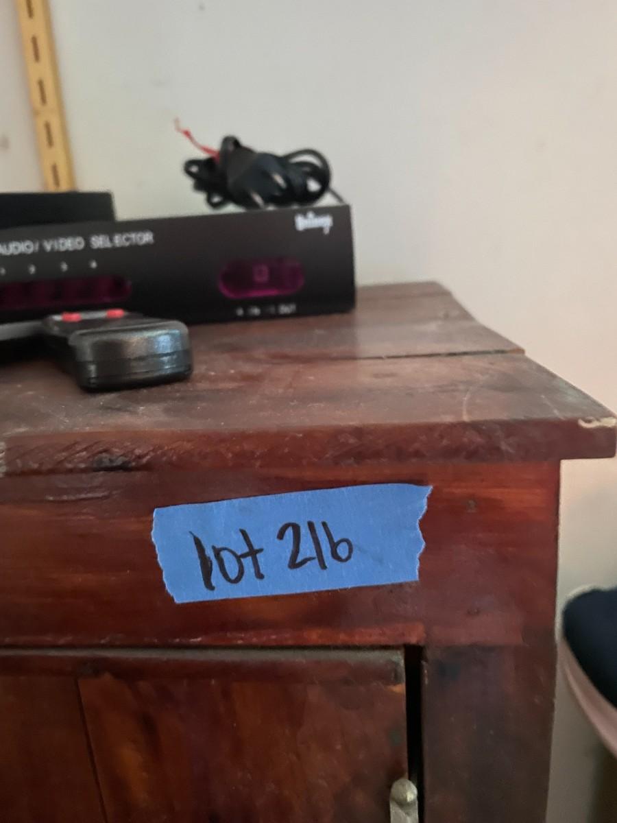 lot 216- retro cabinet on wheels with items on top