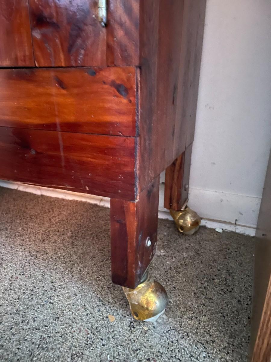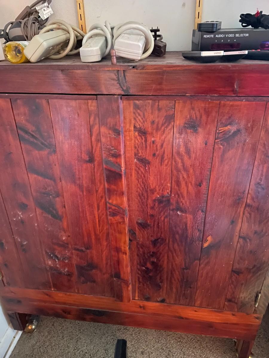 retro cabinet on wheels with items on top.