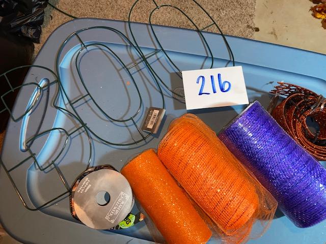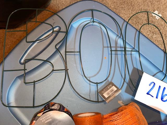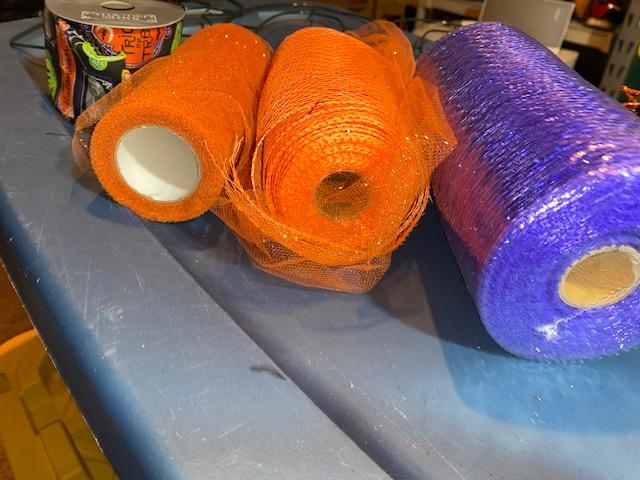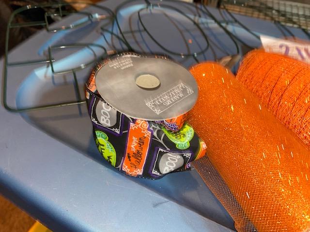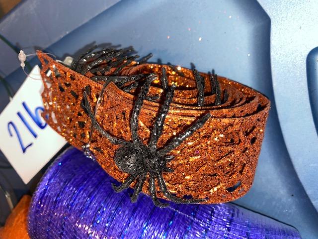 wire form and ribbon, orange giltter ribbon with spiders on it