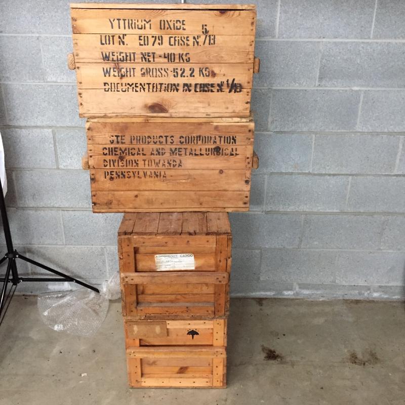 Four heavy duty wooden boxes with tops. One box has evidence of chewing on top-See photos. Boxes measure 16” x 23.5” x 14.25”.