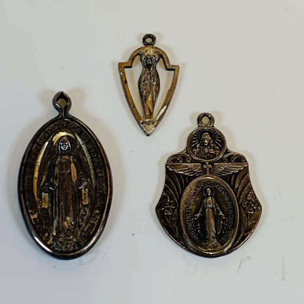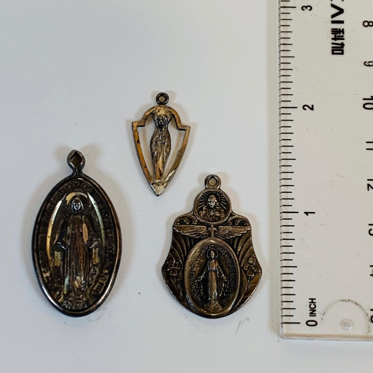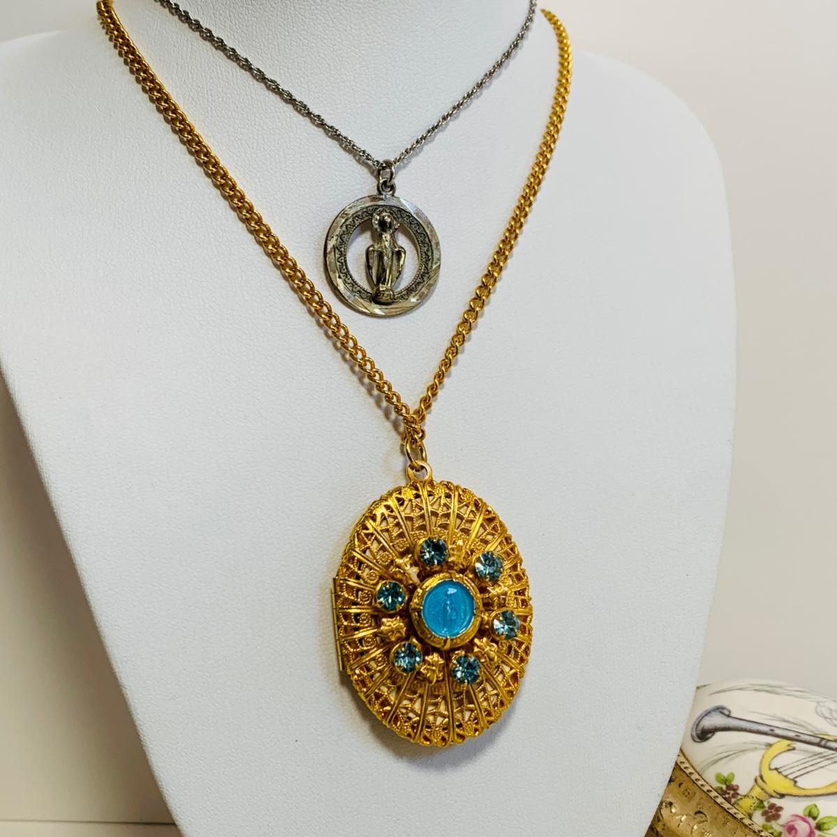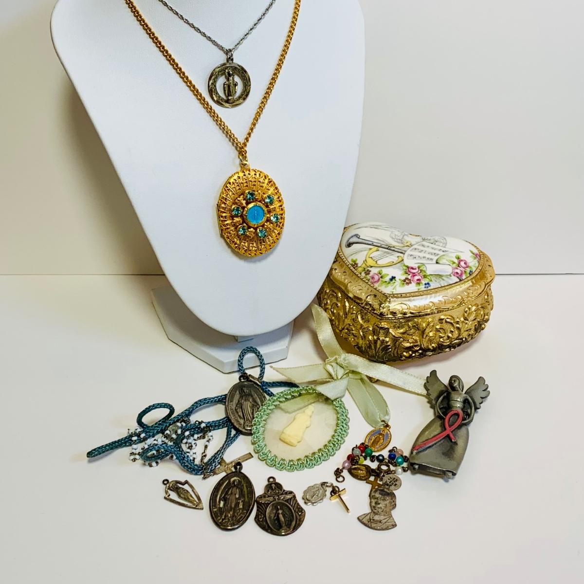 Lot 217: Sterling Silver Pendant w/16" Sterling Silver Chain, 3-Sterling Silver Religious Charms, Gold Tone Religious Locket, Heart Shaped "Splendid" Music Box & More
