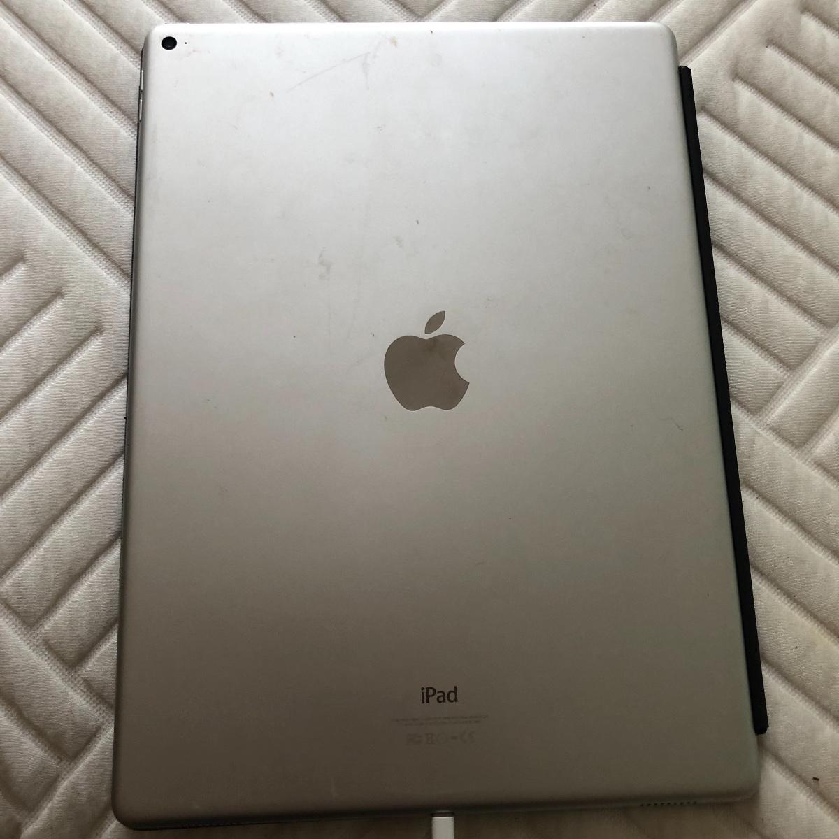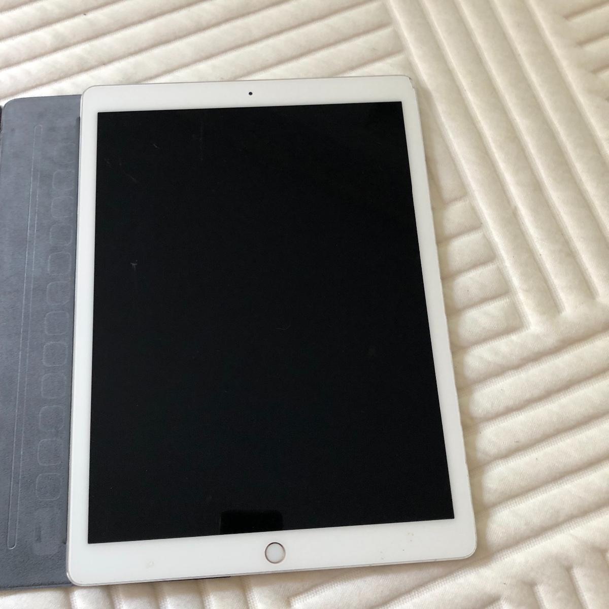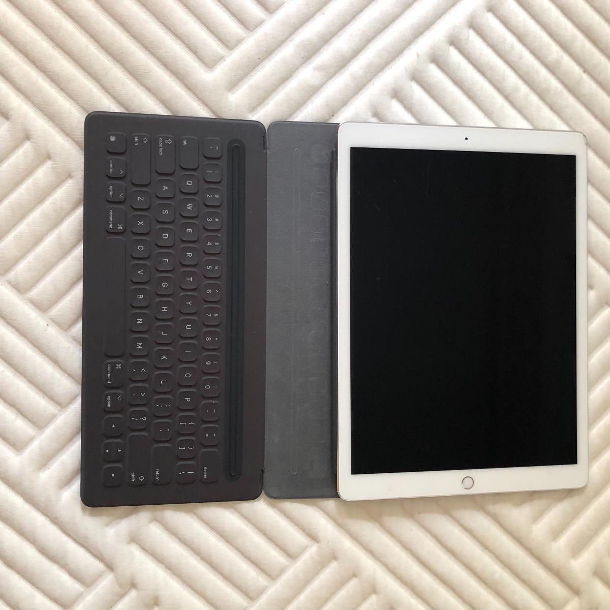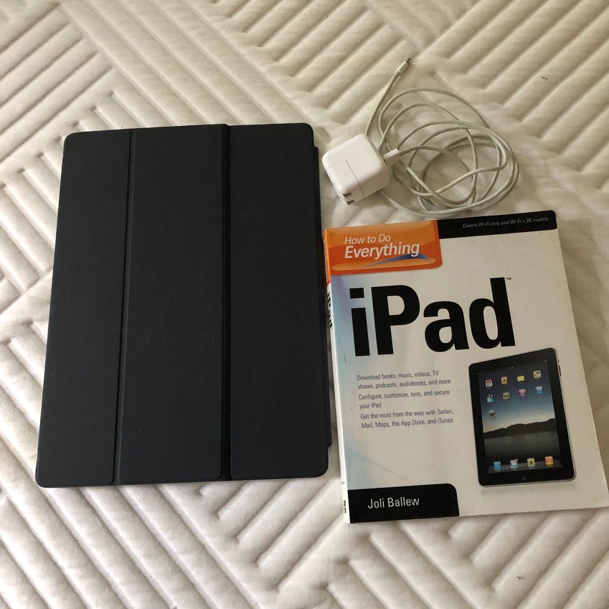 This iPad is awesome with its massive 12.9”screen. Lot includes iPad Pro 12.9” with cover and keyboard, charger and cable and book on iPad.