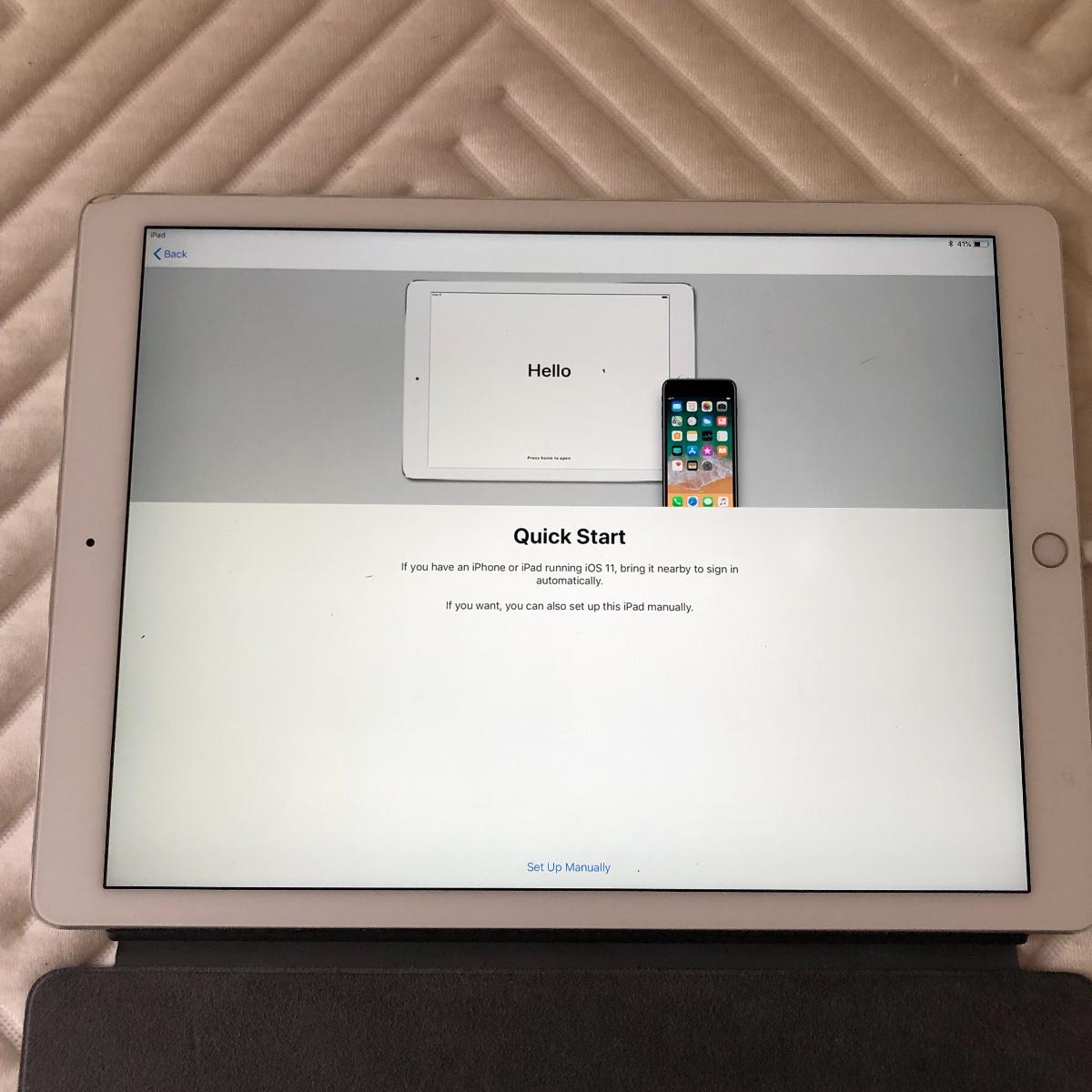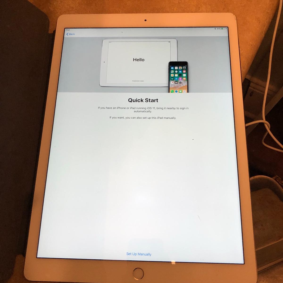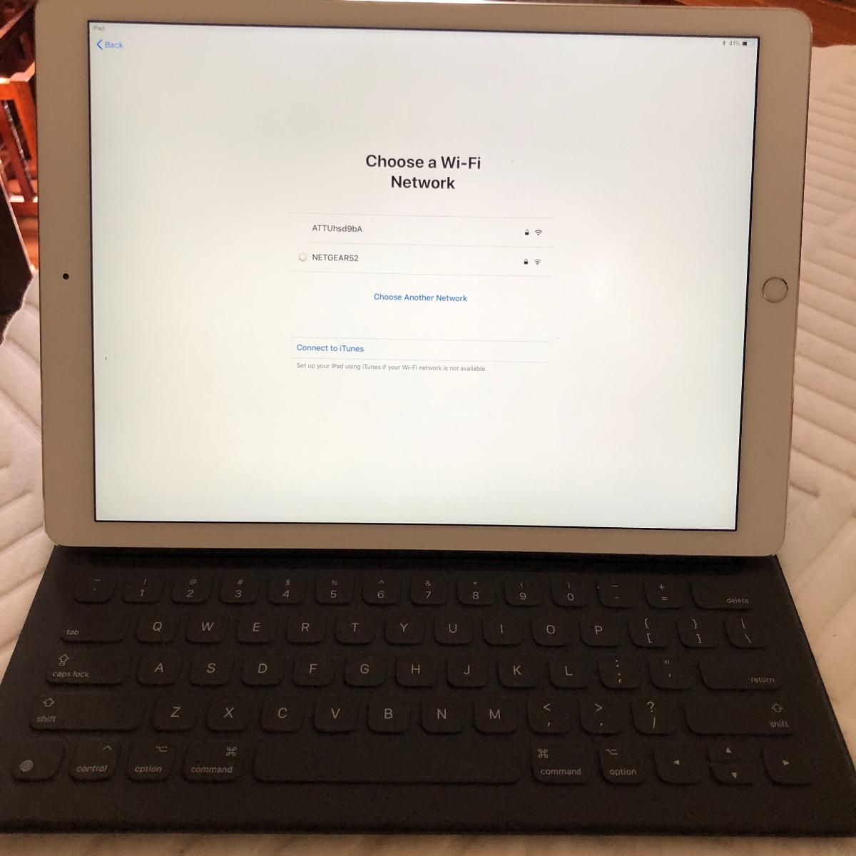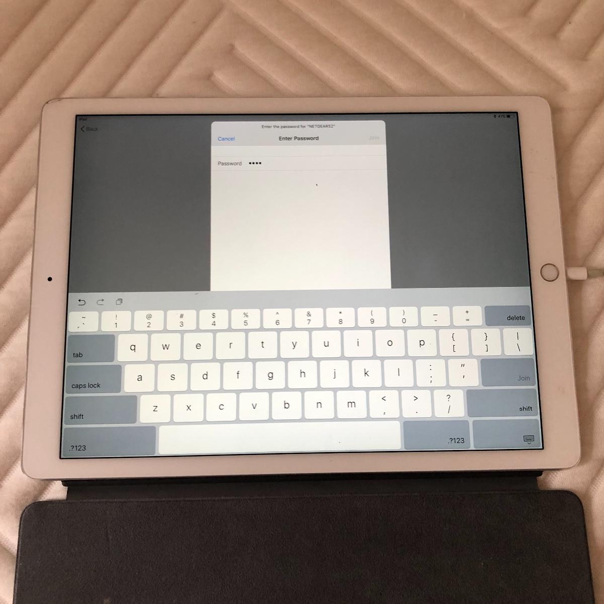 This iPad is awesome with its massive 12.9”screen. Lot includes iPad Pro 12.9” with cover and keyboard, charger and cable and book on iPad.