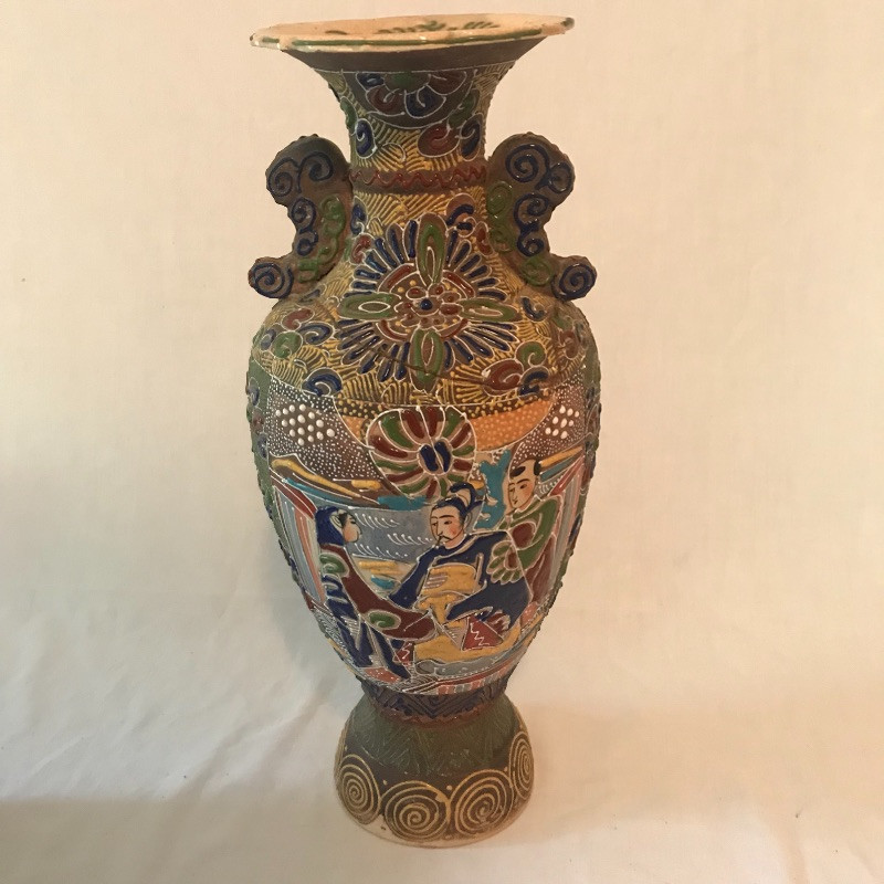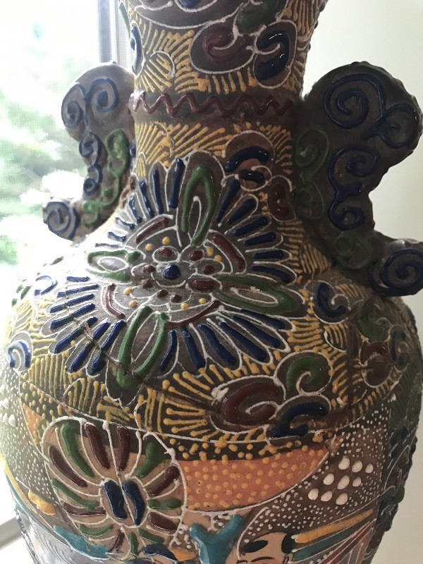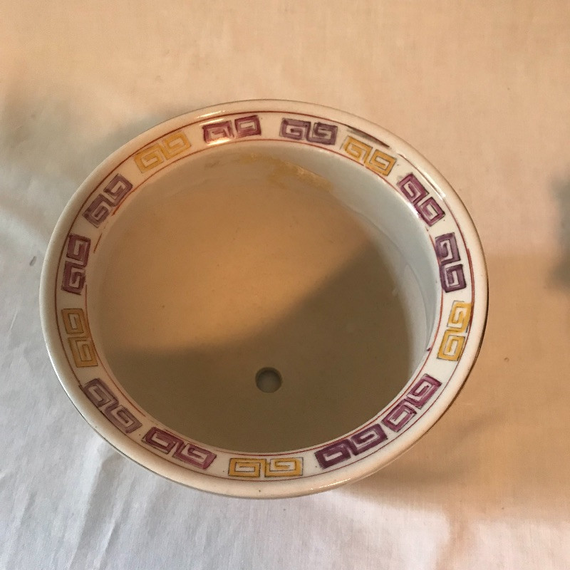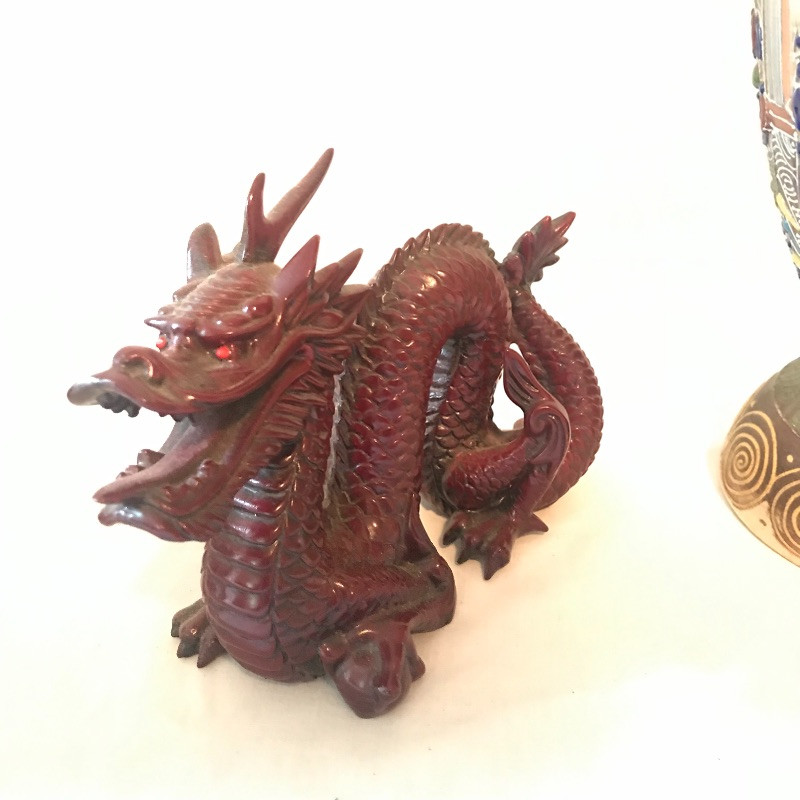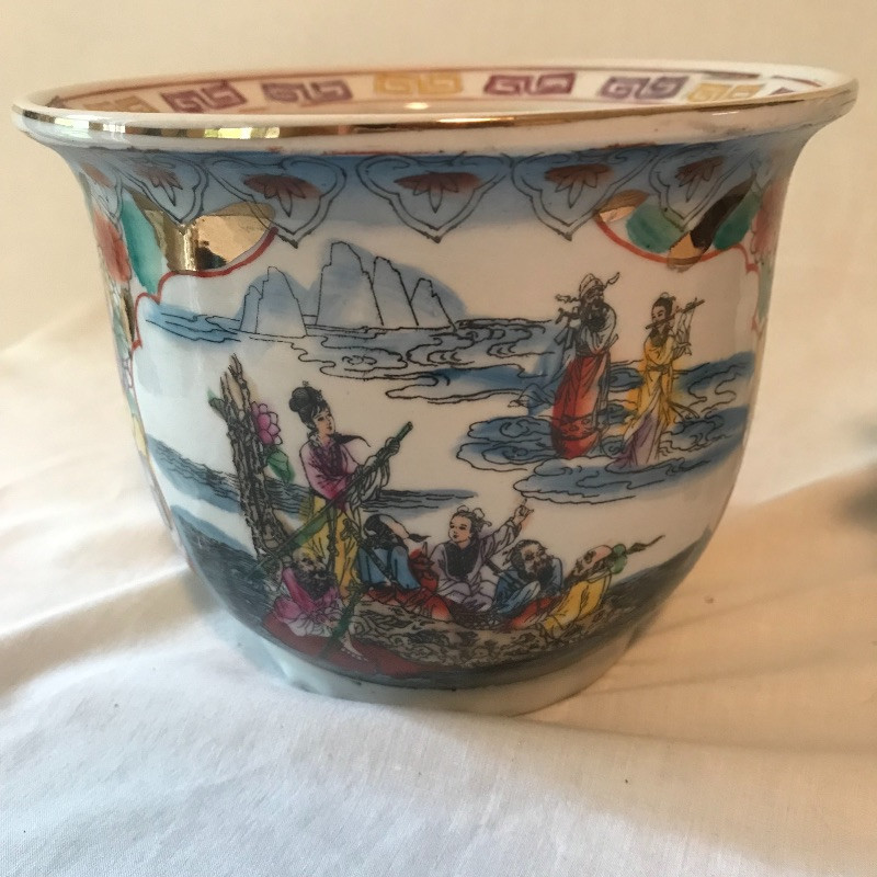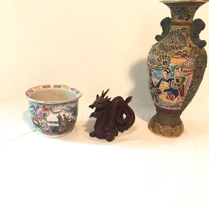 This clay with raised painted scenes Vase is both colorful and interesting. Piece appears to have been broken at the top and put together, see pix. It is really hard to notice with all the details. It measures 15” x7”. Planter is gold rimmed and in great condition, no drip dish withbit. Dragon is made of a resin and has piercing red eyes. Local pick up only.