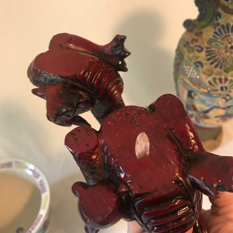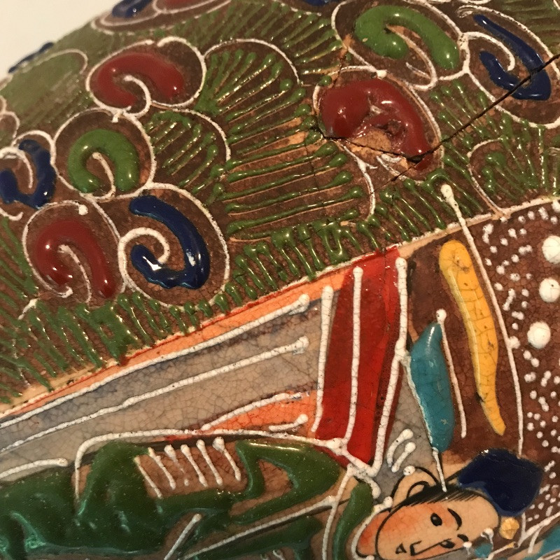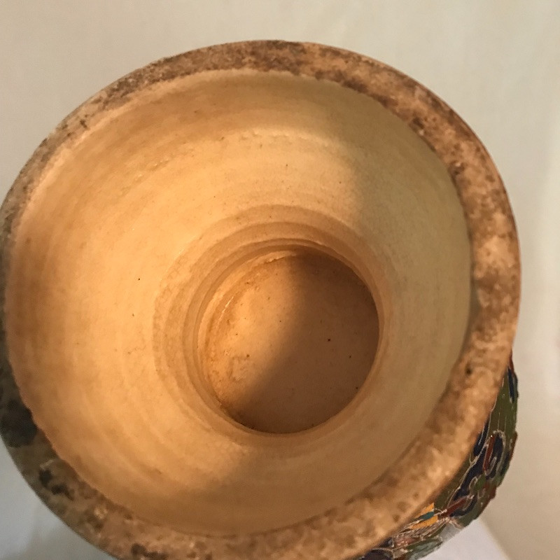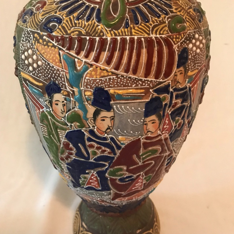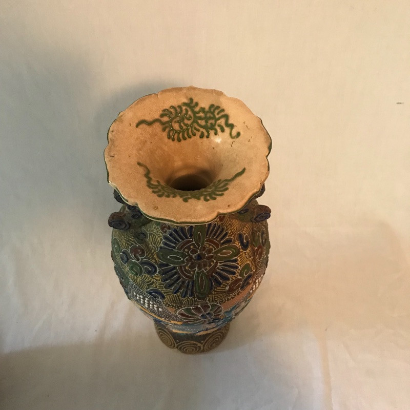 This clay with raised painted scenes Vase is both colorful and interesting. Piece appears to have been broken at the top and put together, see pix. It is really hard to notice with all the details. It measures 15” x7”. Planter is gold rimmed and in great condition, no drip dish withbit. Dragon is made of a resin and has piercing red eyes. Local pick up only.
