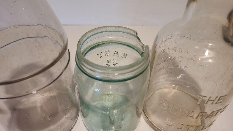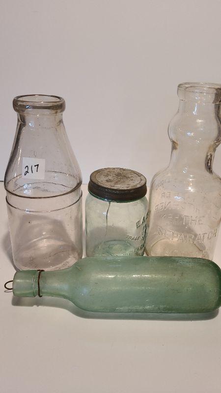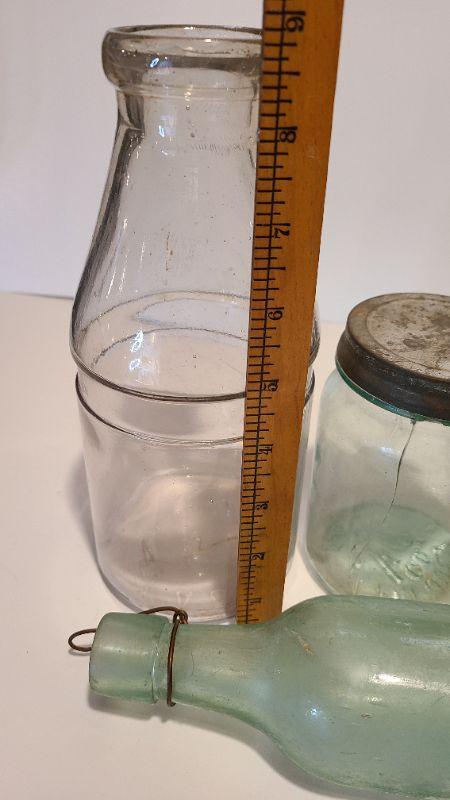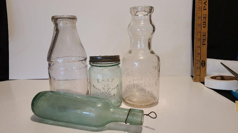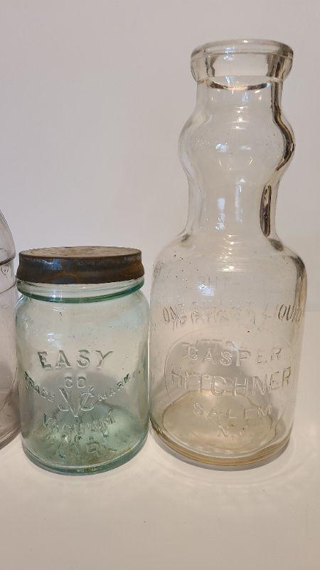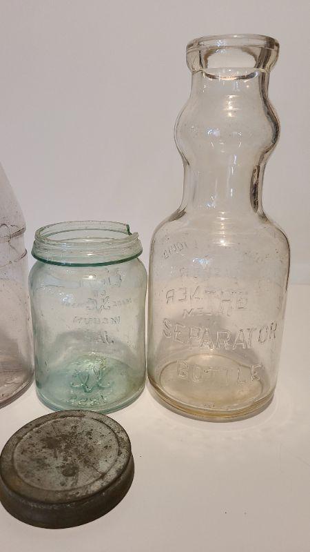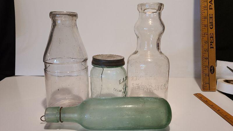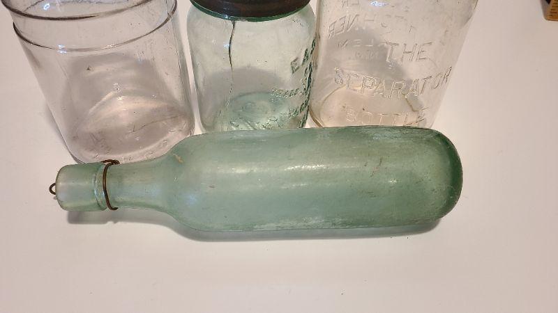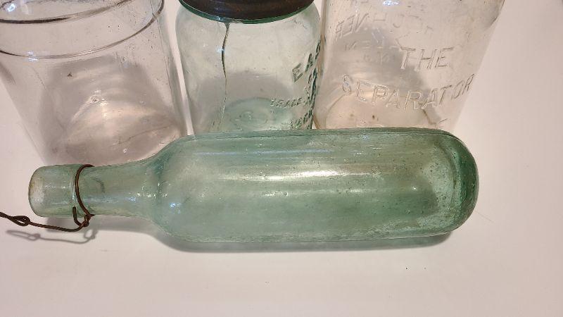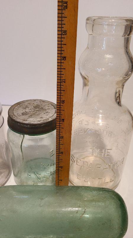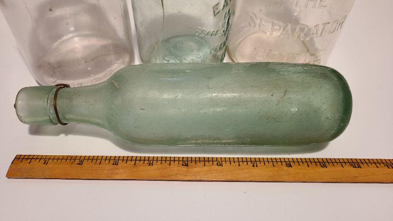 Unique Lot of bottles including a green irridescent round bottom blob top, and a rare Casper Hitchner Separator bottle. Each lot is unique and you will need to see all pictures. Pictures have been taken from all side to see condition and markings. What you see in the pictures is the actual content of the lot and the pictures are the best representation of the bottles. All bottles are sold-is according to the pictures. For further information please google the makers marks for age.