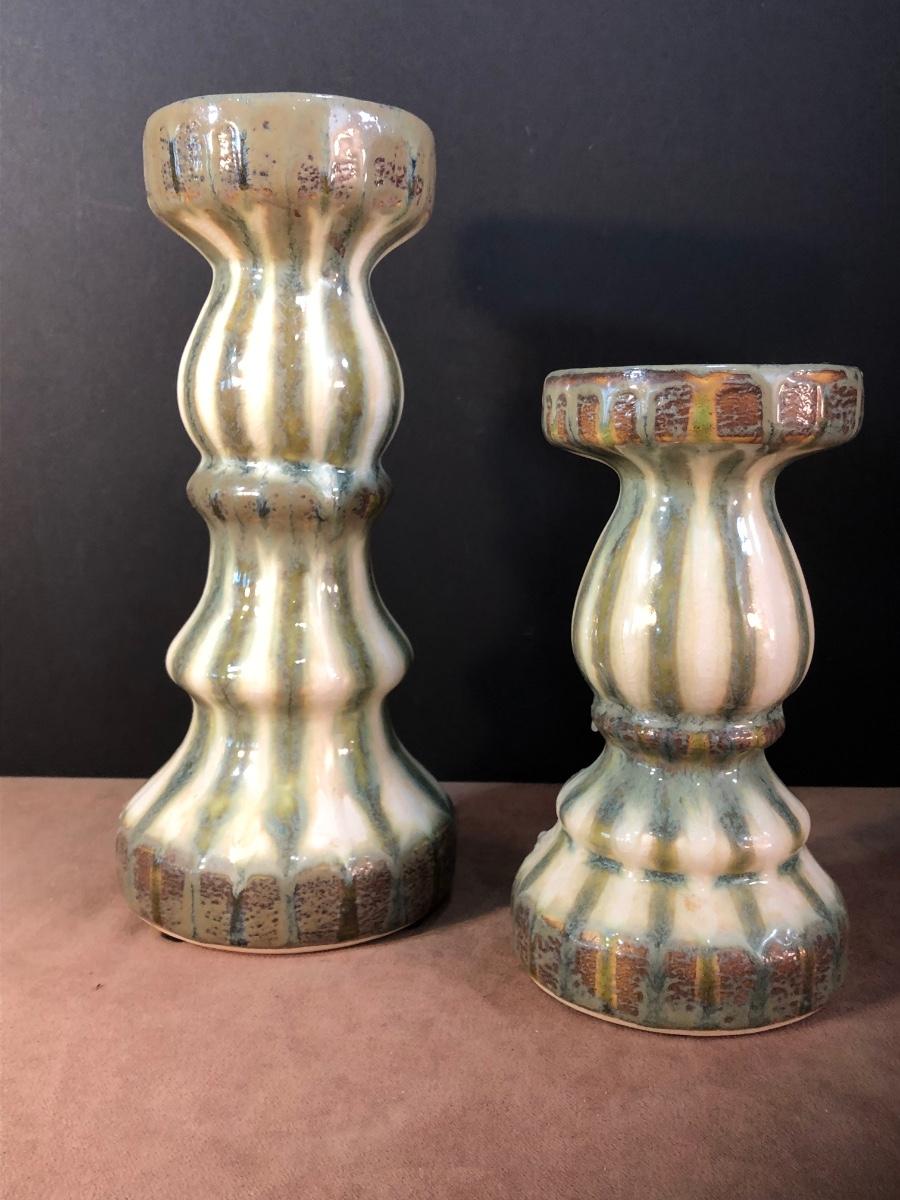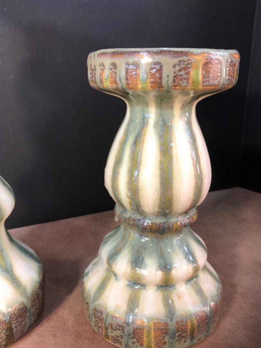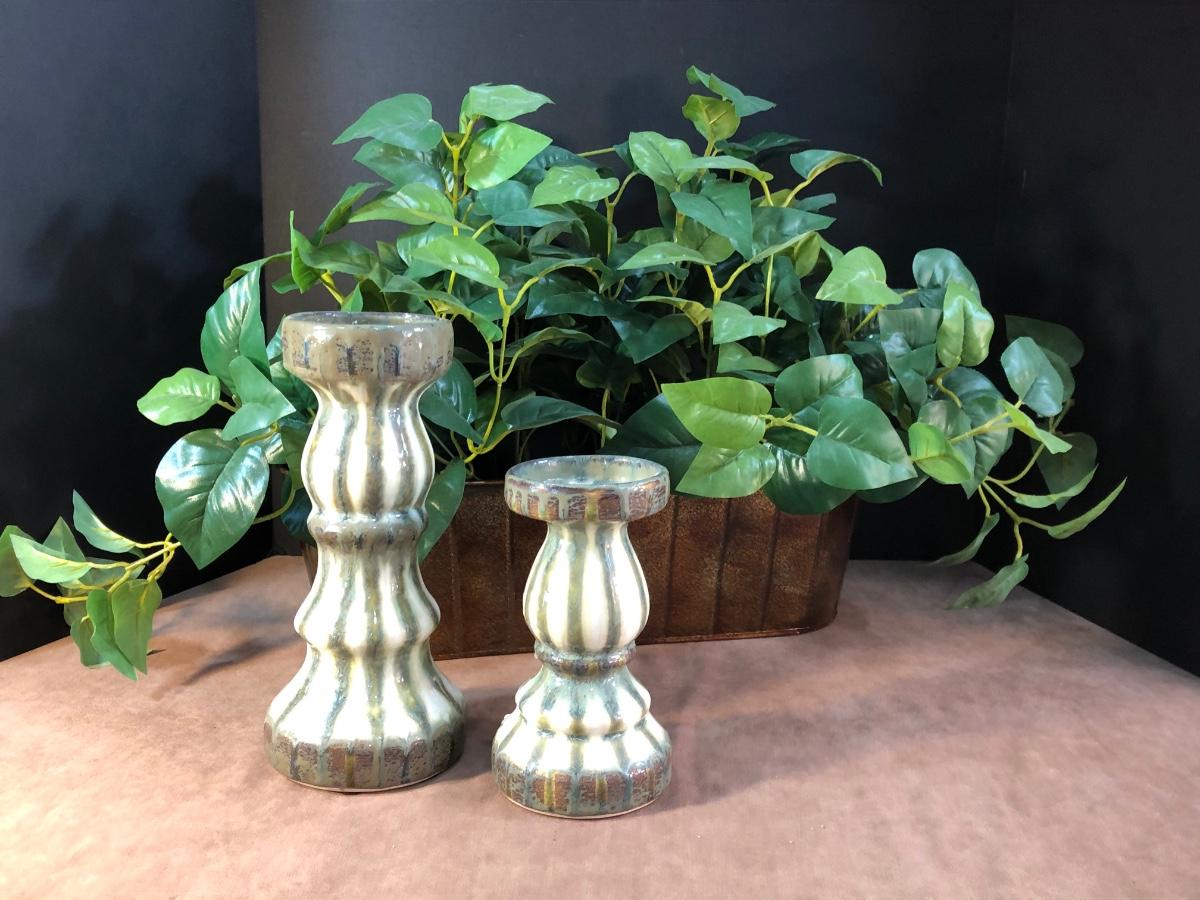 Silk arrangement in a brass-toned planter and a pair of hand-painted ceramic candle holders 9" & 7"