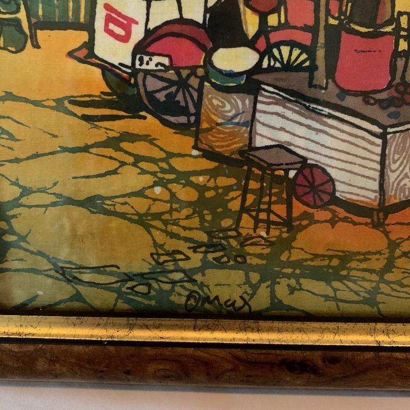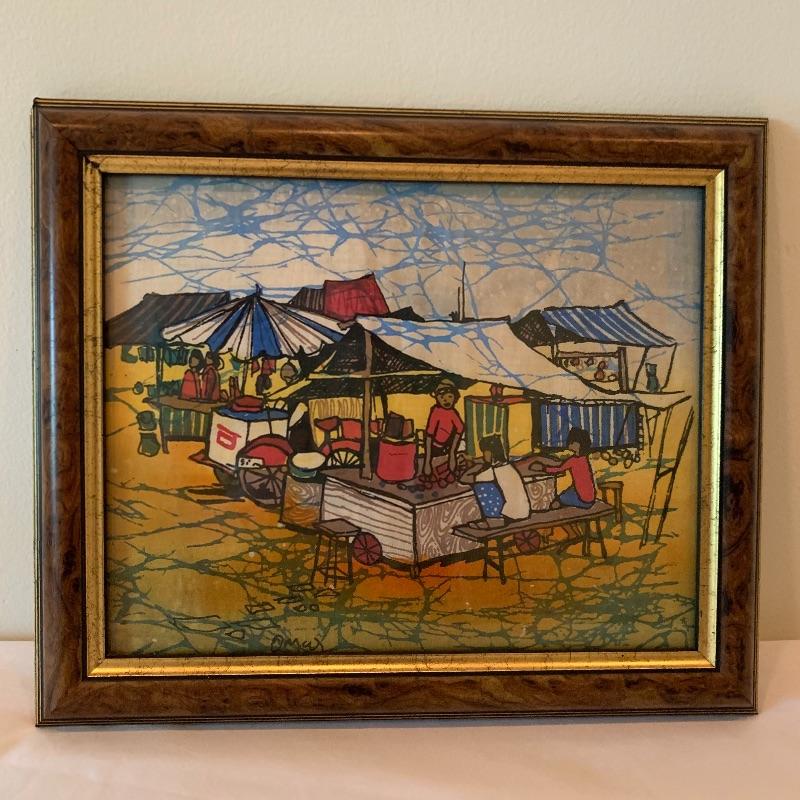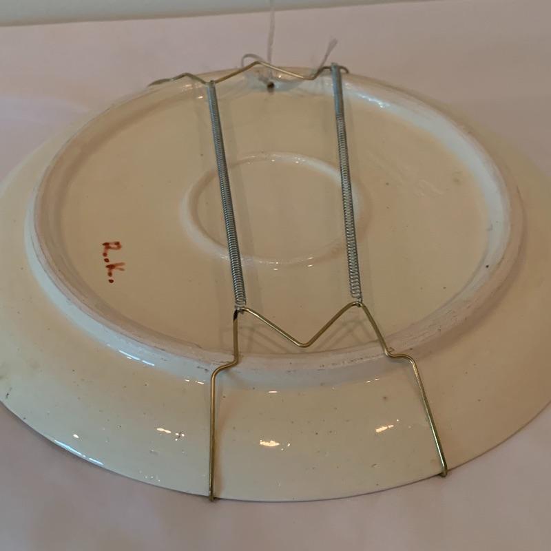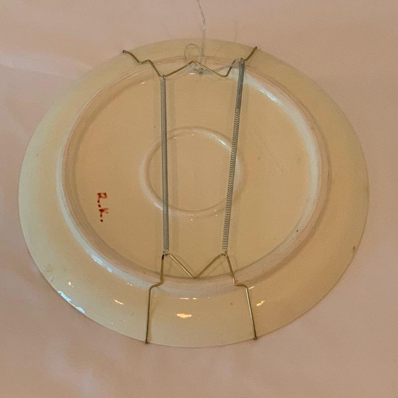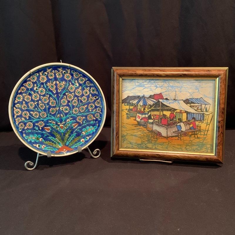 In this lot there is a lovely decorative plate and one framed piece of artwork. The plate has a floral motif with a blue background and red accent. It measures 10" in diameter. It has metal hardware attached to the back for hanging on a wall. There is also a piece of string attached through a hole in the back of the plate. It is signed with the initials "R.K.". Stand is not included. The artwork is in a frame that appears to be wood with an inner golden border. The art itself appears to be printed or painted on a piece if fabric. It is signed by "Omar", but it's unclear if it's an original signature. The frame measure 10.25" x 12". Shipping available.