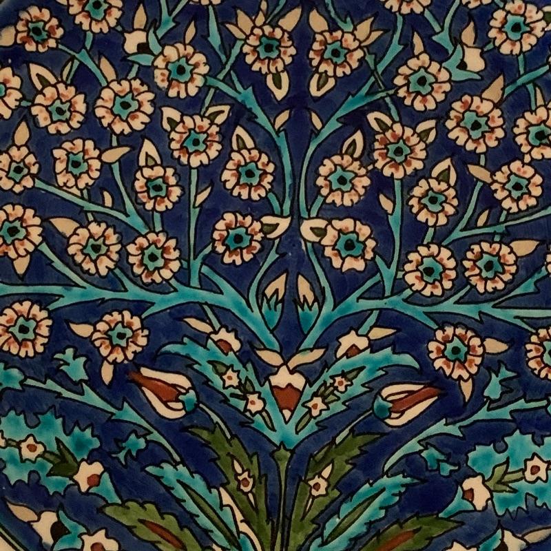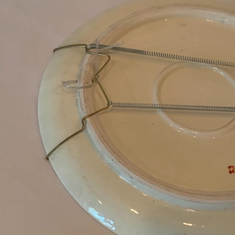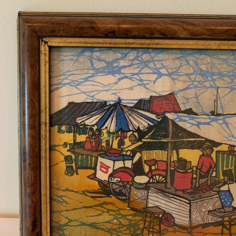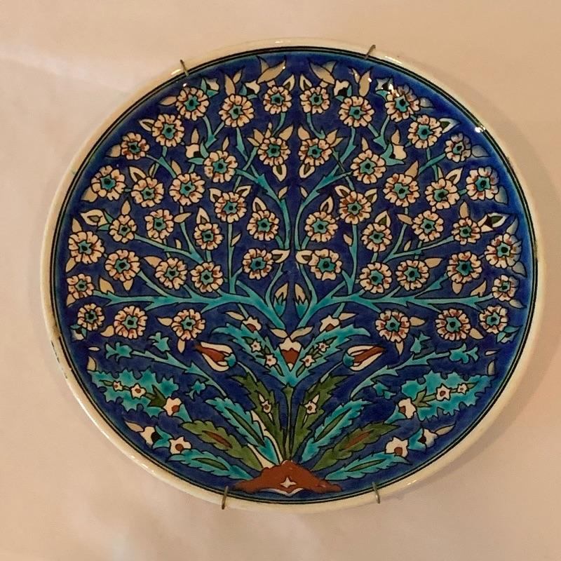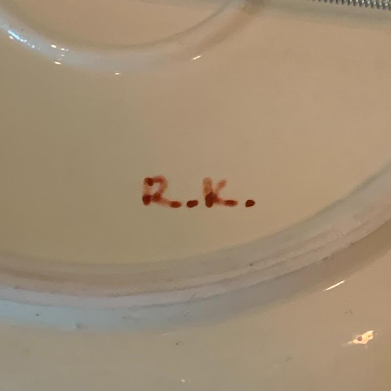 In this lot there is a lovely decorative plate and one framed piece of artwork. The plate has a floral motif with a blue background and red accent. It measures 10" in diameter. It has metal hardware attached to the back for hanging on a wall. There is also a piece of string attached through a hole in the back of the plate. It is signed with the initials "R.K.". Stand is not included. The artwork is in a frame that appears to be wood with an inner golden border. The art itself appears to be printed or painted on a piece if fabric. It is signed by "Omar", but it's unclear if it's an original signature. The frame measure 10.25" x 12". Shipping available.