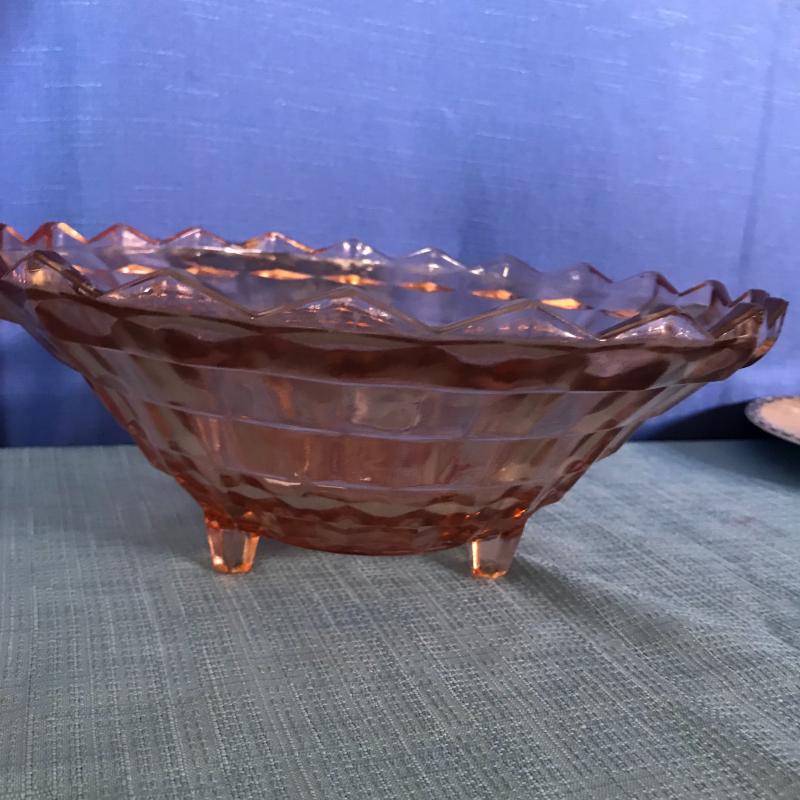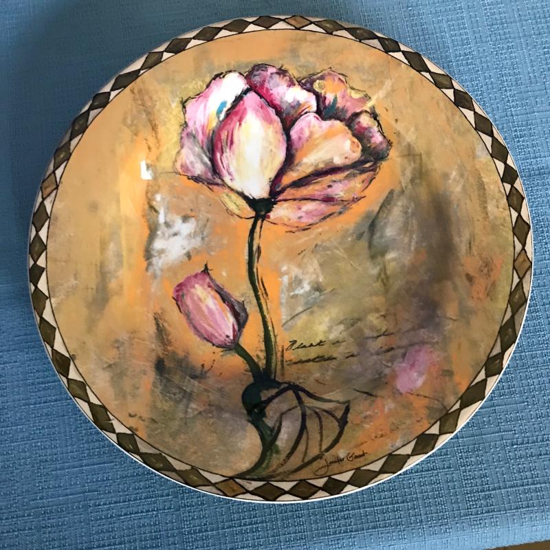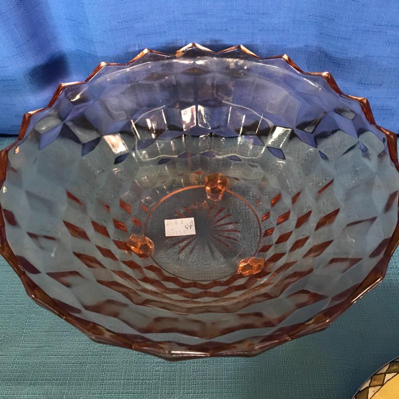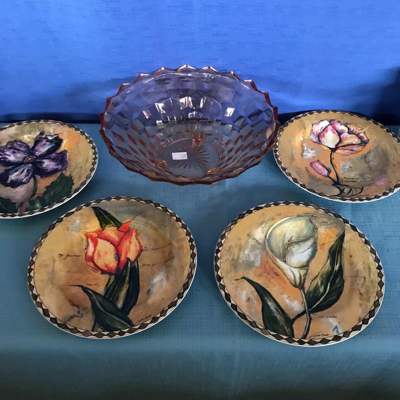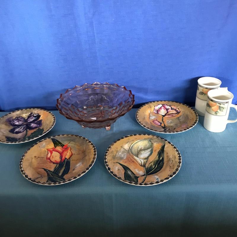Lot includes set of four Floral dessert plates with cardboard carrying case, two coffee mugs, and a Depression glass-like bowl (approx. 10” in diameter and 4” tall). No shipping available. Local pickup only in Maggie Valley, NC.