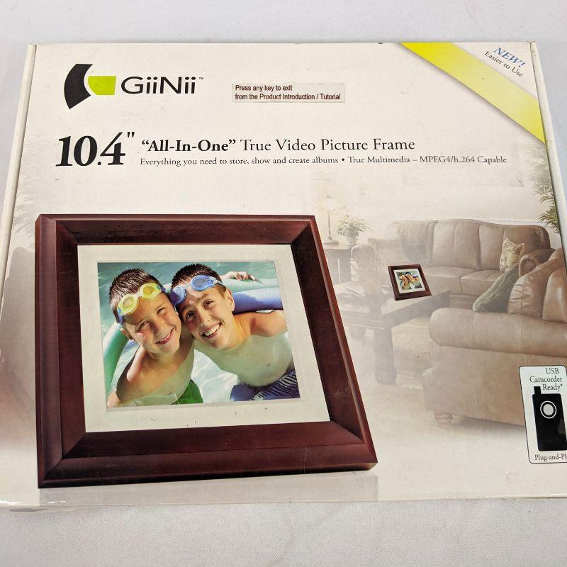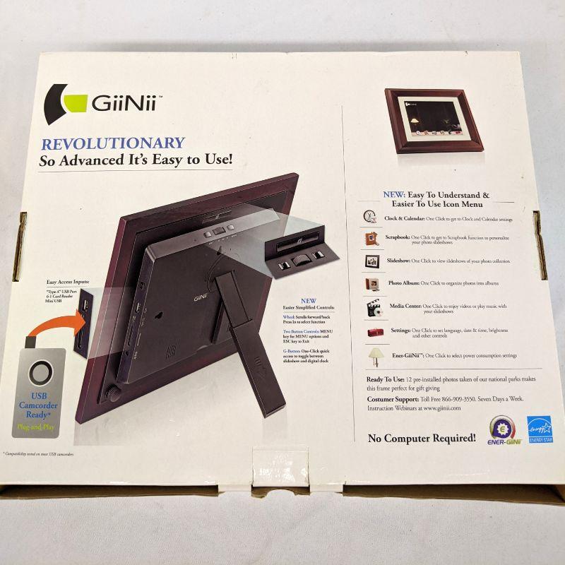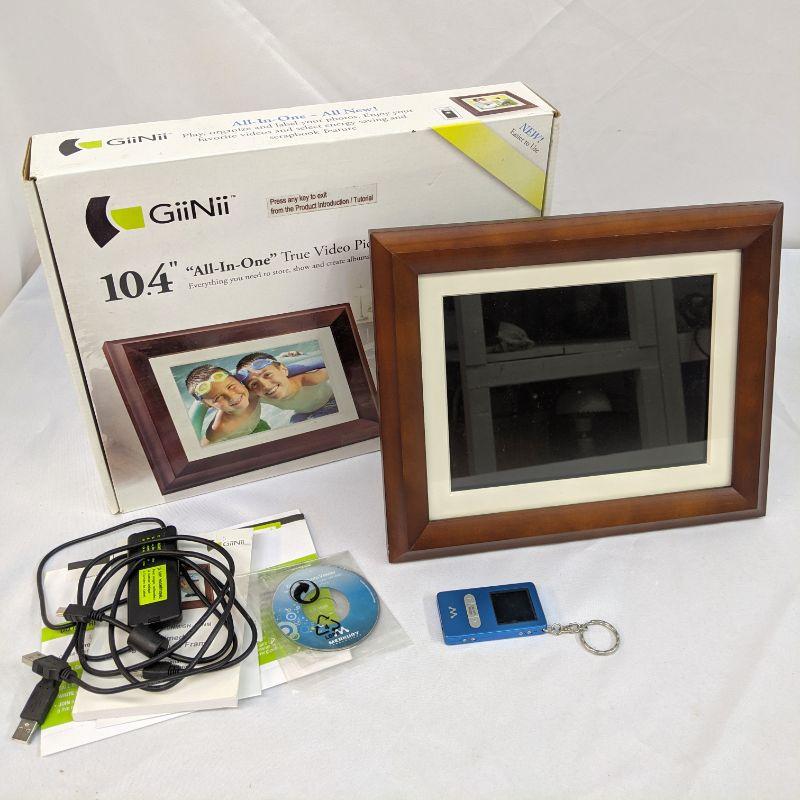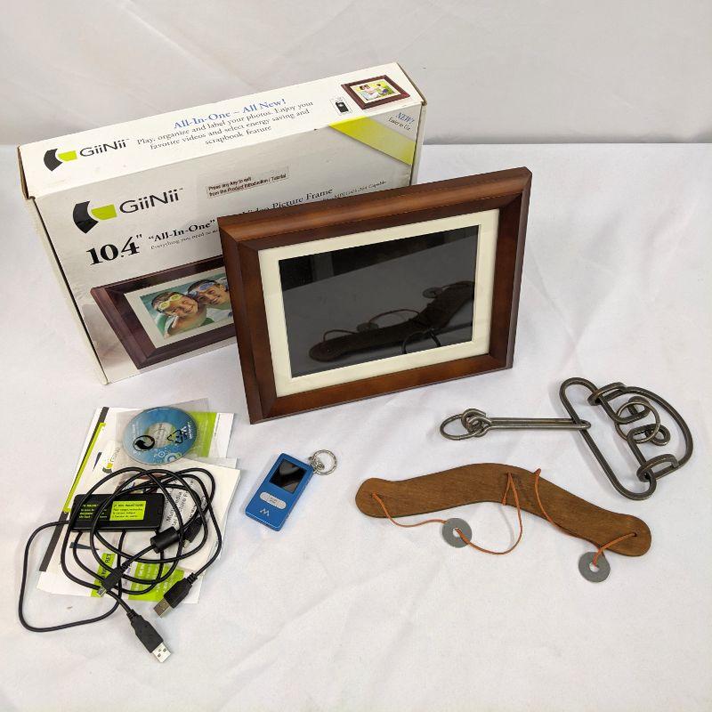 This lot includes a digital photo frame and two pub-style mind teaser puzzles. The digital photo frame is made by GiiNii. Use it to create and store photo albums. No computer required. All instruction manuals and cords are present. Even includes a digital photo key chain so you can take your memories with you. The two included puzzles, one metal and one wooden, are challenging and fun.