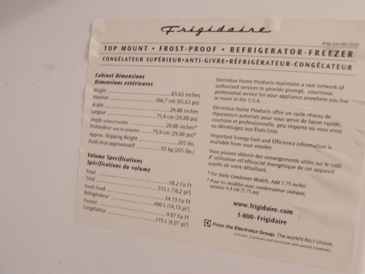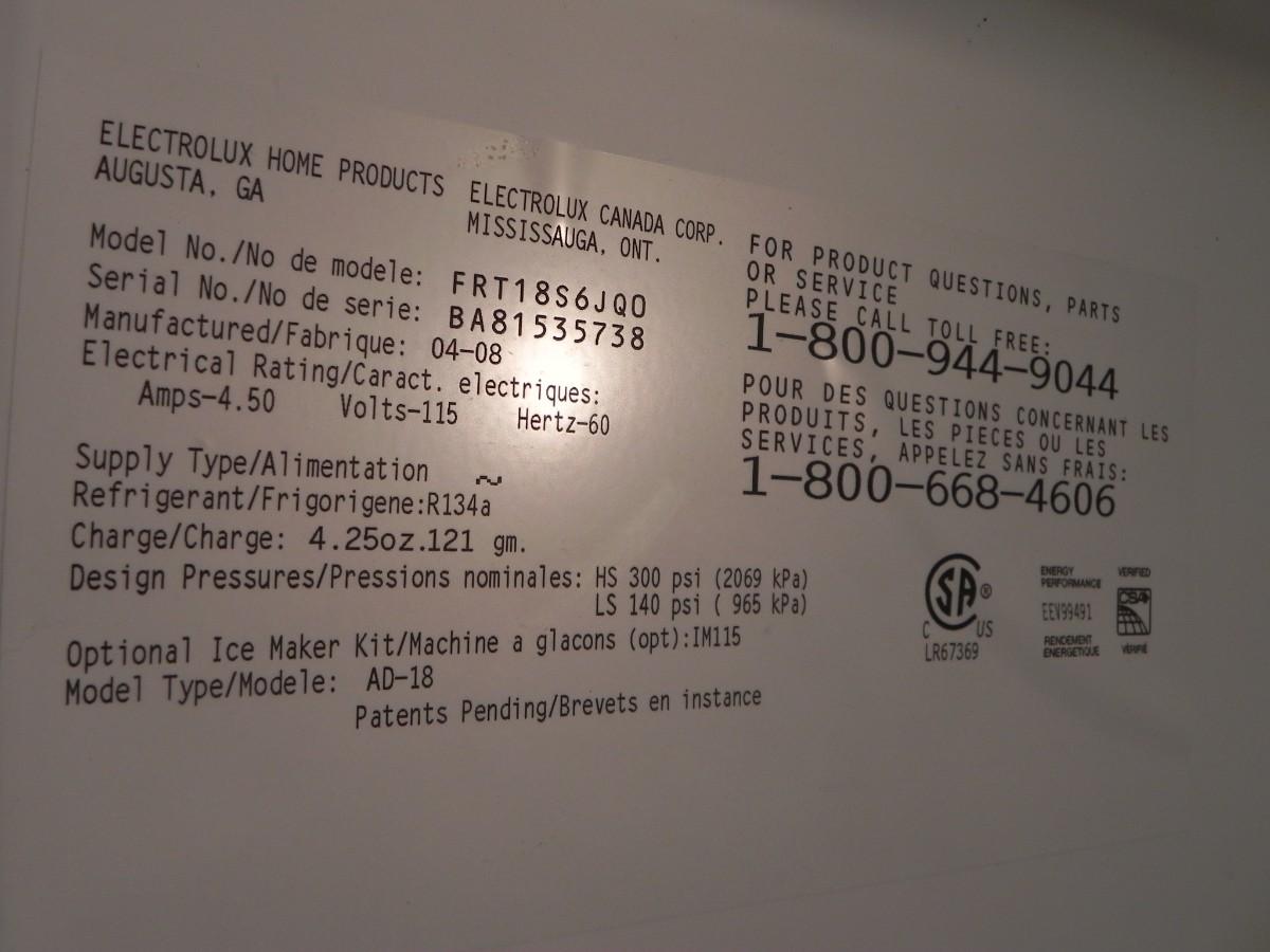 MODEL NO FRT18S6JQO, MANUFACTURED DATE 4/08,