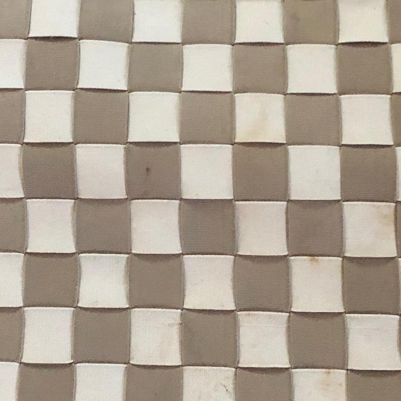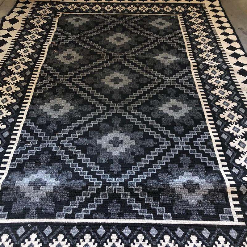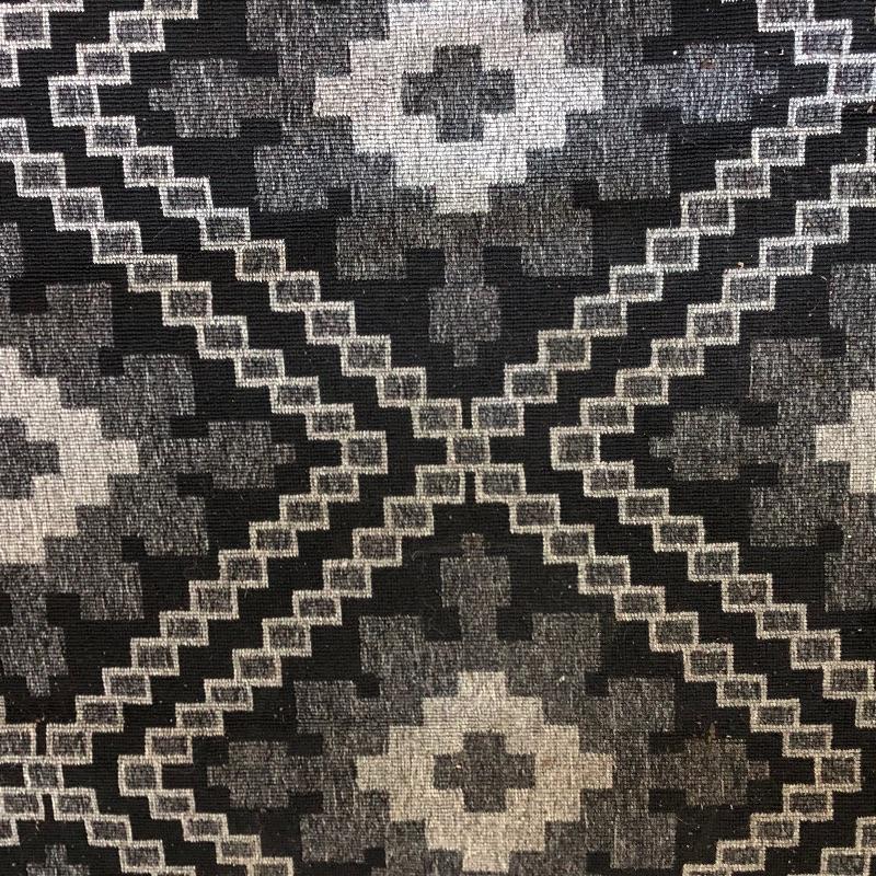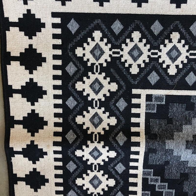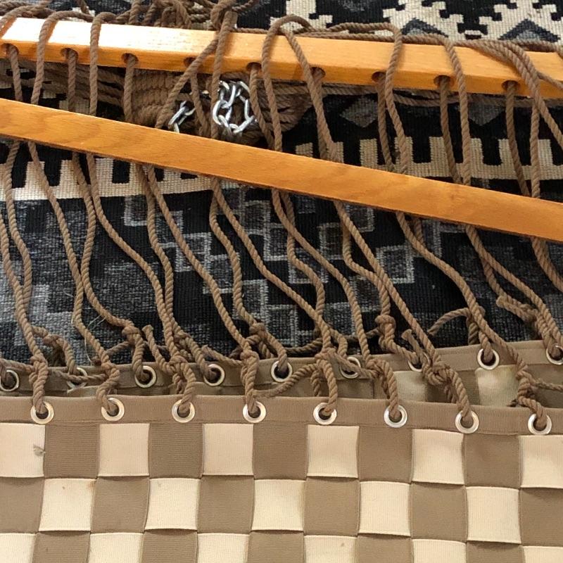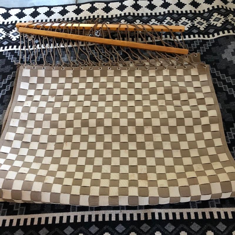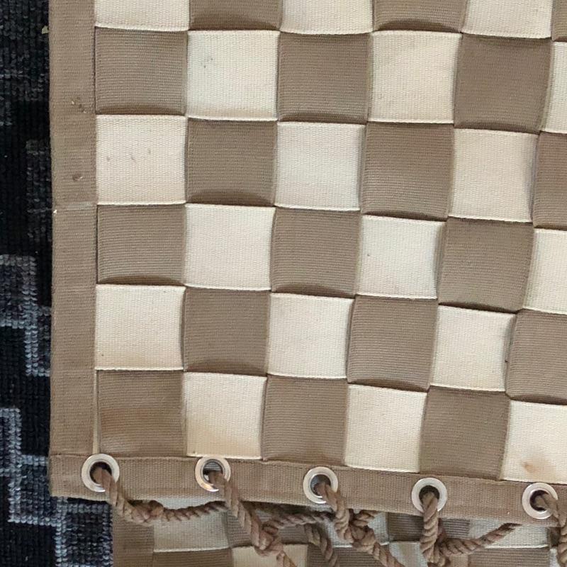 Large outdoor rug in nice condition with pattern and black to grey tones with tan accents. Is a bit bumpy from storage but should smooth out once laid flat. Sweet cream and brown checked hammock made of heavy duty cloth straps crisscrossed together for added durability is ready to hang on your covered porch, 4 season room or between your favorite trees. Both slightly stained from the elements.