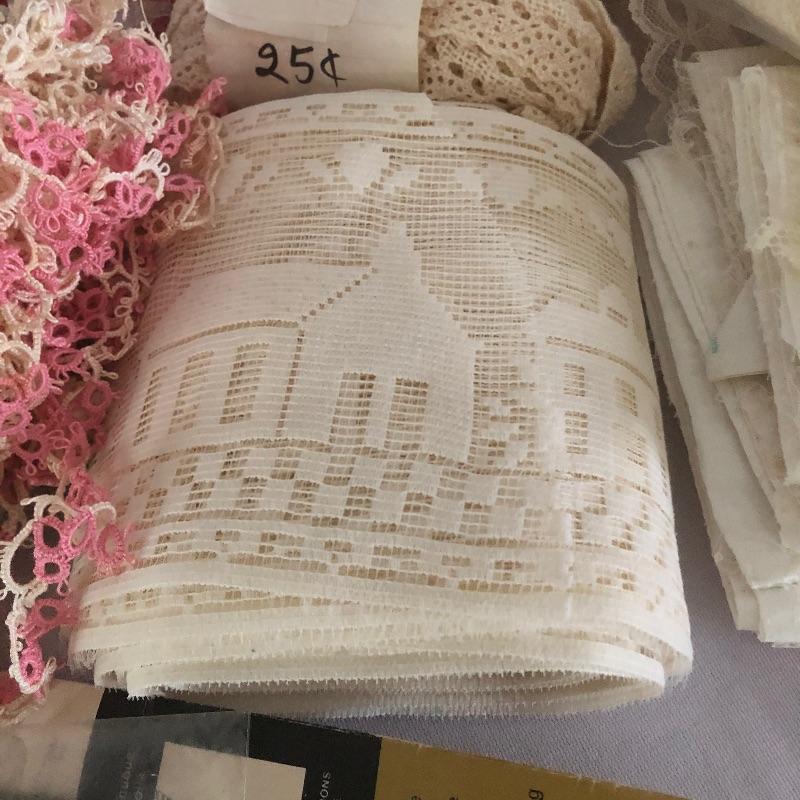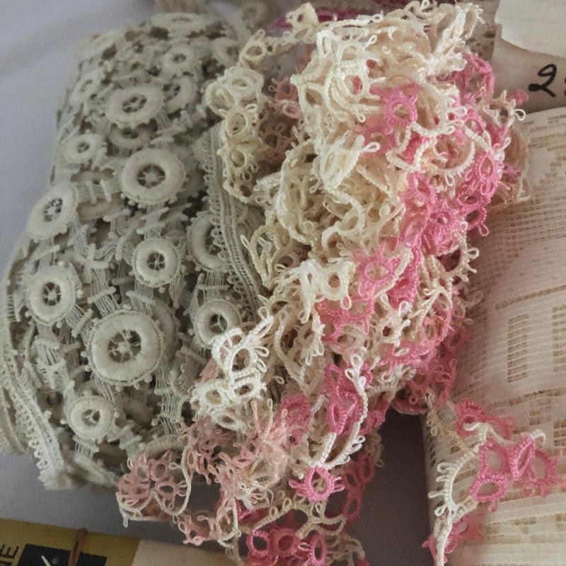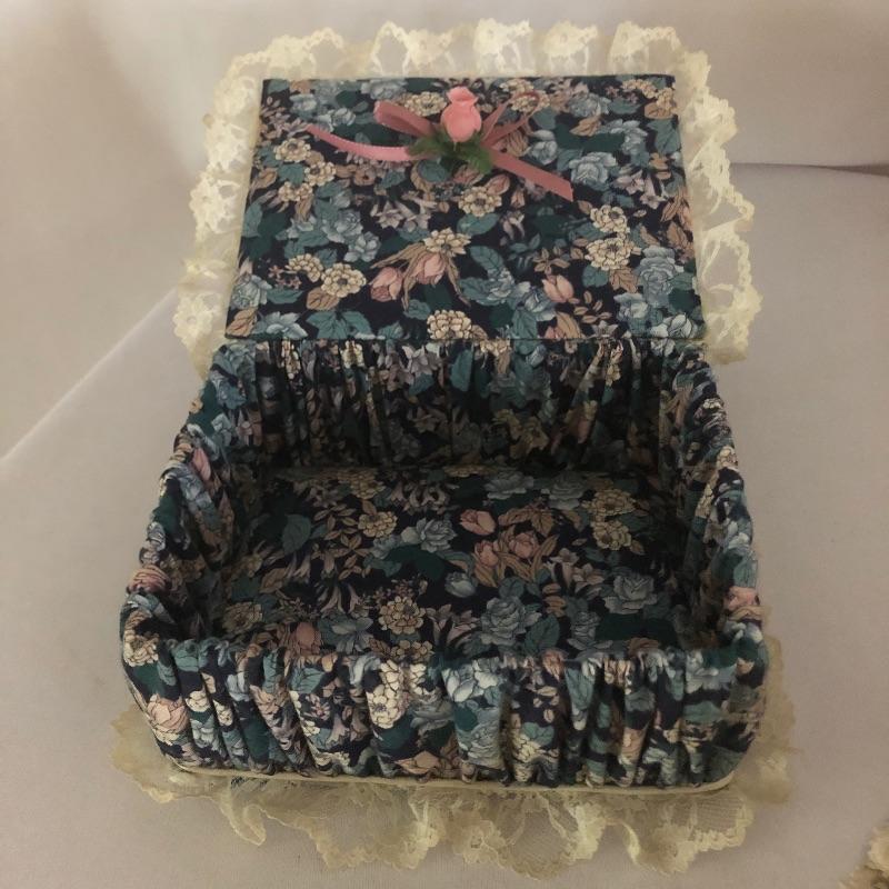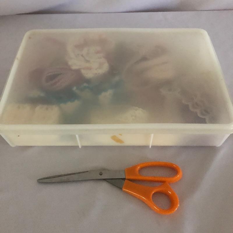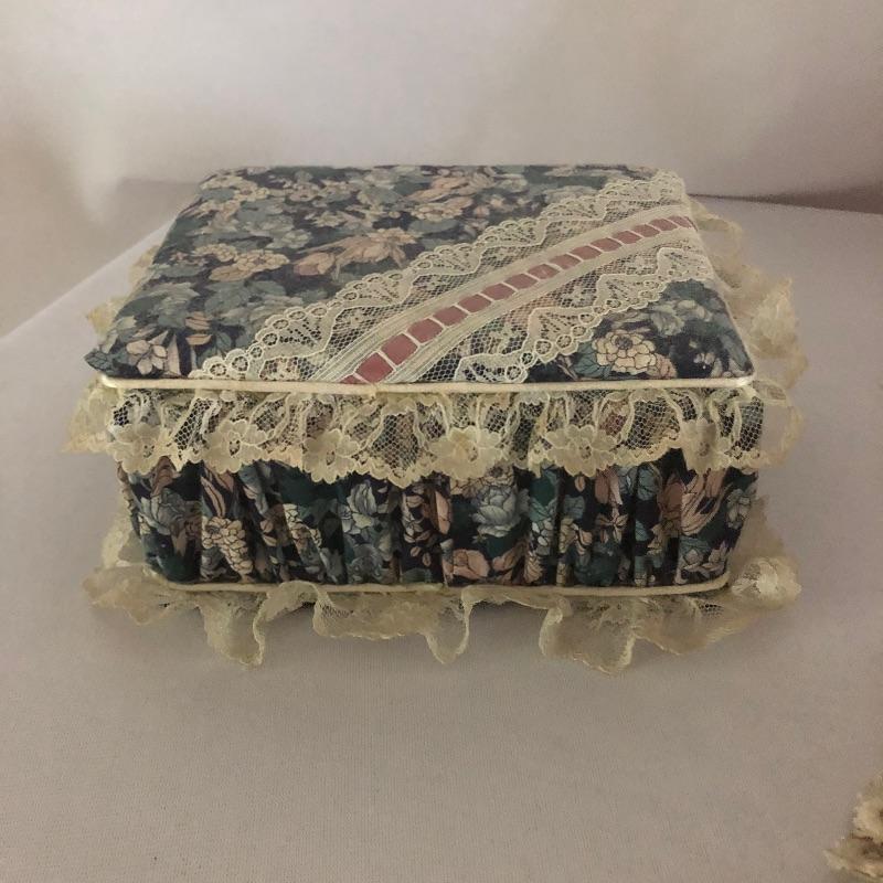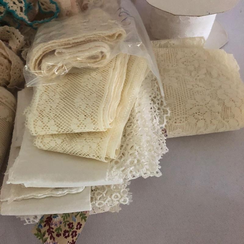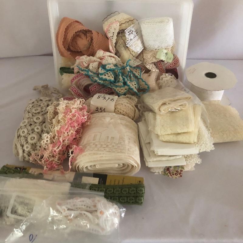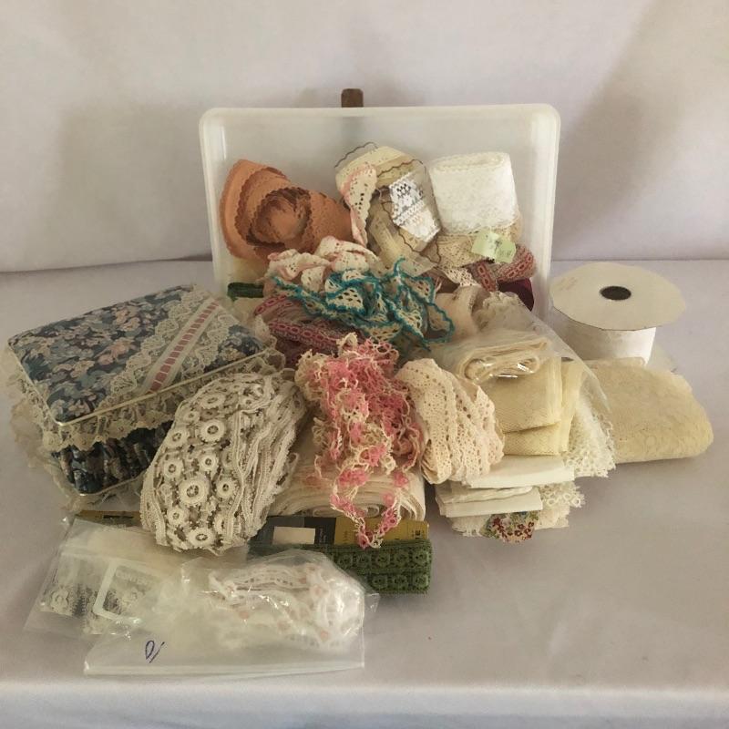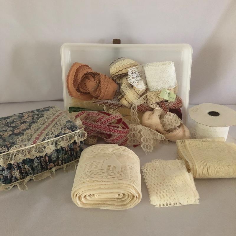 Large assortment of lace and trim in this lot, see images. A handy small lidded storage box comes with this lot as does a pair of scissors and a cute fabric box perfect for sewing essentials.