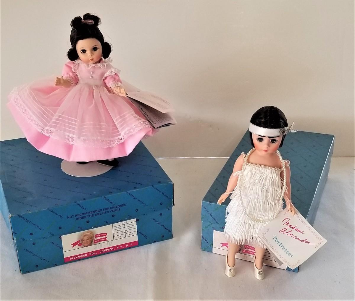Two collectible Madame Alexander dolls with the original boxes. We have Beth from the classic Little Women and a Flapper from the Portrettes Series of fashion dolls. Both about 8" tall.