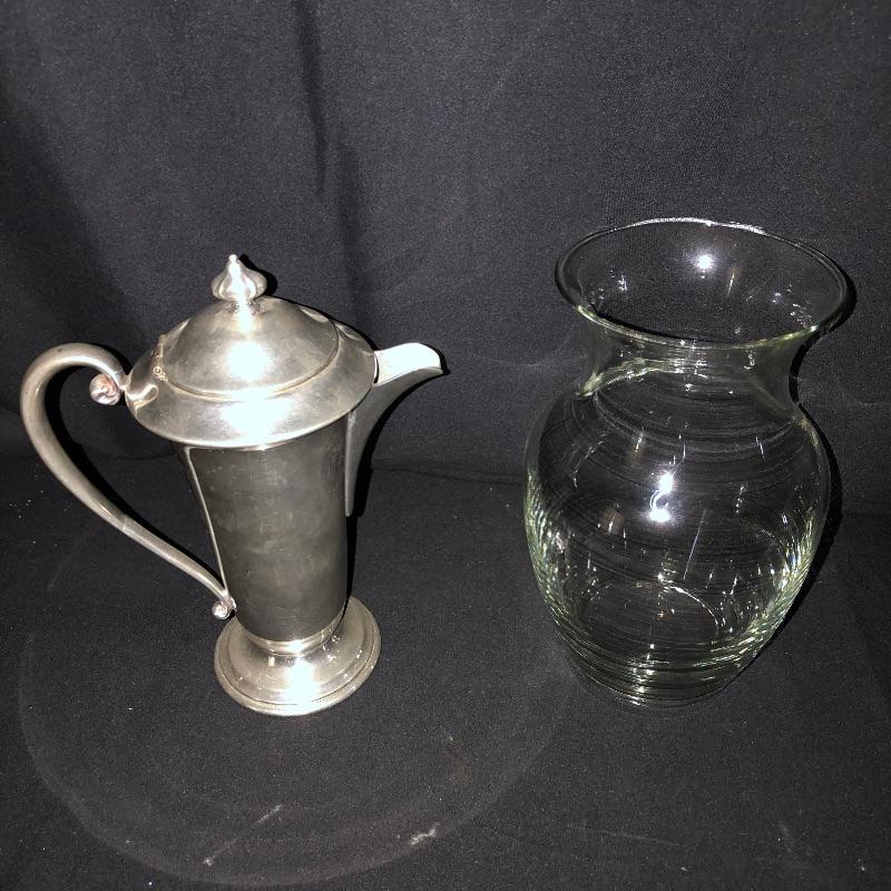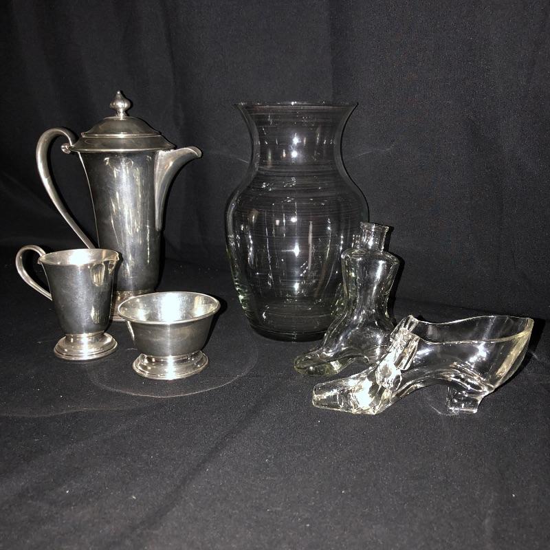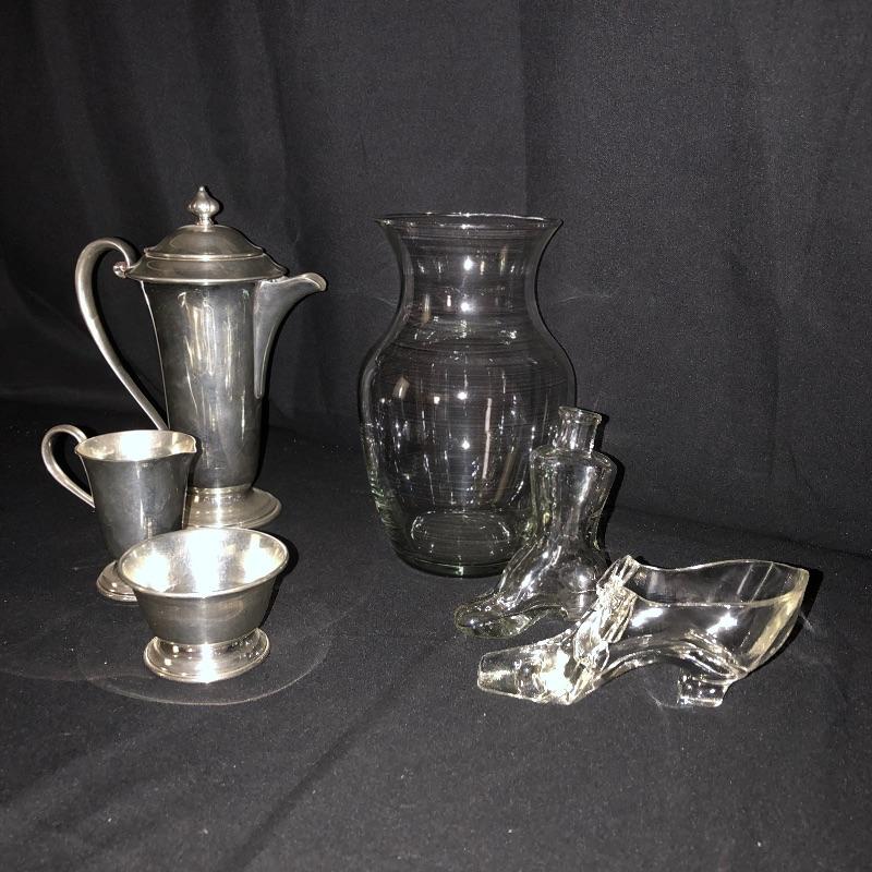This lot includes a small adorable pitcher (7”w x 9”h) made out of pewter, along with matching creamer and sugar set. You'll also find a small glass shoe figurines that can be used for decoration and more. Along with these comes a glass vase(8”h x 4”w) perfect for holding flowers or just for decoration. Shipping available.
