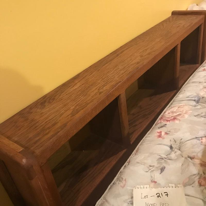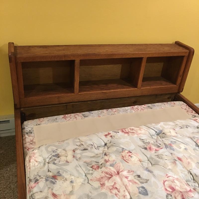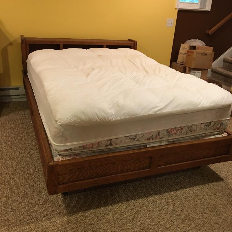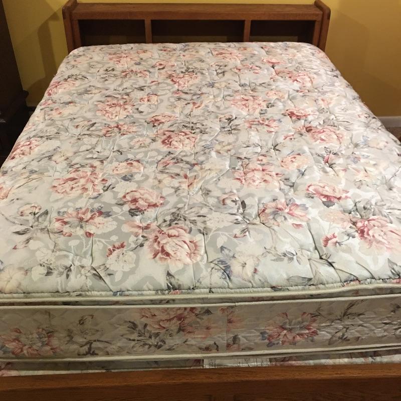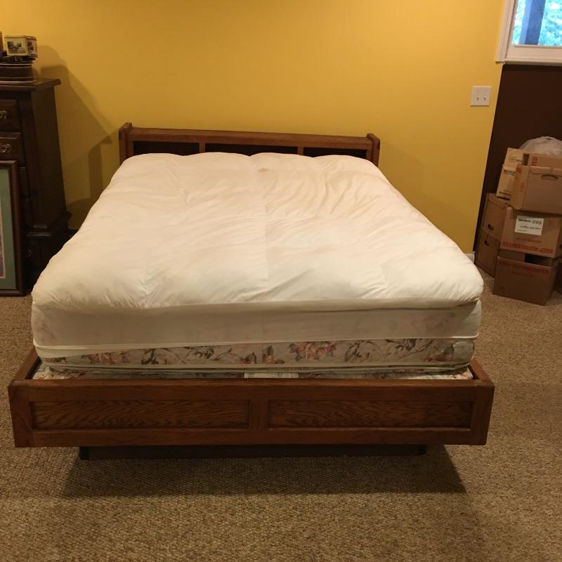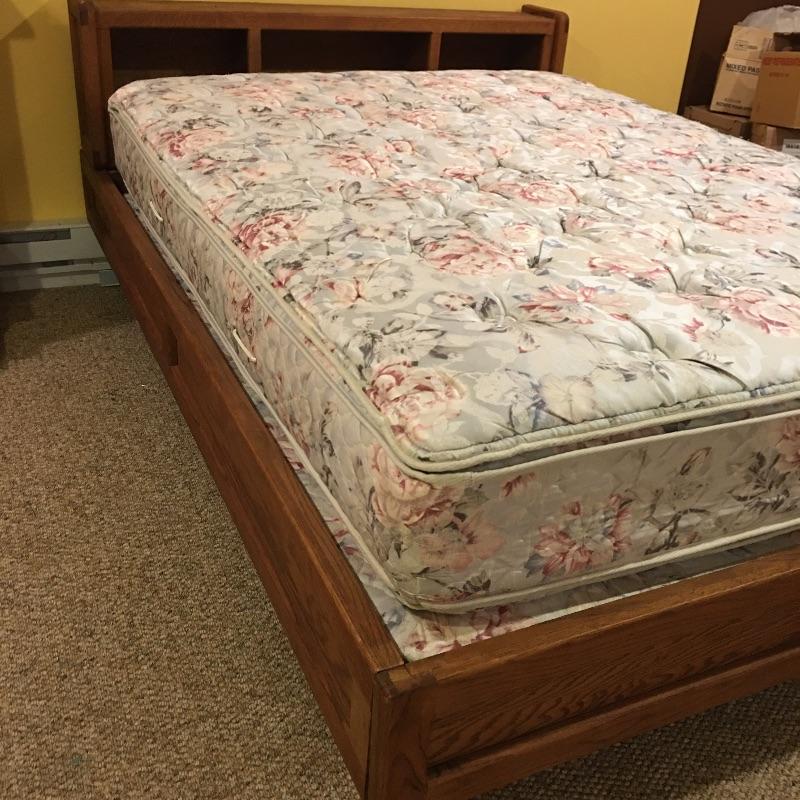 This queen size wood framed bed with a bold design will look great in your home. Bed has a platform and storage in the headboard. Some touch up stain or refinishing would be lovely, but piece is great and sturdy as is. Posturepedic Mattress and box spring are available to buyer at no charge if they would like to have the whole set, mattress comes from a house with pets. Previous owner has stated it is a converted waterbed.