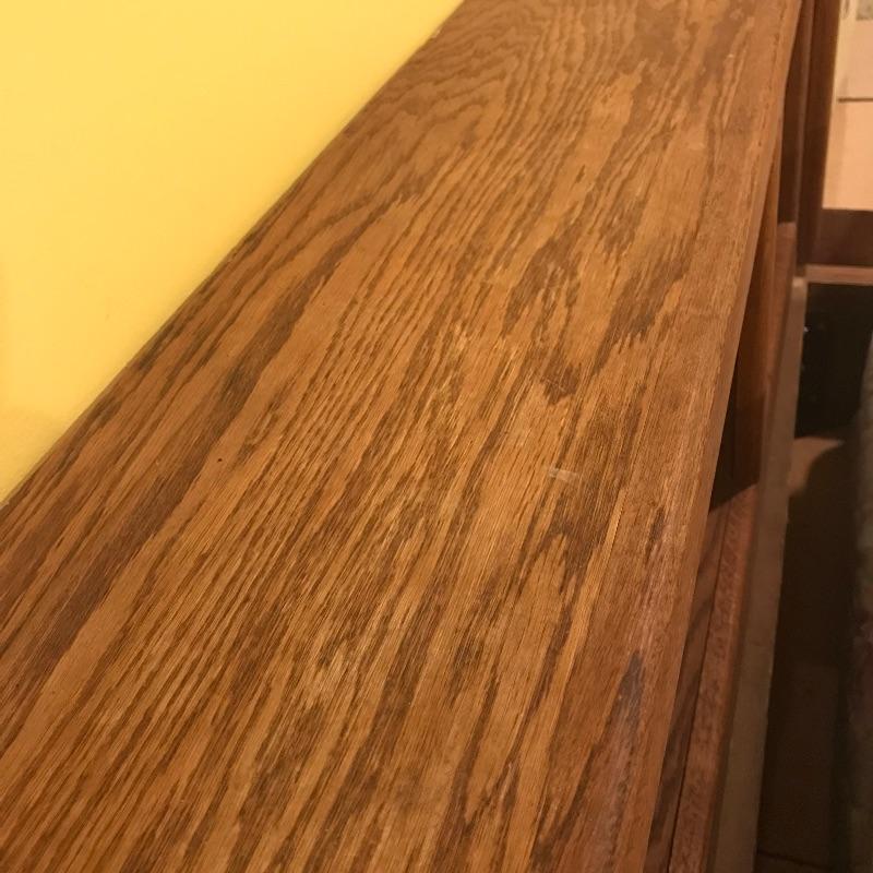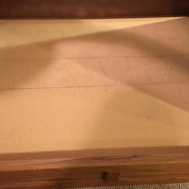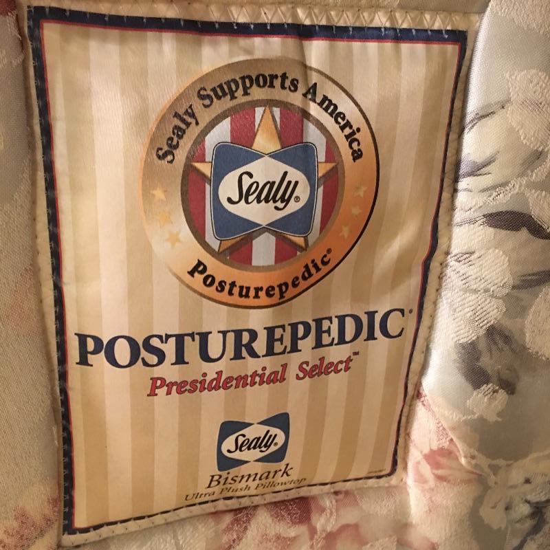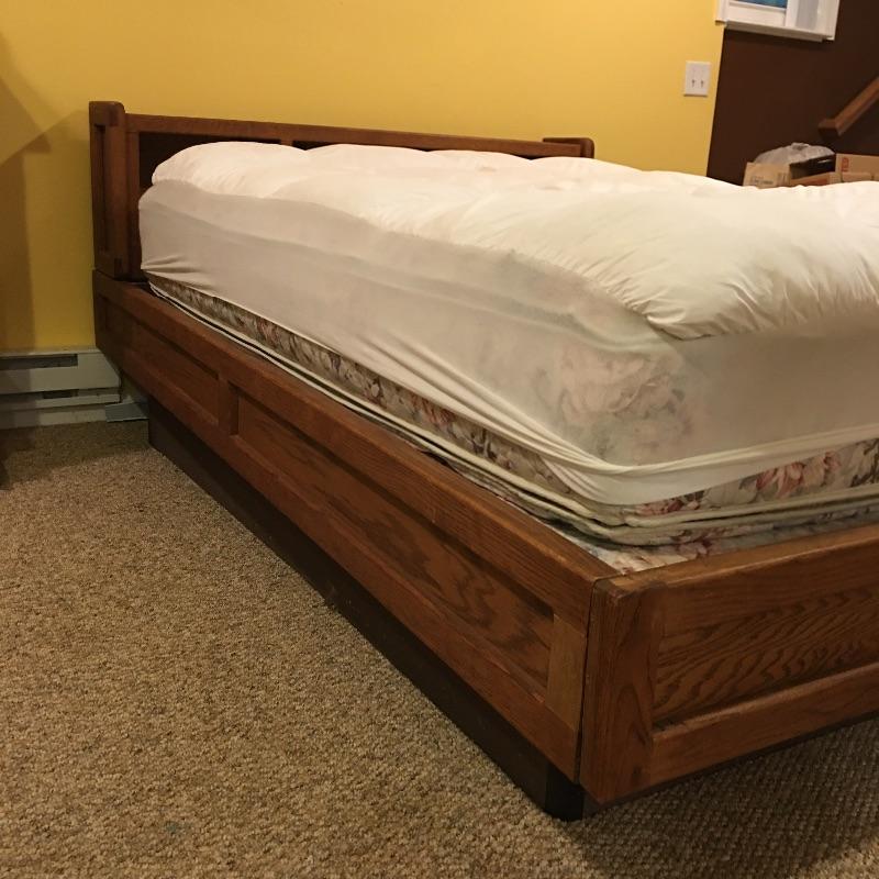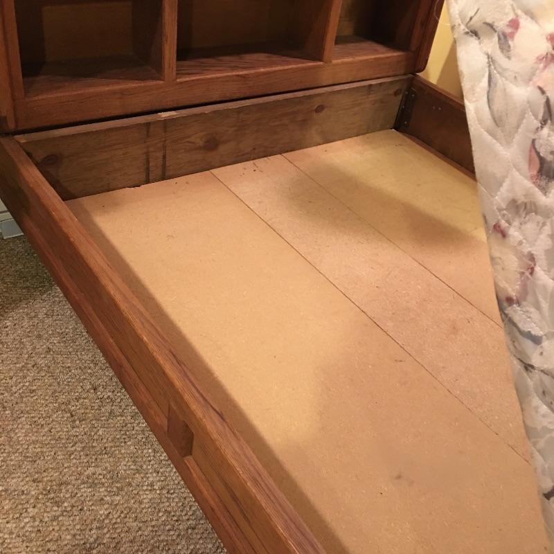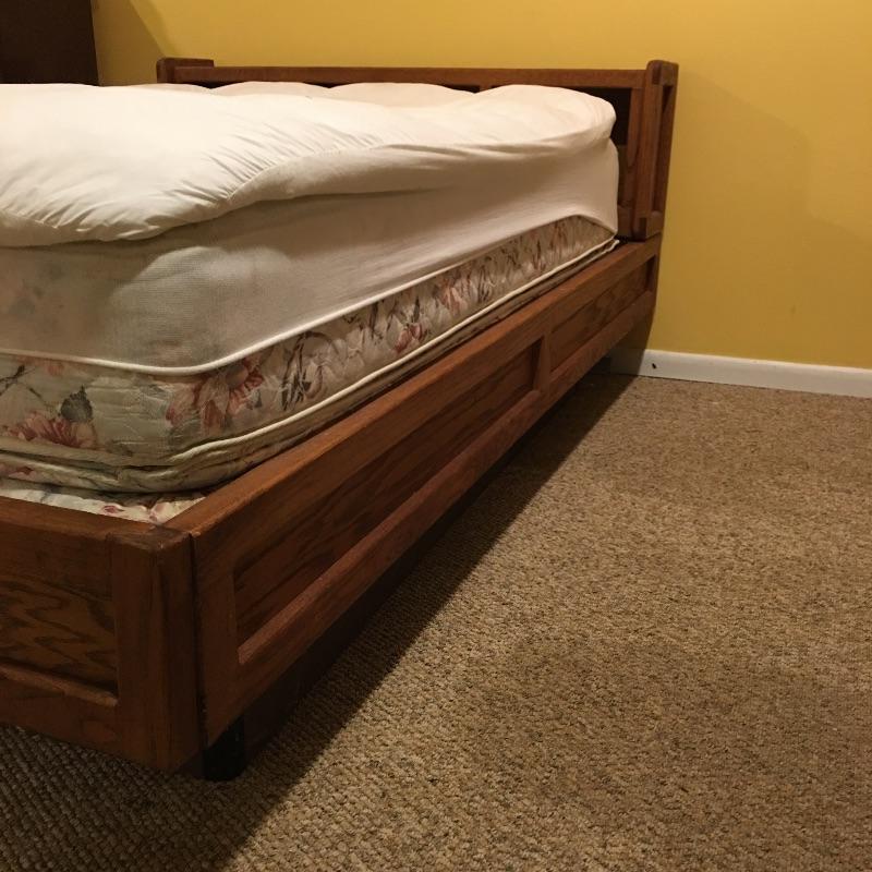 This queen size wood framed bed with a bold design will look great in your home. Bed has a platform and storage in the headboard. Some touch up stain or refinishing would be lovely, but piece is great and sturdy as is. Posturepedic Mattress and box spring are available to buyer at no charge if they would like to have the whole set, mattress comes from a house with pets. Previous owner has stated it is a converted waterbed.