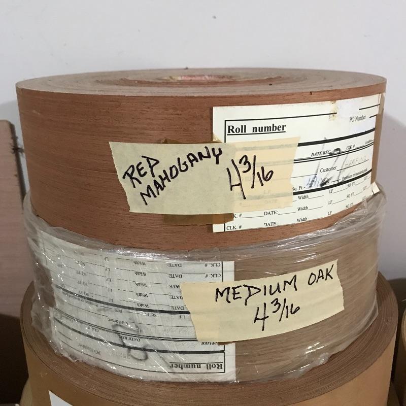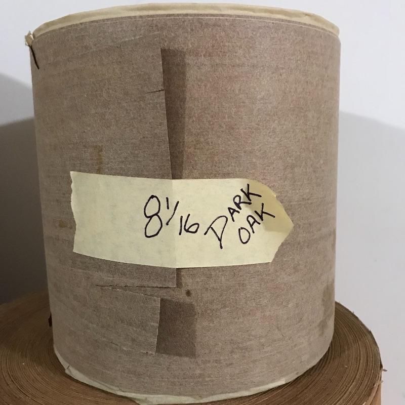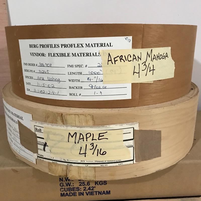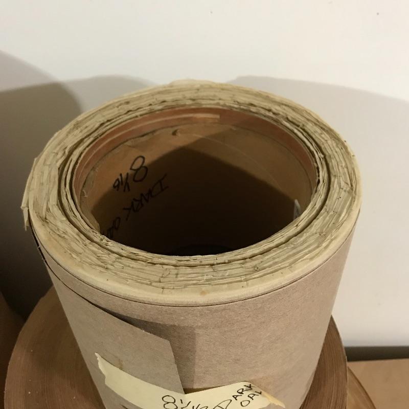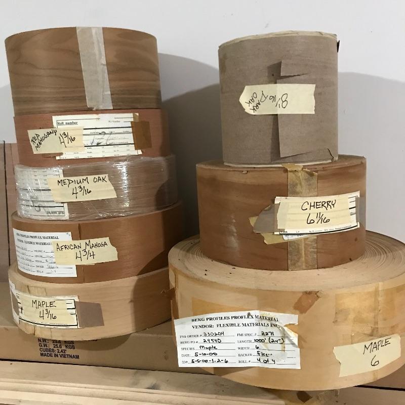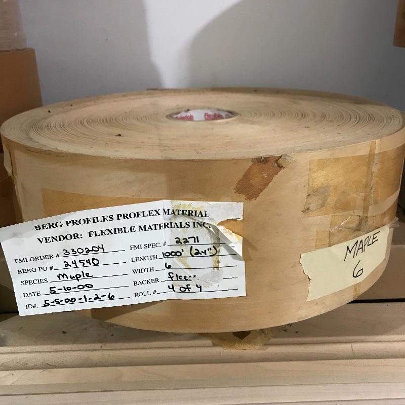 First of four rolled laminate lots. Eight rolls of various size and wood type laminate. Each roll is labeled with width. See photos. No shipping.