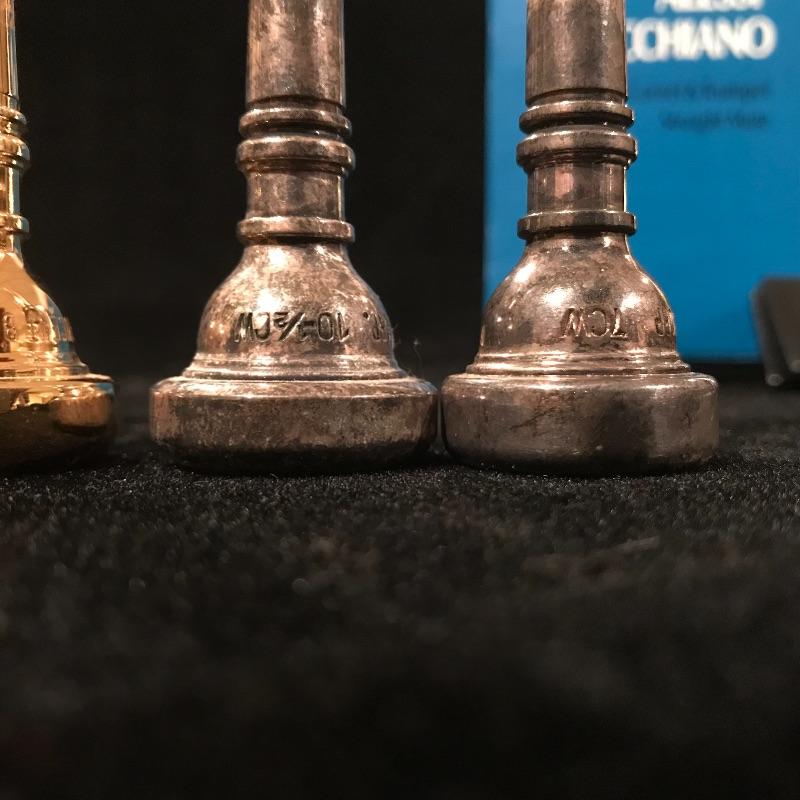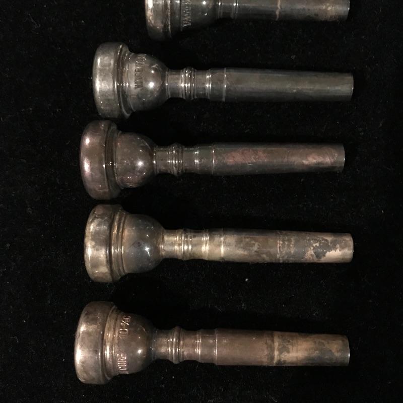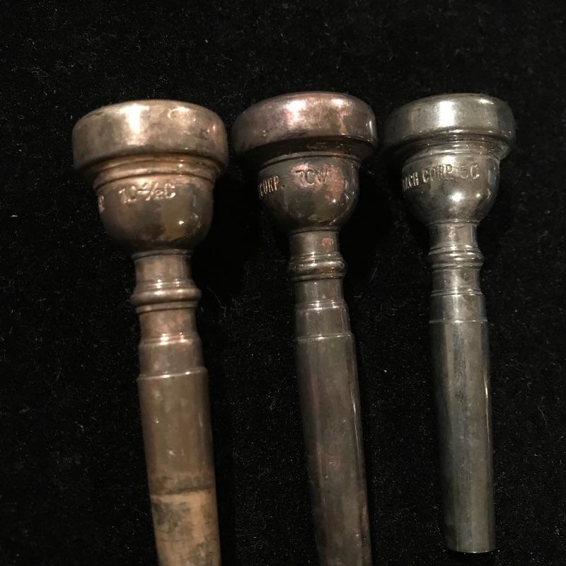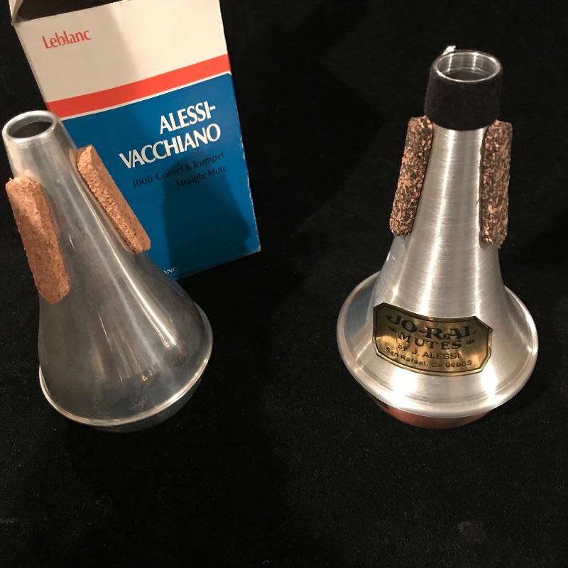 What you need and want to accompany one of the many trumpets lotted 204-216! A Jo-Ral mute boasting a copper bottom and an Alessi Vacchiano, “The In-Tune Mute”! The Alessi has a cork side that is present, but not attached. Four 3.5” mouthpieces (three marked Bach and one marked “ZC” along with five 3” mouthpieces (one Yamaha and four Bach). Lot also includes sheet music for trumpets, big band, Merit Rag and more! See photos for entire lot inventory. Shipping available.