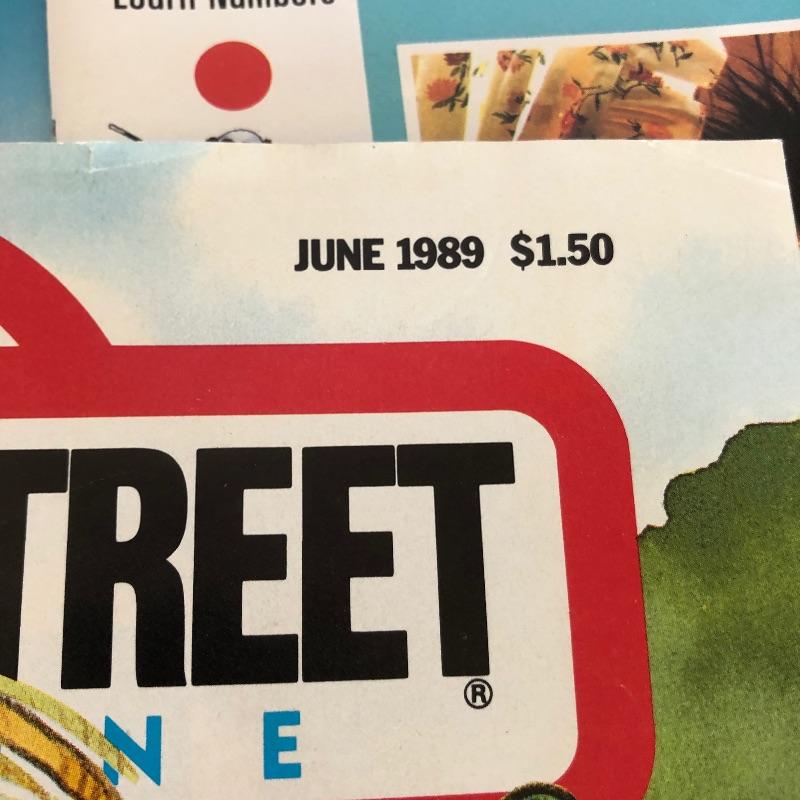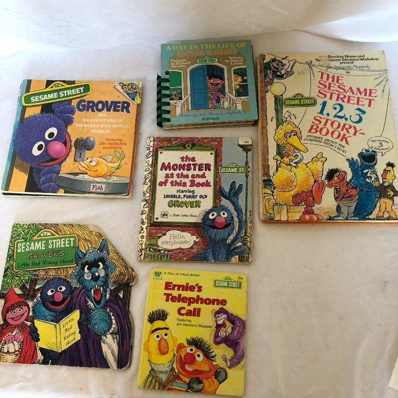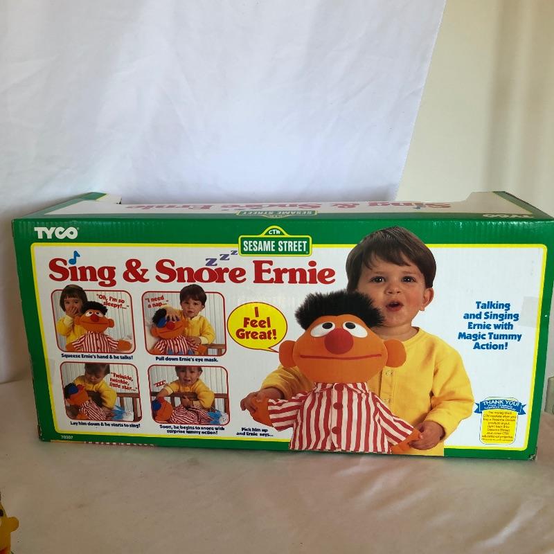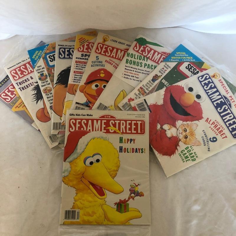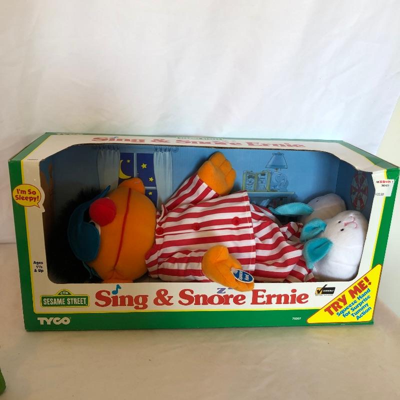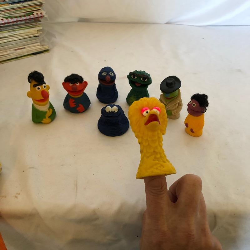 This is a fabulous lot of vintage Sesame Street that includes a new in box Sing & Snore Ernie, finger puppets, an assortment of books, a hand puppet, tons of magazines (11 are unopened) mostly from the early nineties and more.