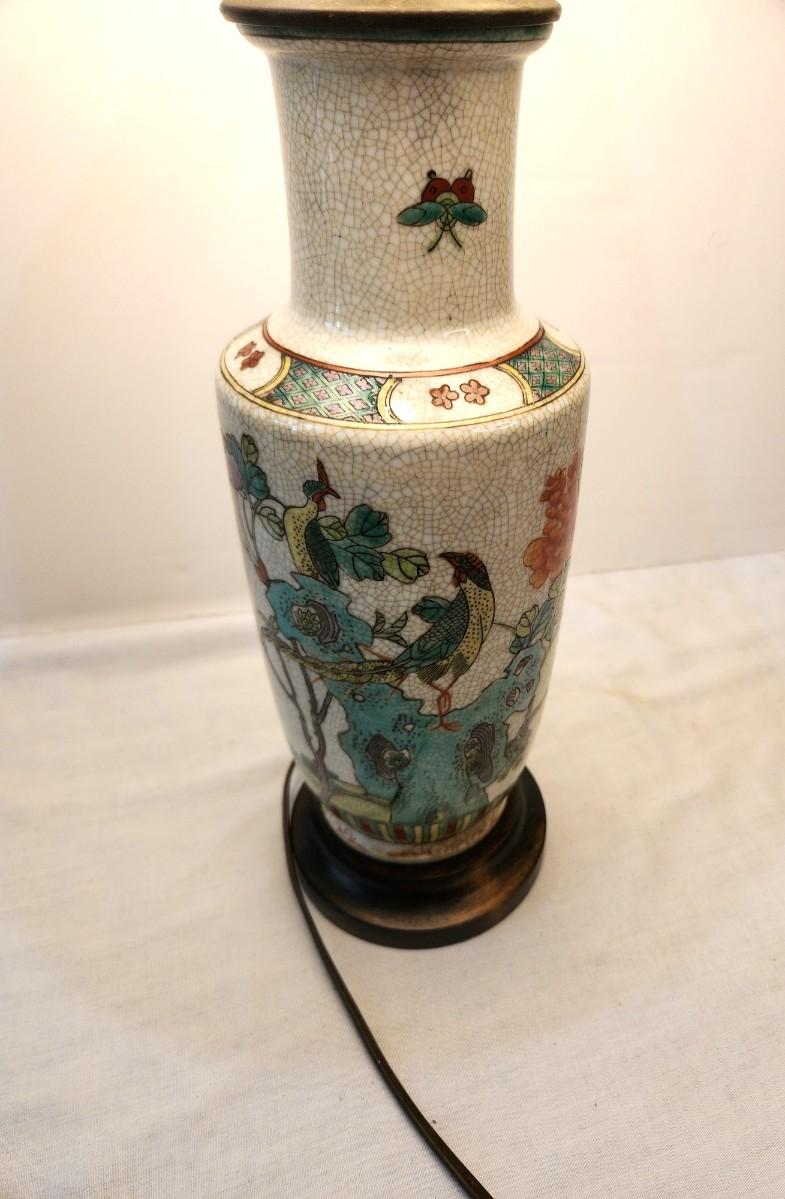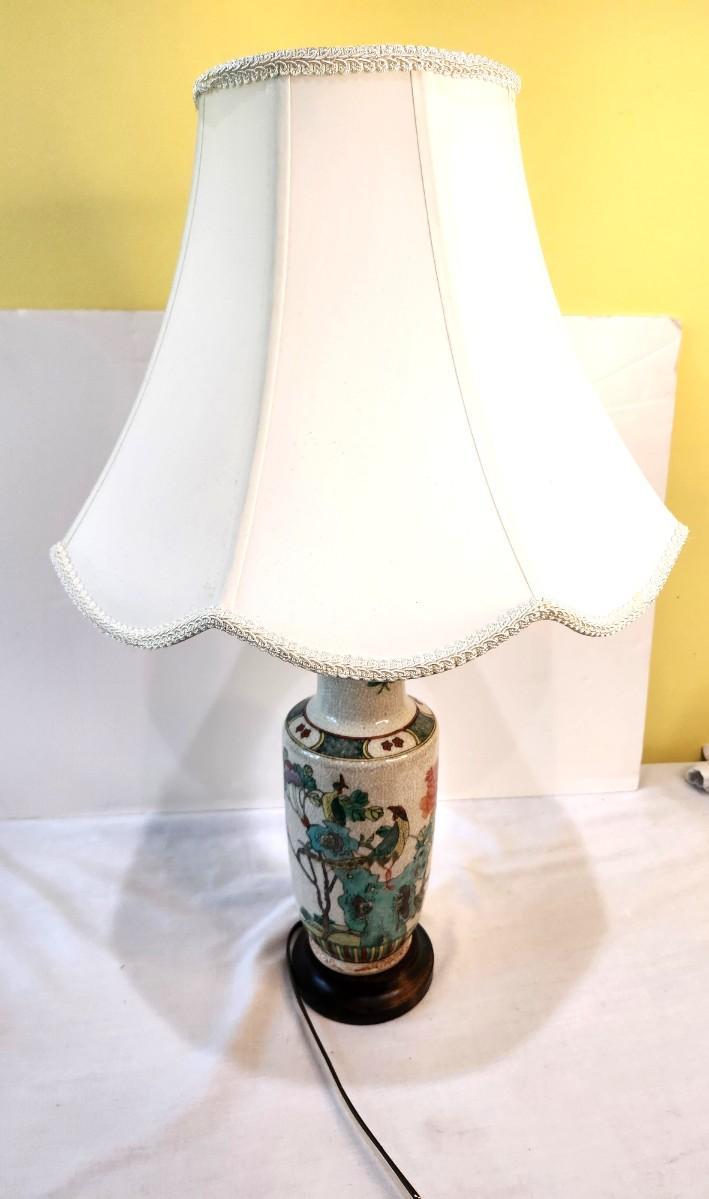 Nice table decorator table lamp - more contemporary Chinese design - stylized crazing. Good working condition - pagoda style shade. about 25" tall.