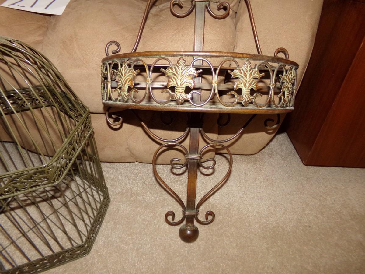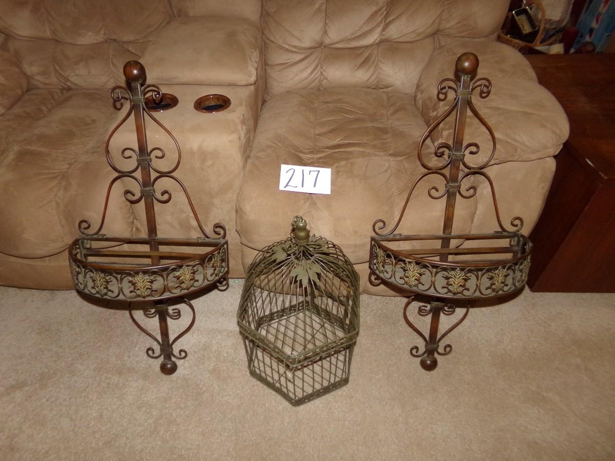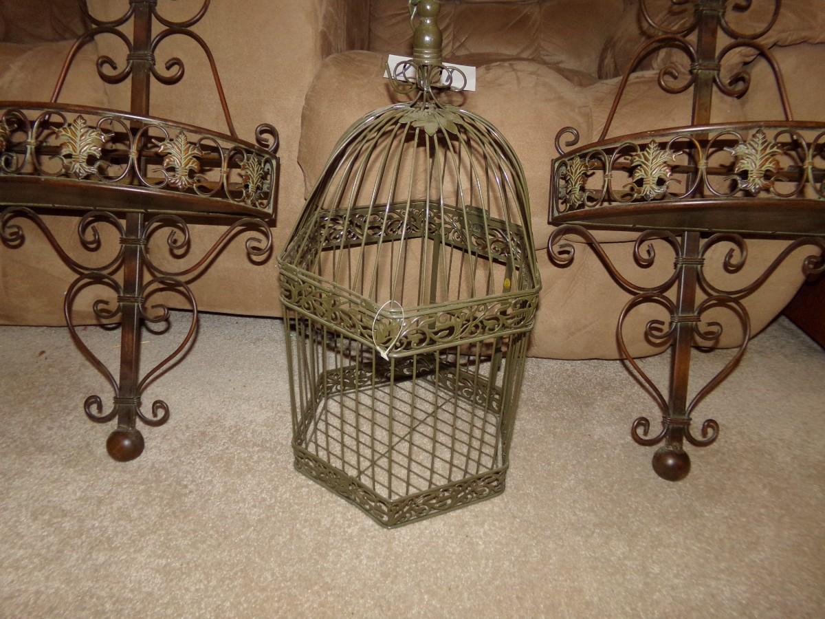 2 BRASS-COLORED WALL SCONCES. ALSO A BRASS COLORED BIRD CAGE.