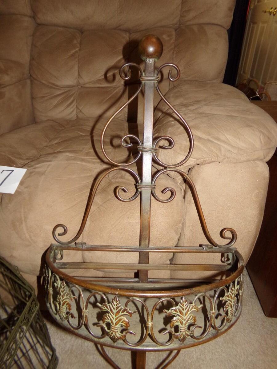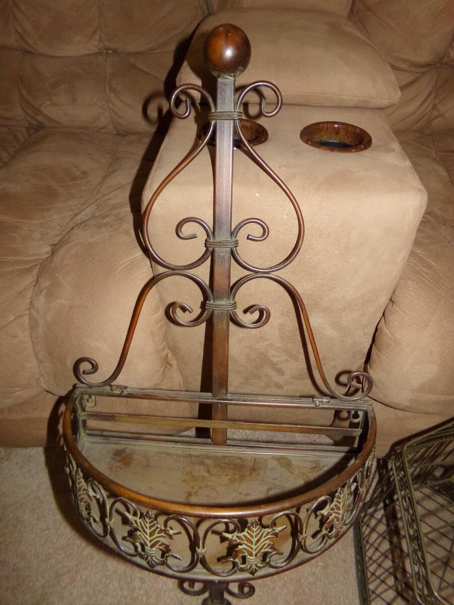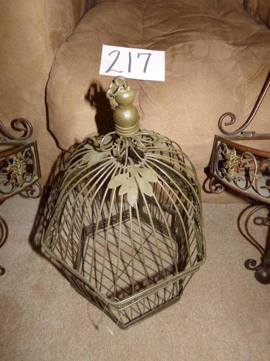 2 BRASS-COLORED WALL SCONCES. ALSO A BRASS COLORED BIRD CAGE.