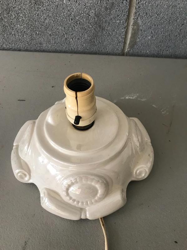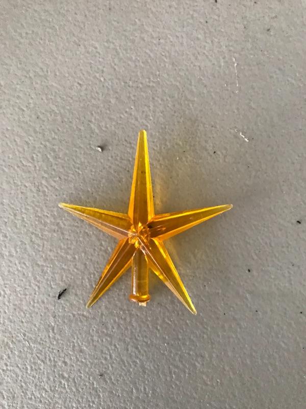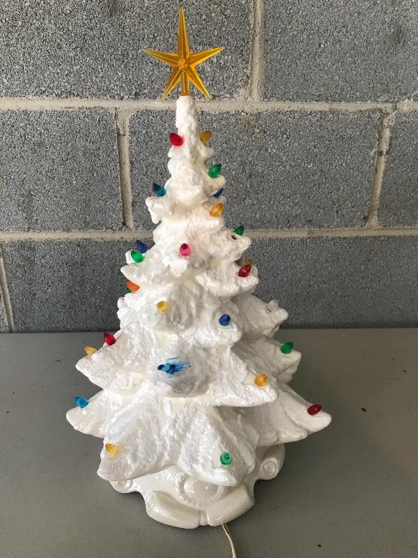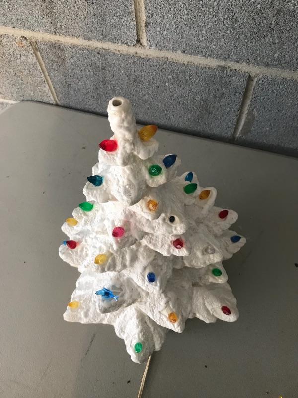 Cute light stand with iridescent pearl coloring and snow covered tree with one missing bulb. Star top has been chipped so will need support to stay on top. Entire piece stands 18” tall. Shipping available.