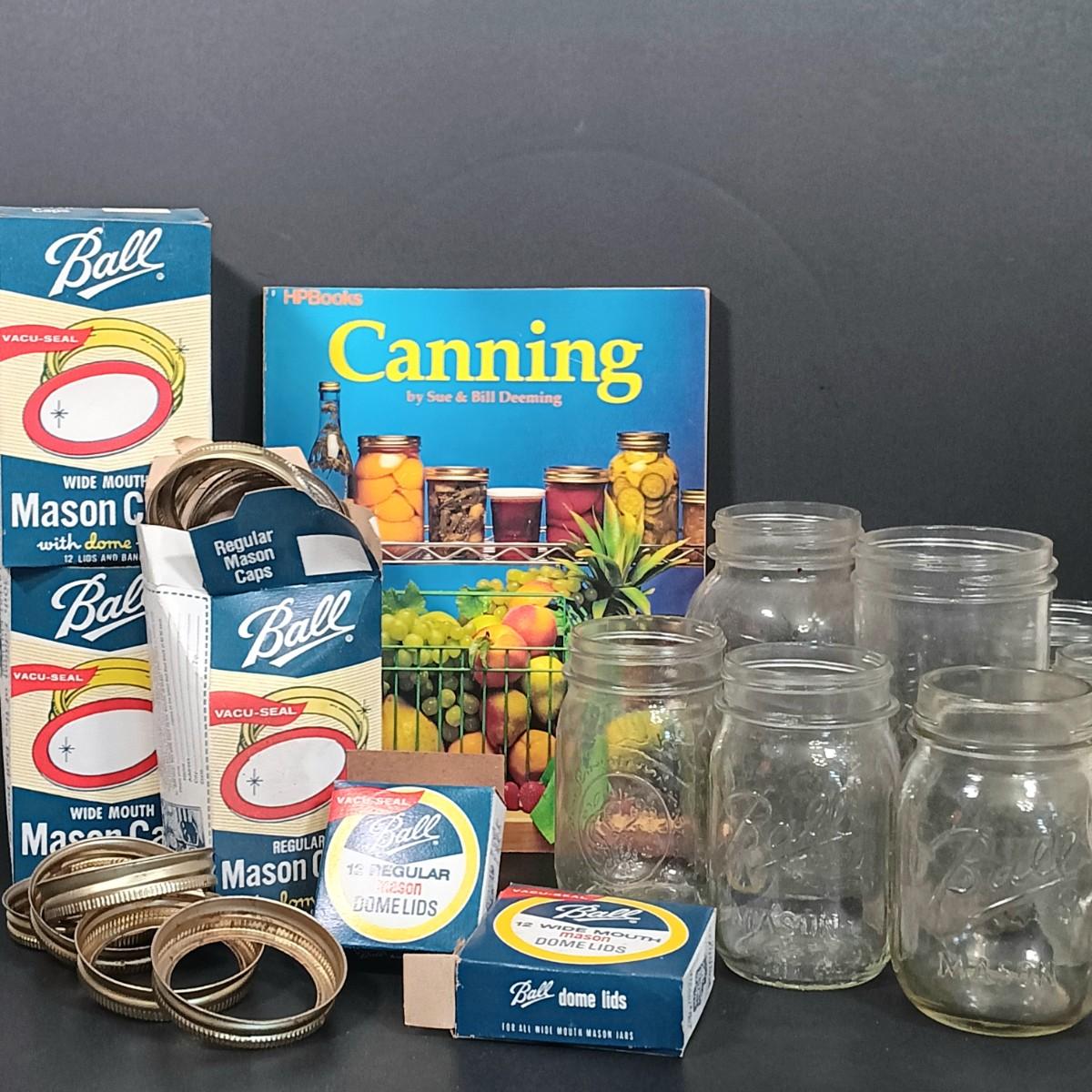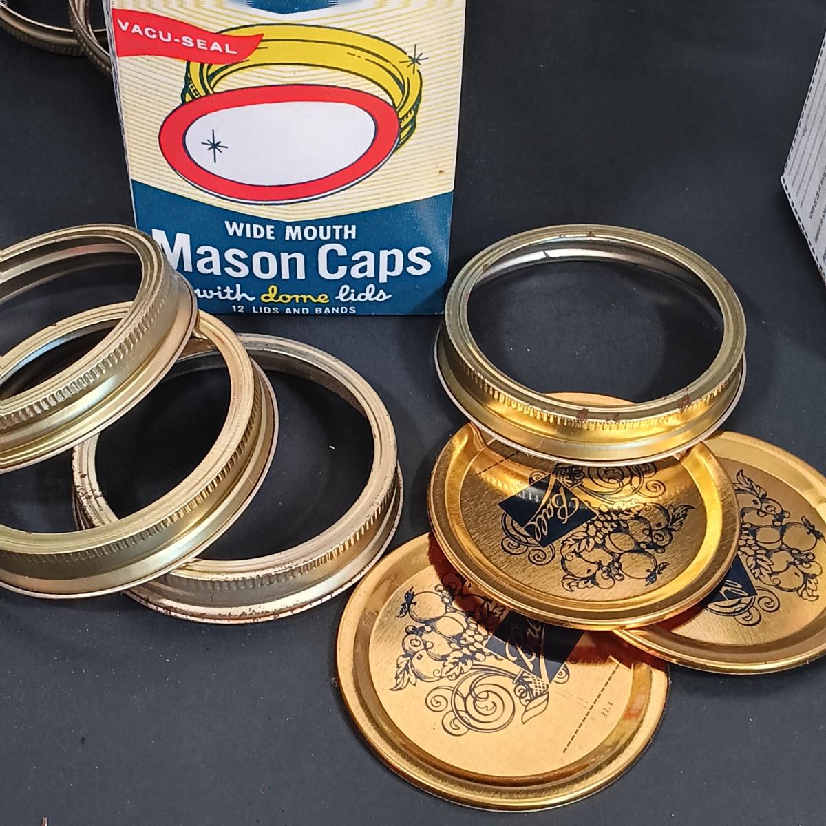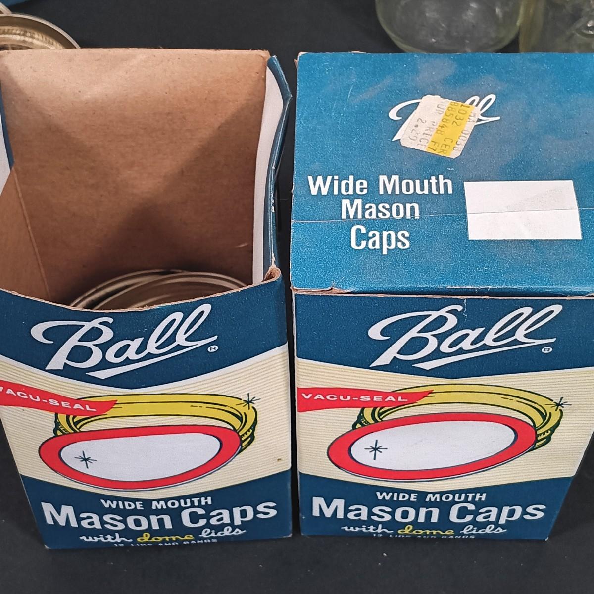 LOT 217D: Collection of Regular & Wide Mouth Mason Jars & Dome Lids, Mason Caps & More