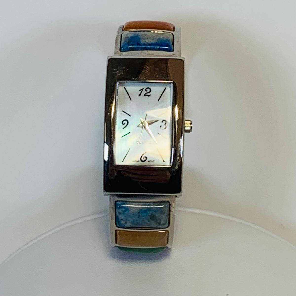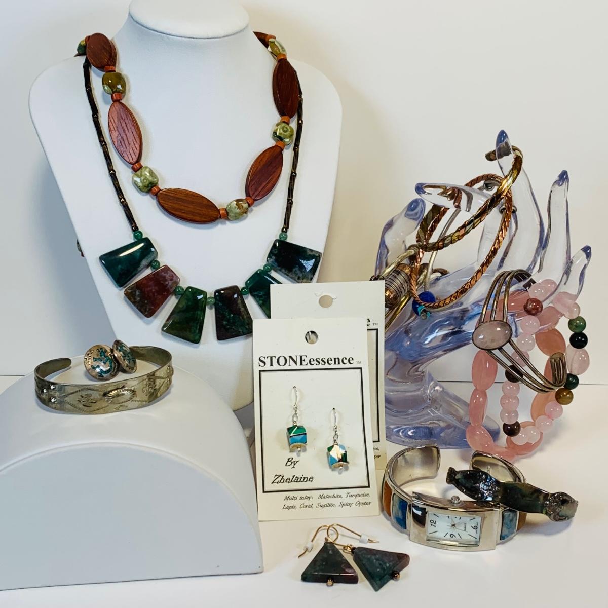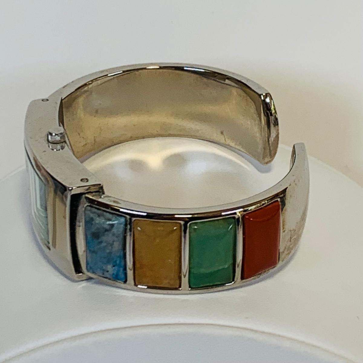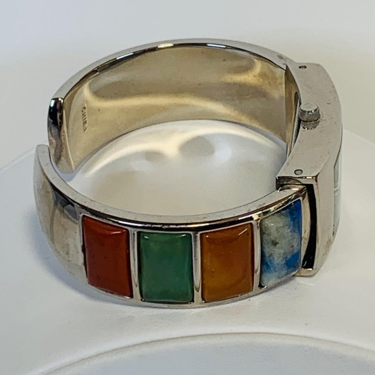 Lot 218: Fashion Jewelry Collection: Tricolor Bracelets, Nickel Silver Bracelet, Stone Essence Inlay Earrings, Watch w/Multicolored Stones & More