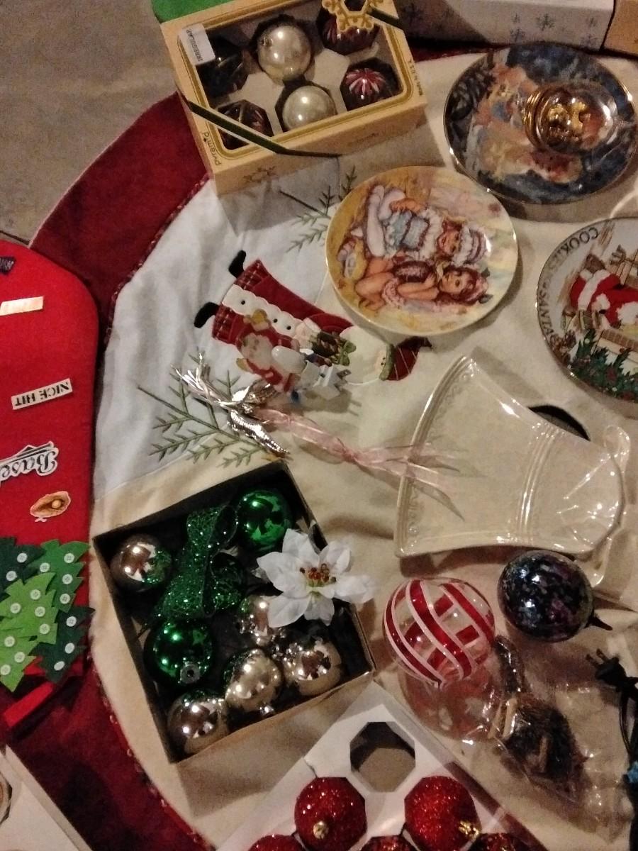 6' WHITE CHRISTMAS TREE WITH MANY DIFFERENT CHRISTMAS DECORATIONS, TREE SKIRT, ORNAMENTS, SANTA, BASKETS, DINNERWARE, STOCKINGS, AND SO MUCH MORE!