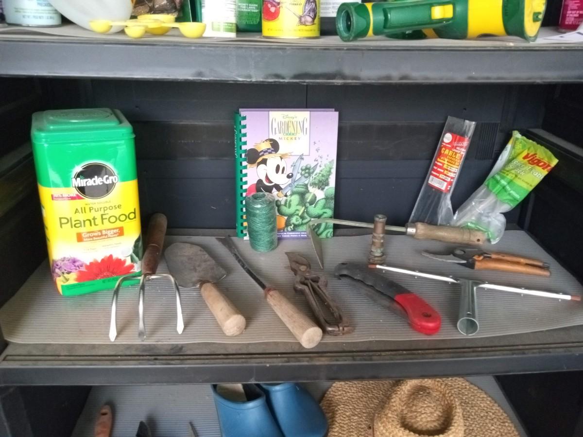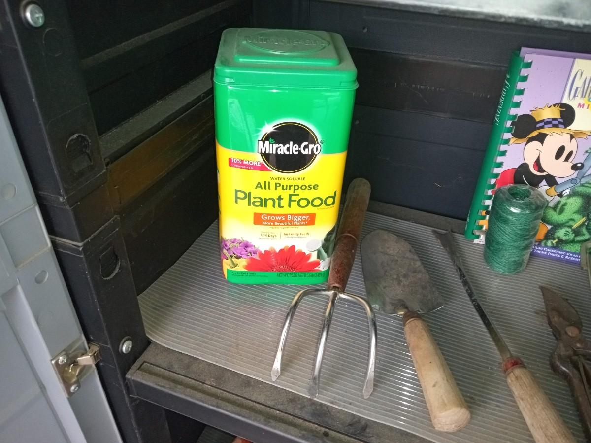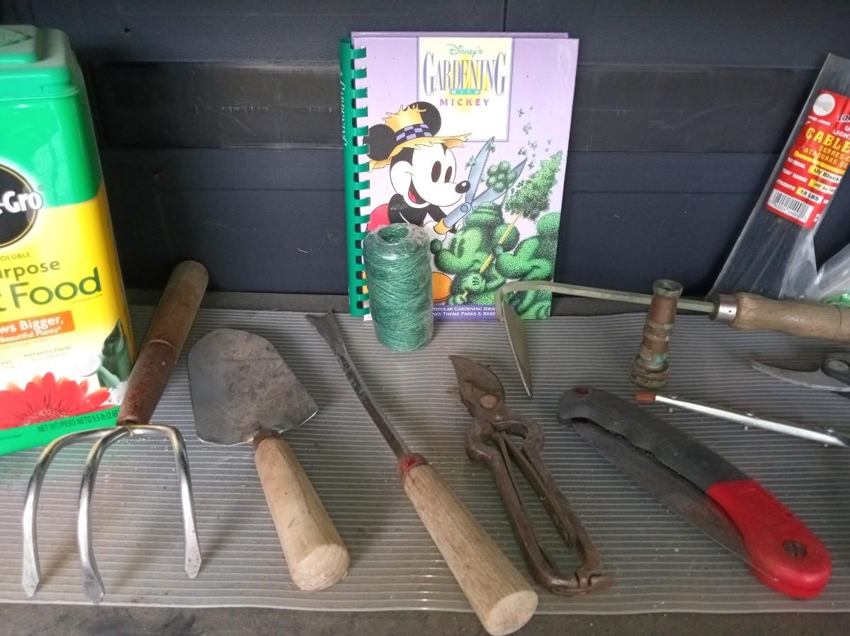 GARDENING TOOLS, BOOK AND FULL BOX OF MIRACLE GRO