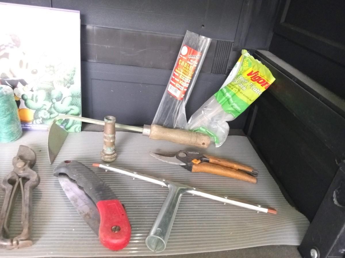 LOT 218 GARDENING TOOLS, BOOK AND FULL BOX OF MIRACLE GRO